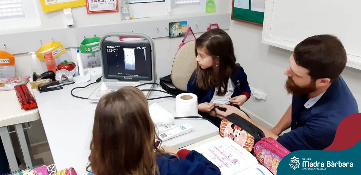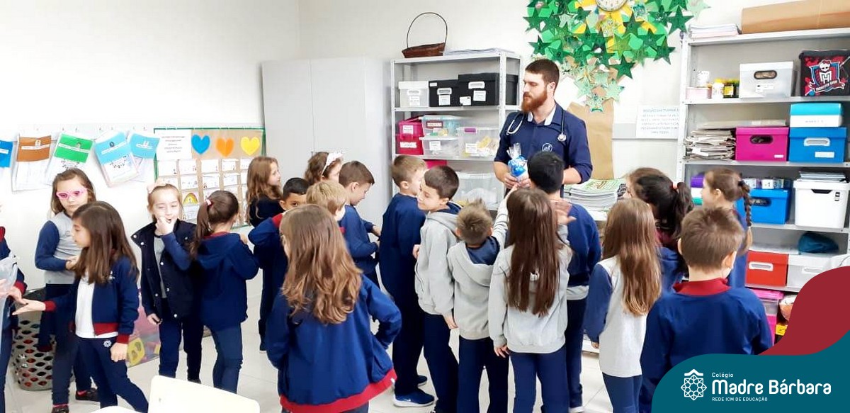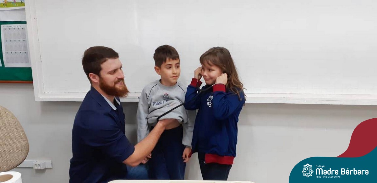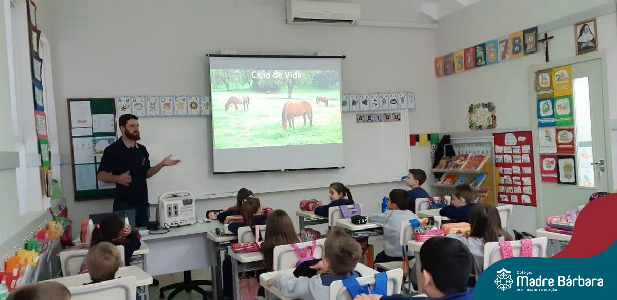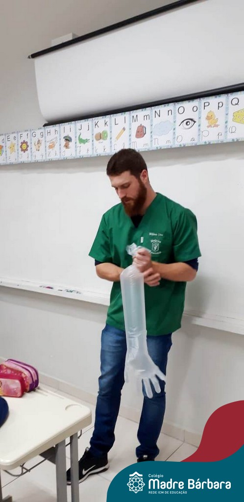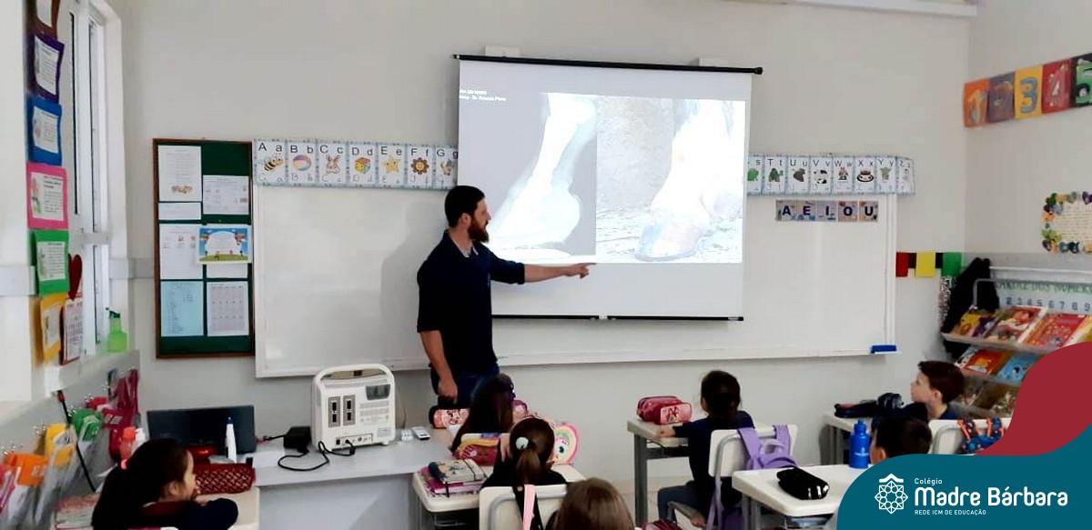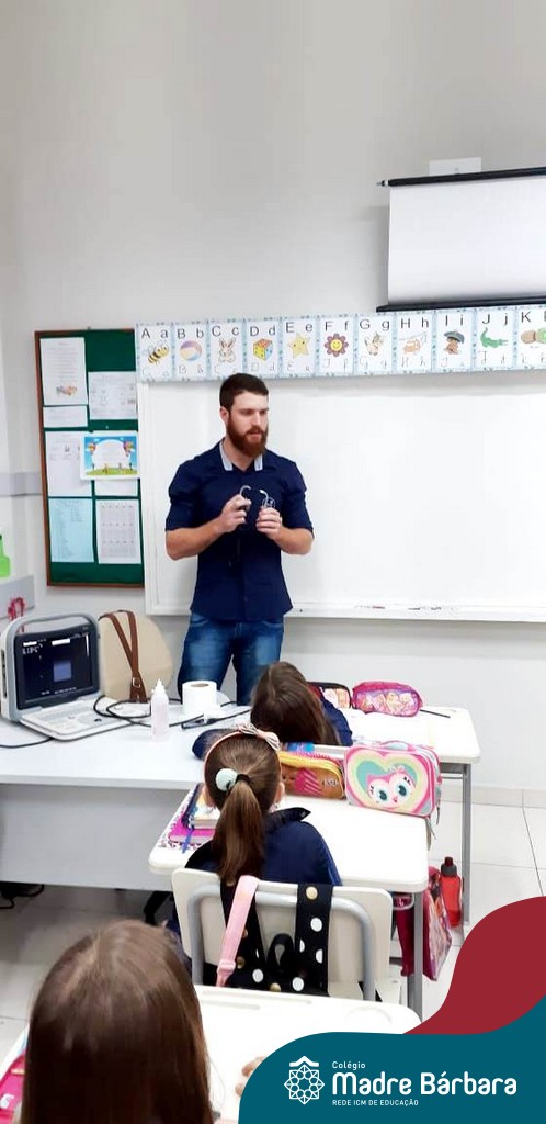 A turma 14 recebeu a visita do médico veterinário William Dörr para complementar o estudo que está sendo desenvolvido em sala de aula pela professora Caroline e Monitora Júlia. O tema da Mostra Científico-Pedagógica é “O fantástico mundo dos cavalos”, sendo que, na palestra, os alunos conversaram sobre todas as suas dúvidas do ciclo de vida e reprodução dos cavalos, alimentação, cuidados, onde vivem, para que são utilizados e alguns tipos de raças. Para tornar ainda mais significativo, os alunos foram convidados a observar e manipular alguns materiais utilizados no trabalho do veterinário William, como o Ultrassom, onde puderam ver o coração de alguns colegas ao vivo no aparelho e o estetoscópio, onde cada um escutou o coração do seu colega.