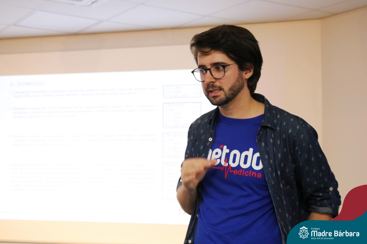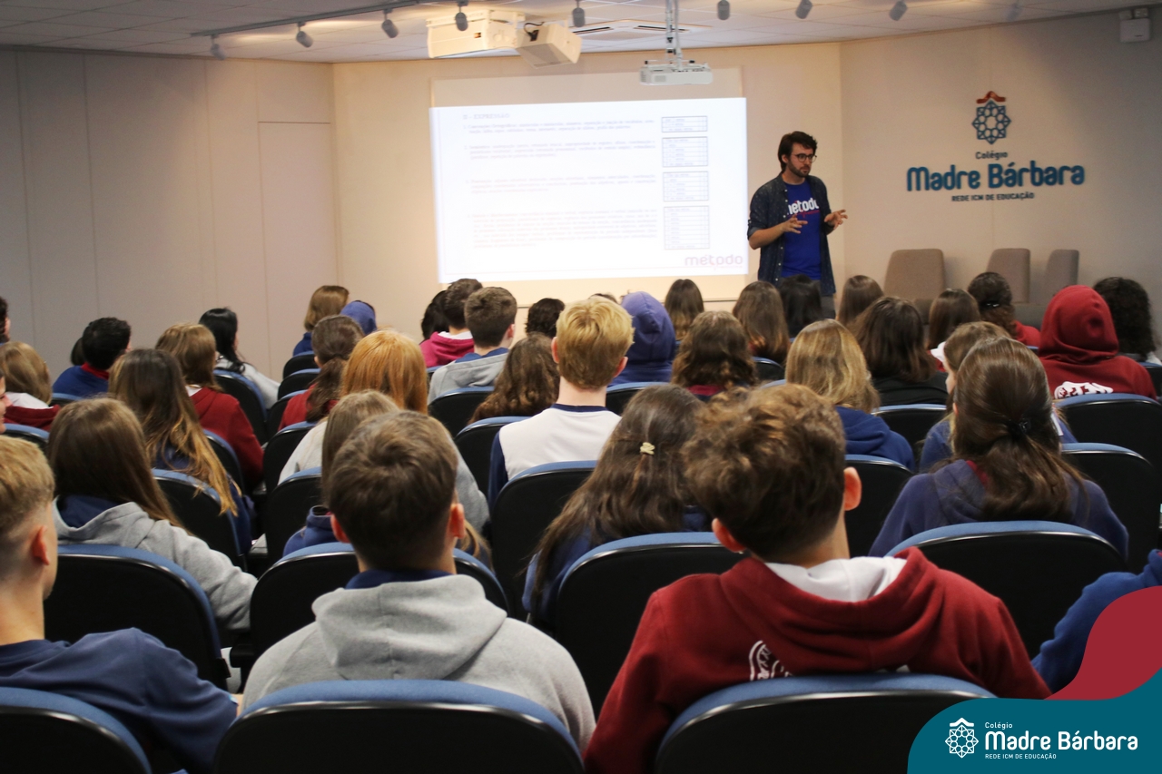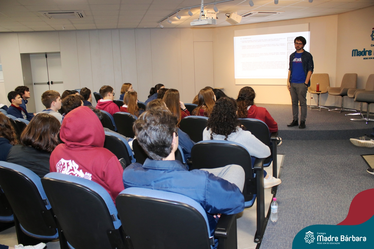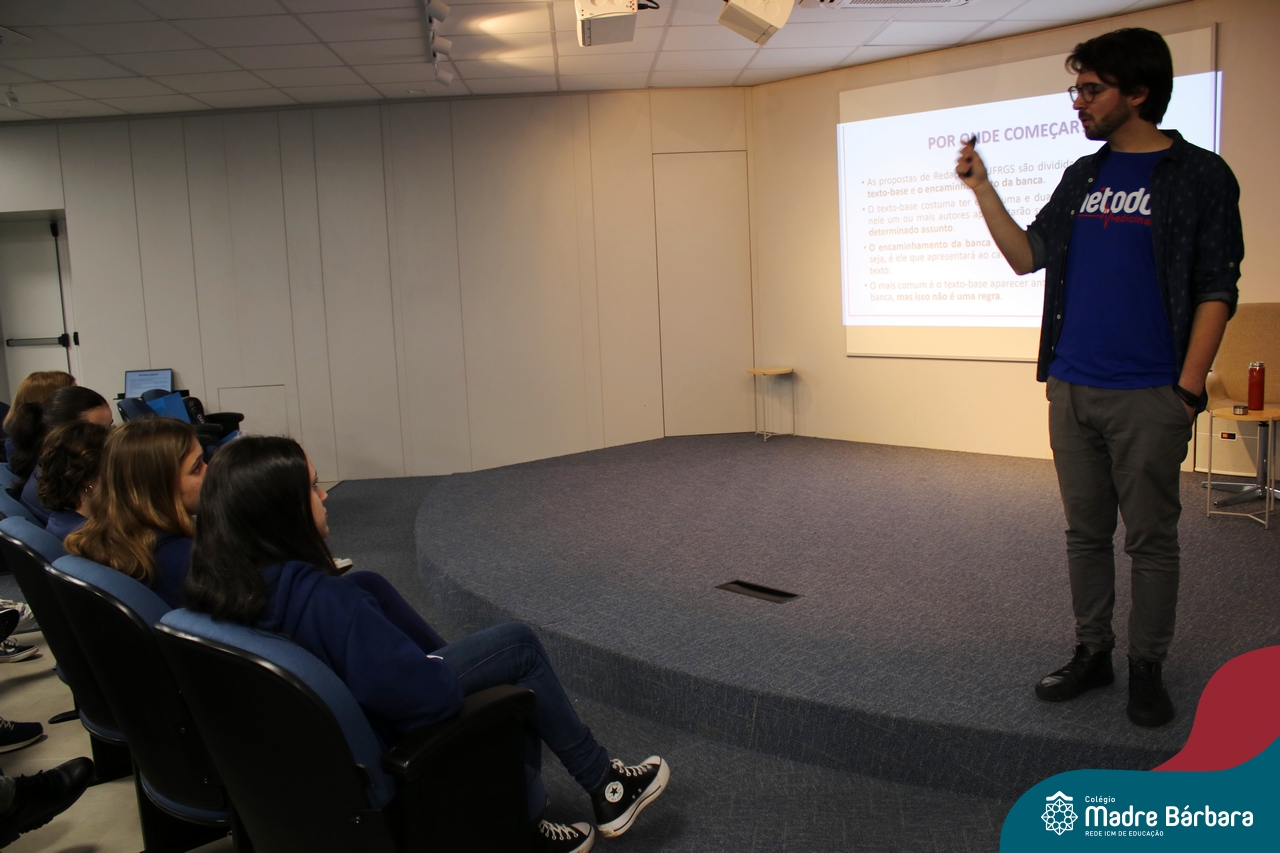 Na tarde desta quarta-feira (13.09), estudantes dos 2ºs e 3ºs anos do Ensino Médio participaram de palestra com o professor de redação do curso pré-vestibular Método Medicina, Filipe Vuaden, sobre como se preparar para a Redação da UFRGS. Durante a conversa, comentou sobre o gênero textual solicitado pela instituição, formas de avaliação, análise de propostas de anos anteriores e análise de textos de alunos.