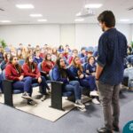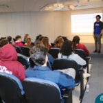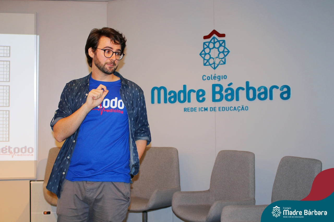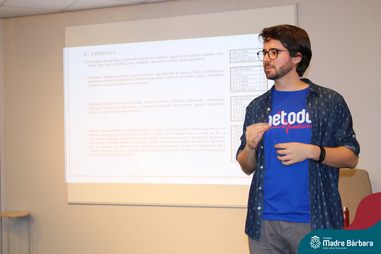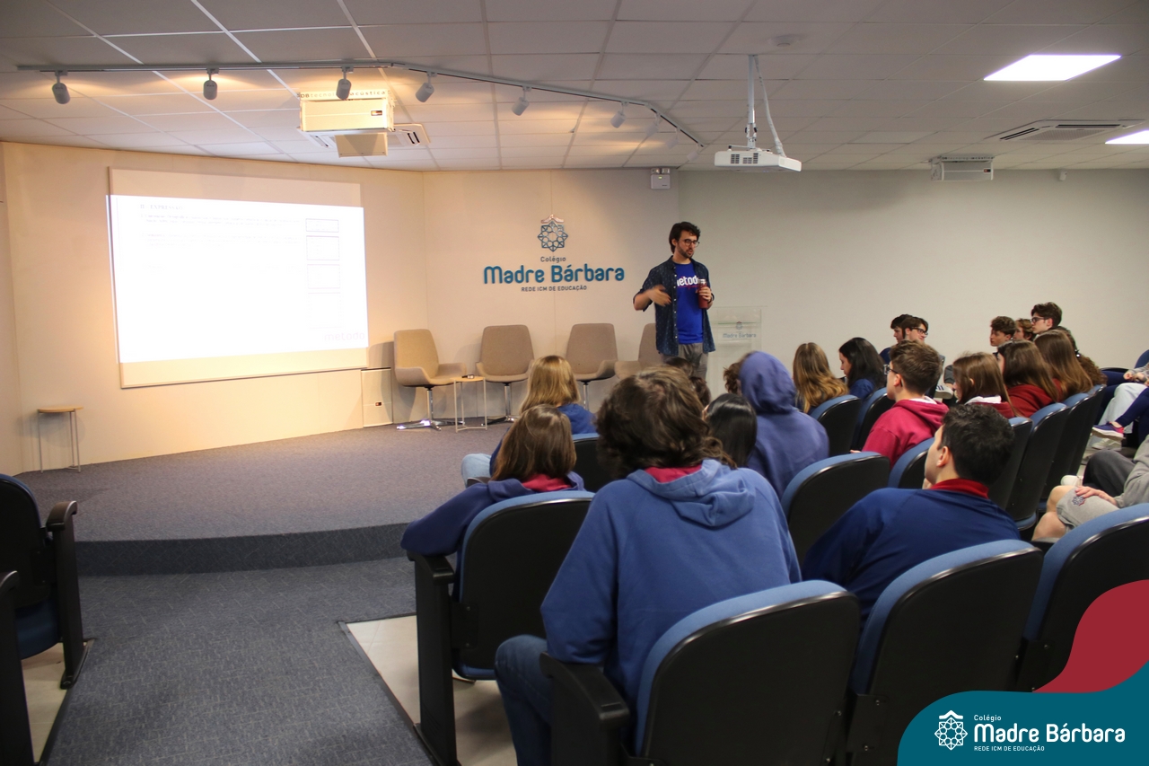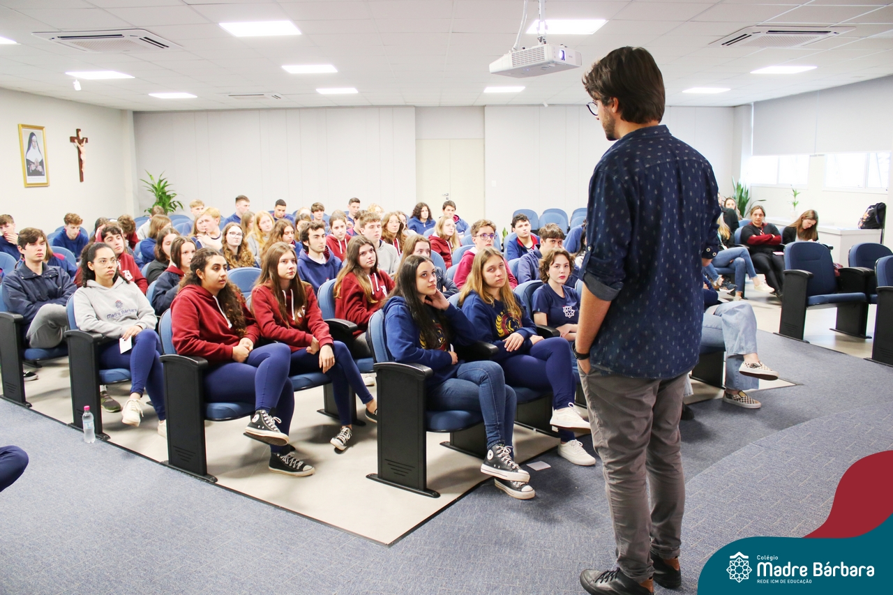 Na tarde desta quarta-feira (13.09), estudantes dos 2ºs e 3ºs anos do Ensino Médio participaram de palestra com o professor de redação do curso pré-vestibular Método Medicina, Filipe Vuaden, sobre como se preparar para a Redação da UFRGS. Durante a conversa, comentou sobre o gênero textual solicitado pela instituição, formas de avaliação, análise de propostas de anos anteriores e análise de textos de alunos.