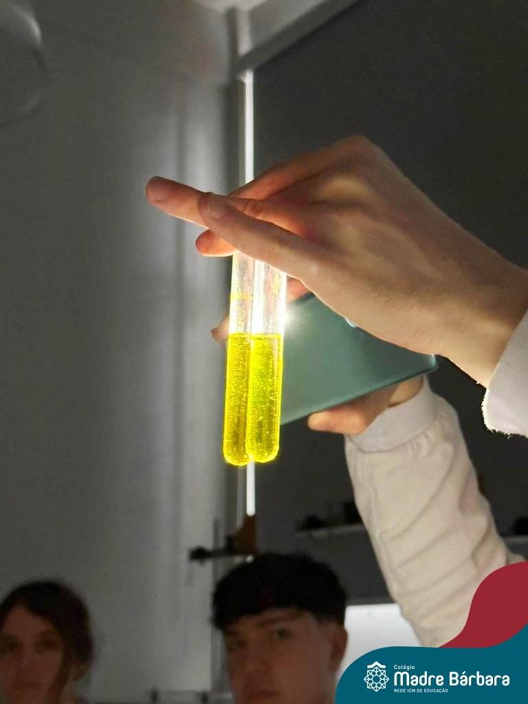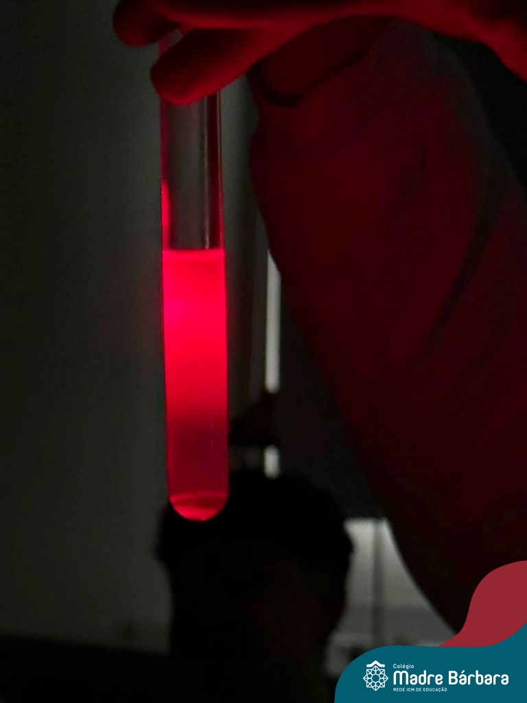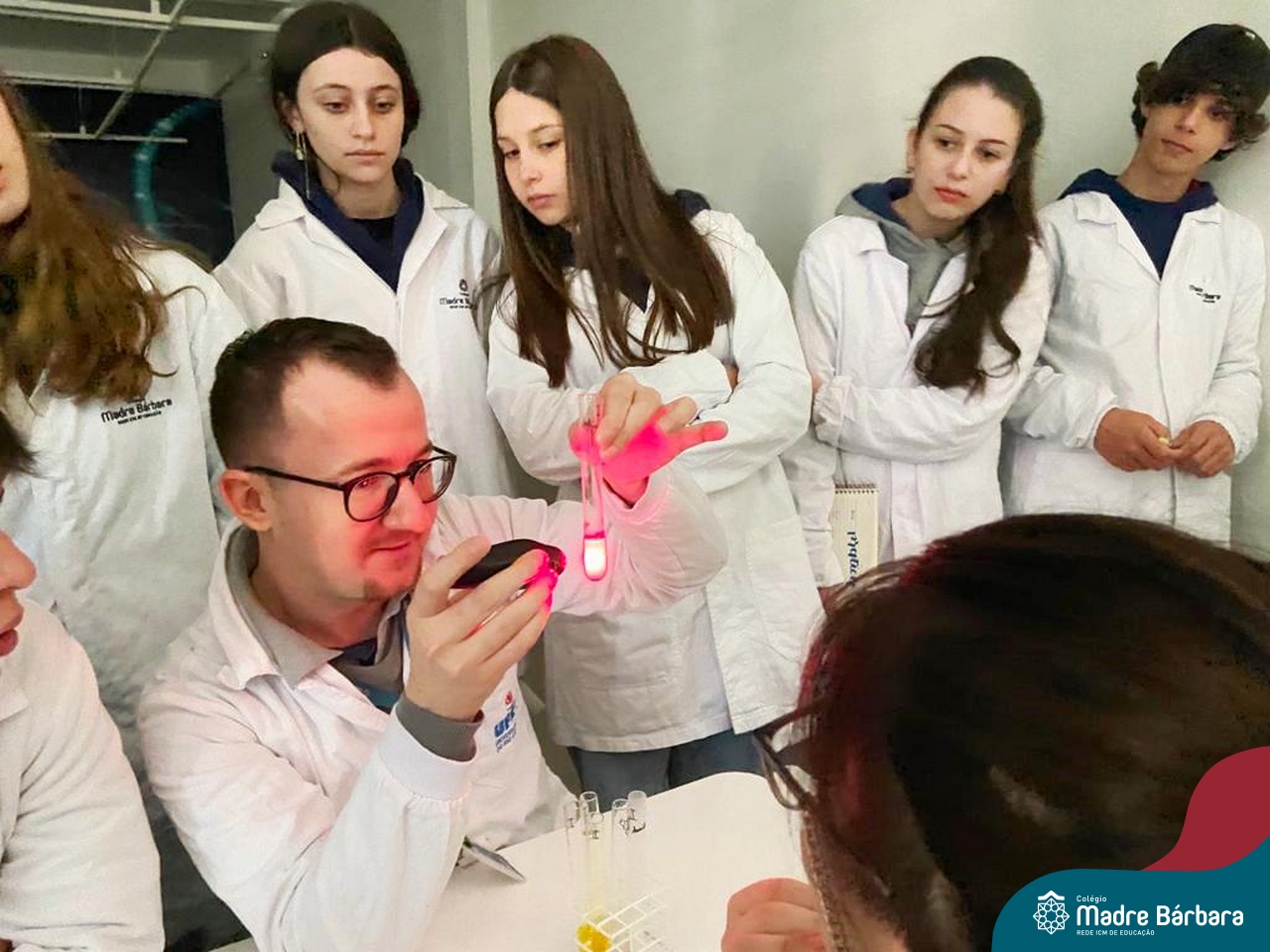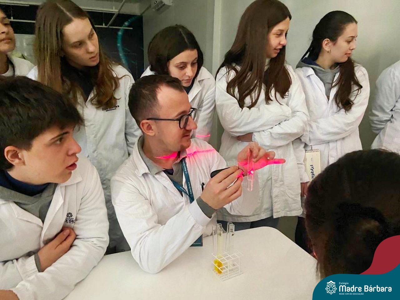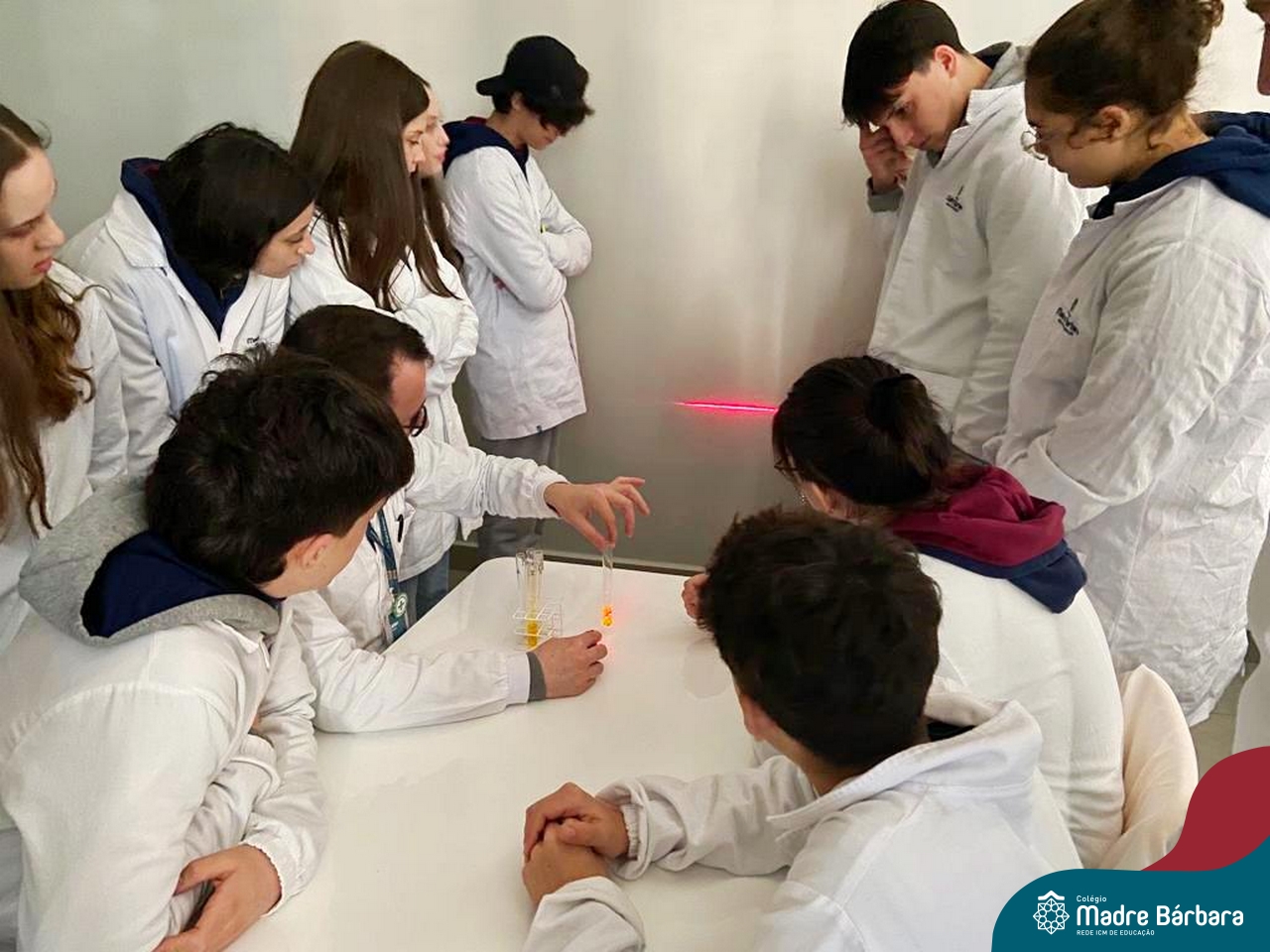 Os estudantes das turmas da 1ª série do Novo Ensino Médio responderam a questão simulando esse fenômeno natural, sob o ponto de vista físico-químico do espalhamento de luz, no Laboratório de Ciências da Natureza do Colégio. A proposta compõe uma série de aulas práticas do componente do Núcleo de Estudos em Química e é coordenada pelo professor Aliar Anacleto Jung.