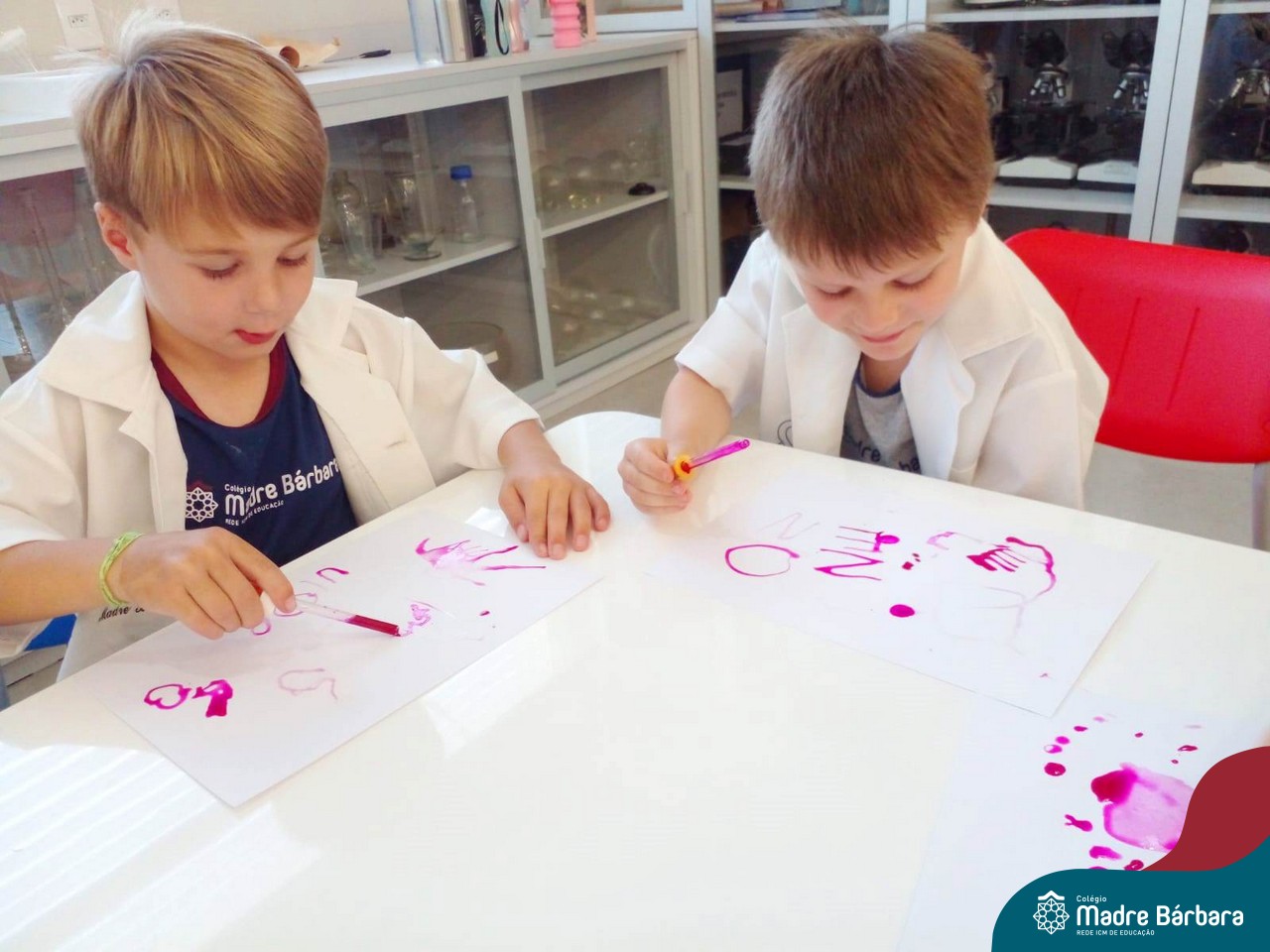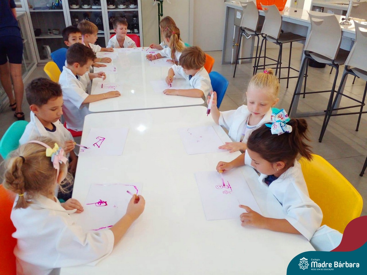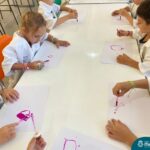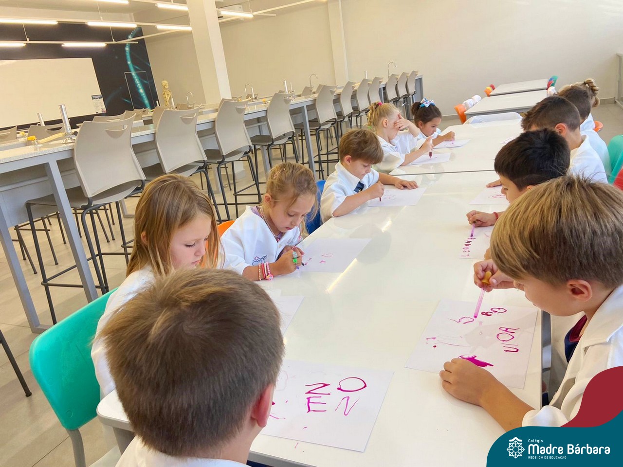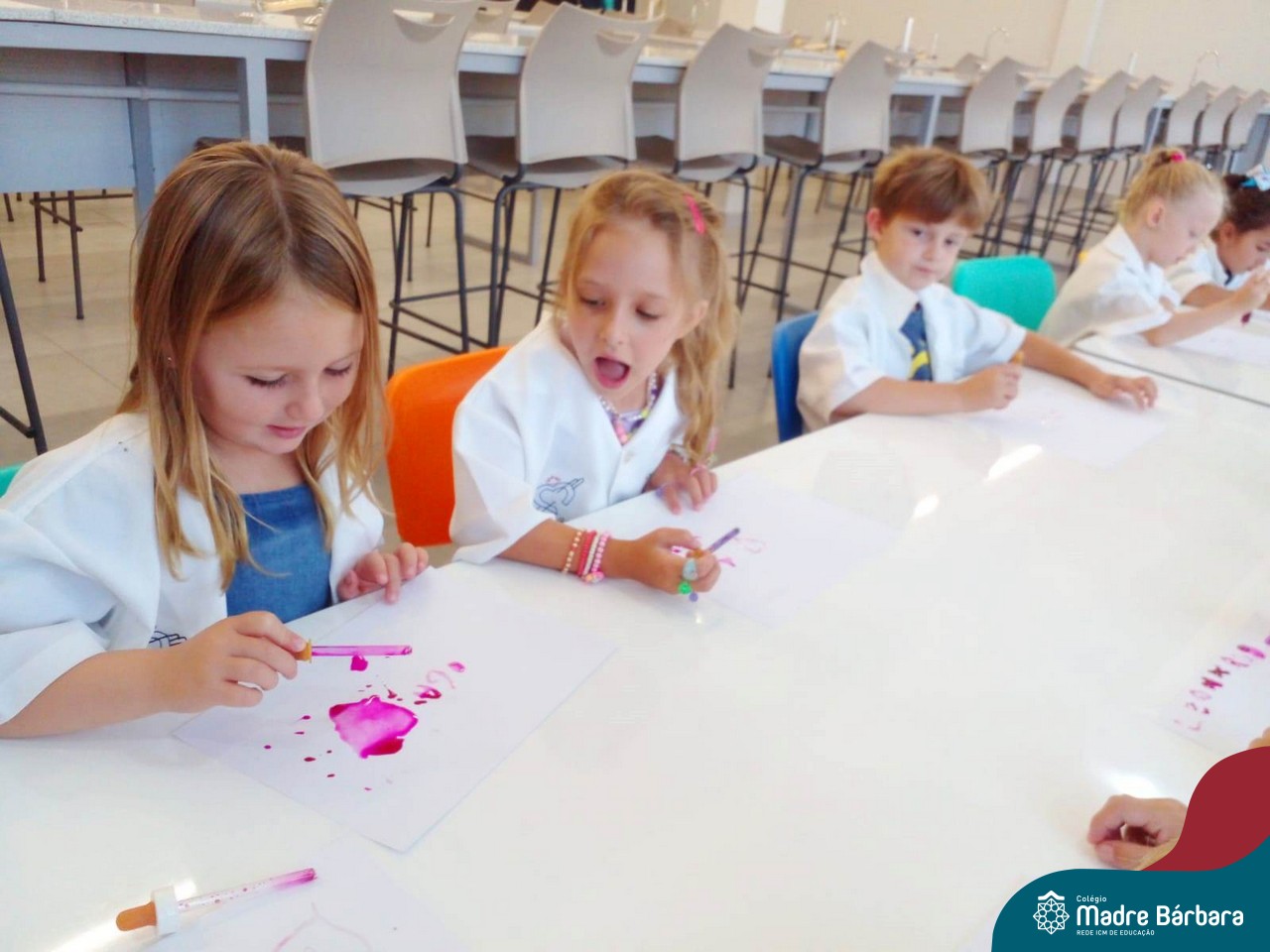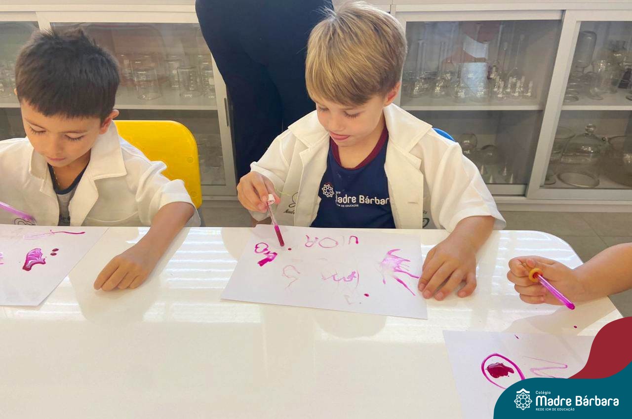 Nesta quarta-feira (8.02), o Nível 5 do Turno Extracurricular, juntamente com suas professoras Iasmine e Heloísa, realizaram a atividade ”Tinta Invisível” no Laboratório de Ciências. Observando os produtos usados para obter o líquido, as crianças ficaram surpresas em descobrir que a tinta desaparecia após secar em contato com a pele e até mesmo registrando na folha.