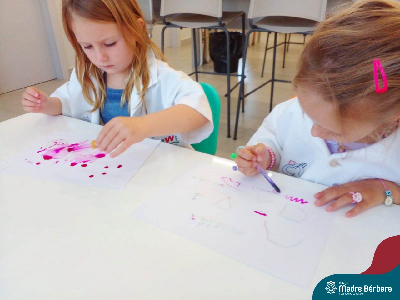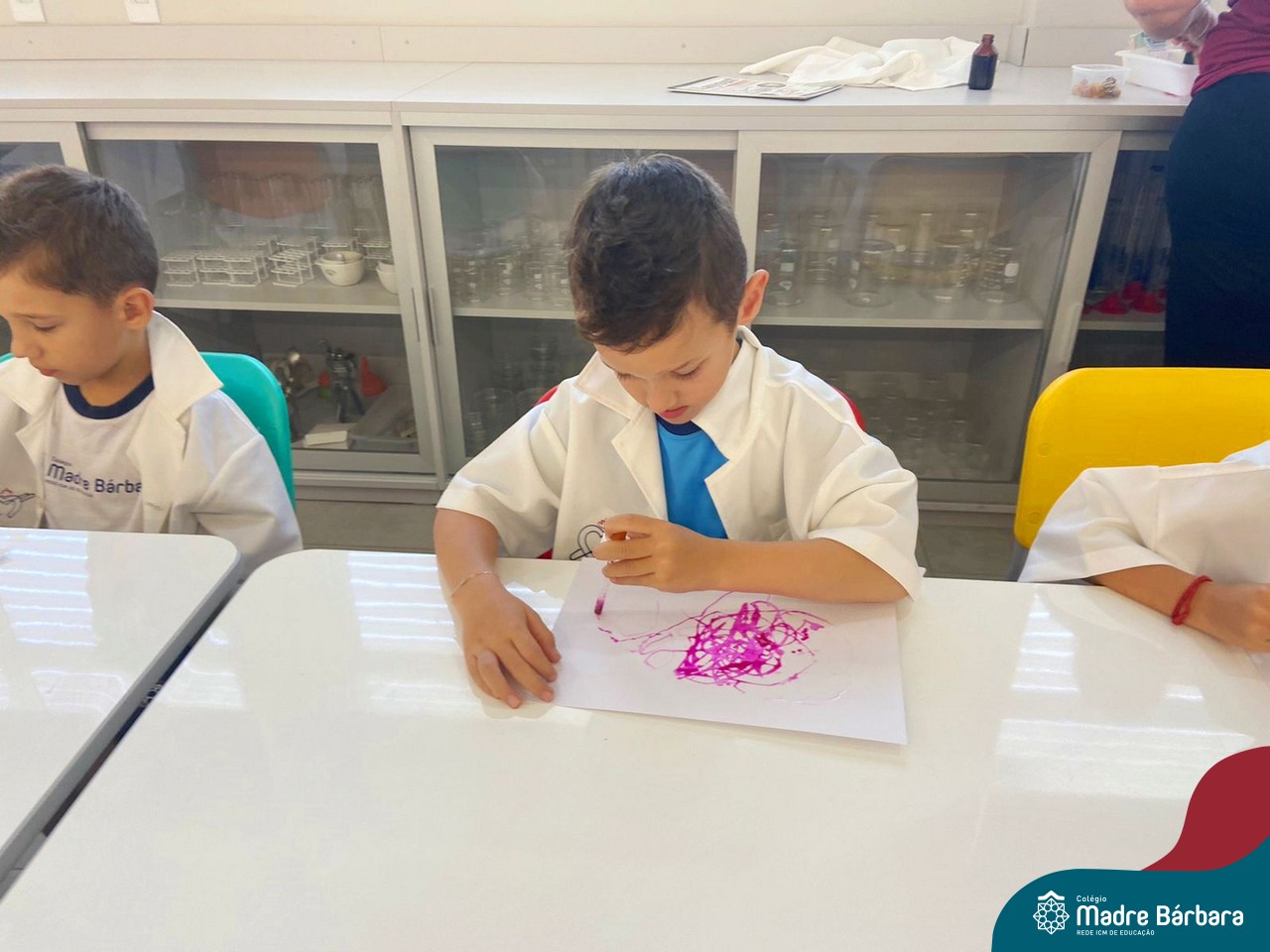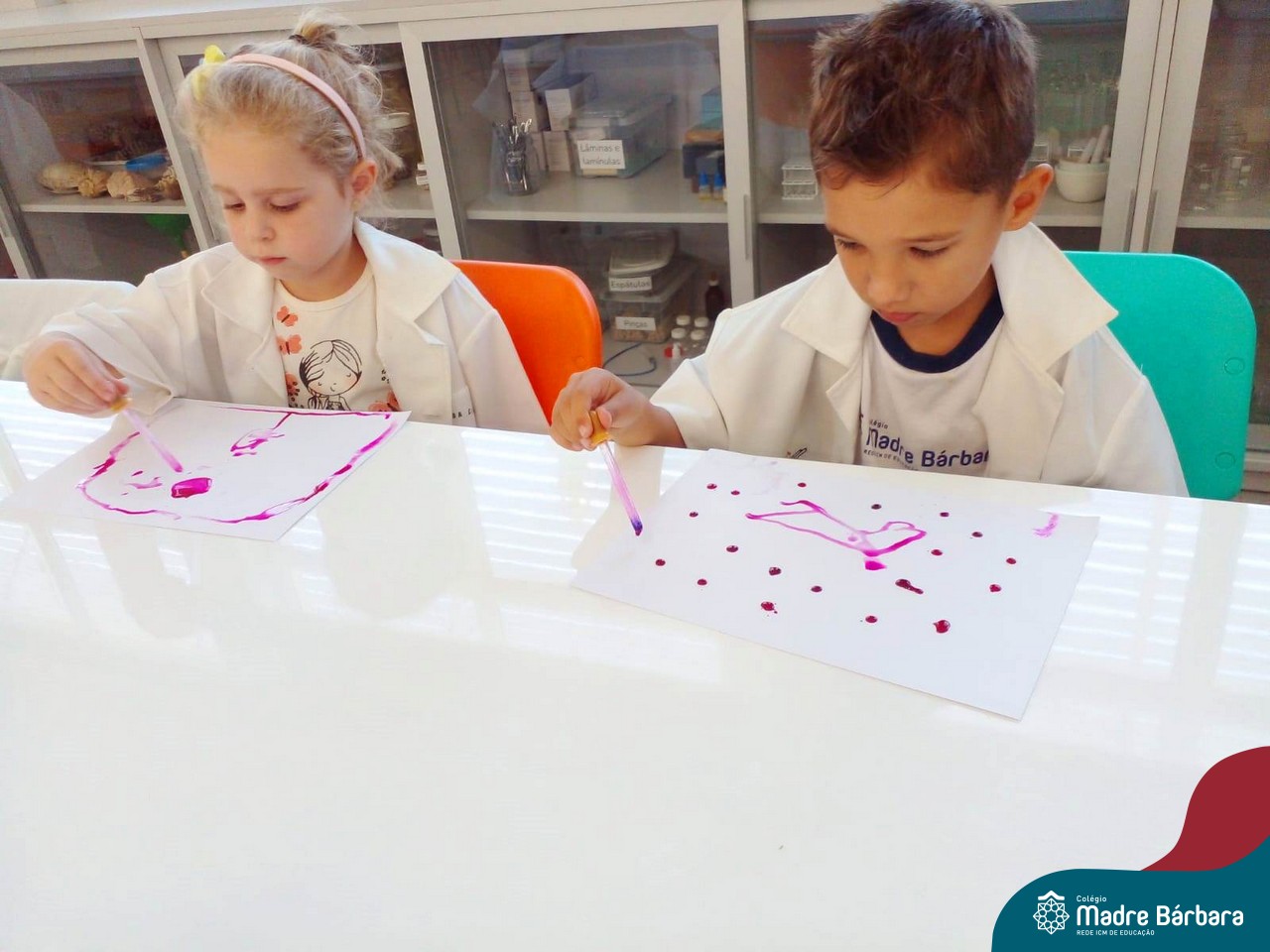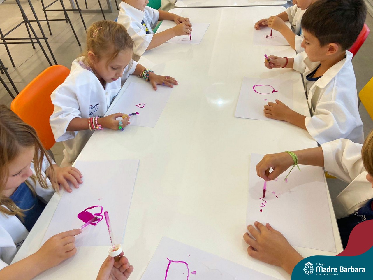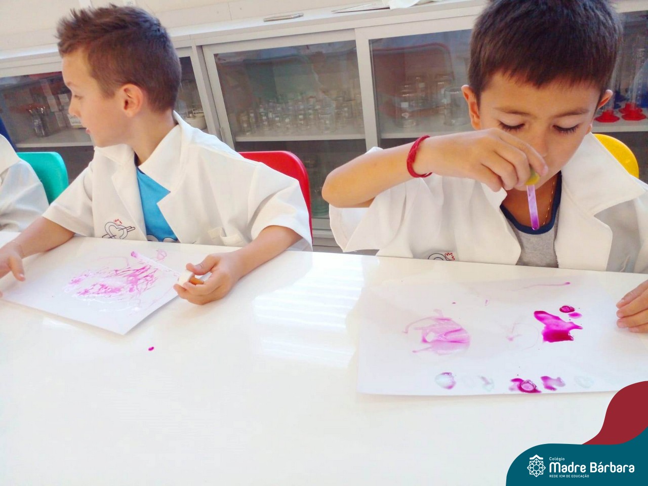 Nesta quarta-feira (8.02), o Nível 5 do Turno Extracurricular, juntamente com suas professoras Iasmine e Heloísa, realizaram a atividade ”Tinta Invisível” no Laboratório de Ciências. Observando os produtos usados para obter o líquido, as crianças ficaram surpresas em descobrir que a tinta desaparecia após secar em contato com a pele e até mesmo registrando na folha.