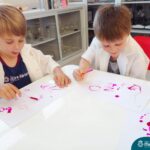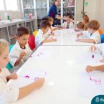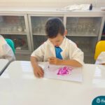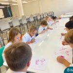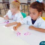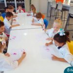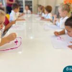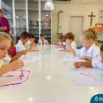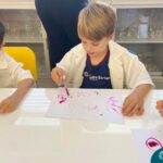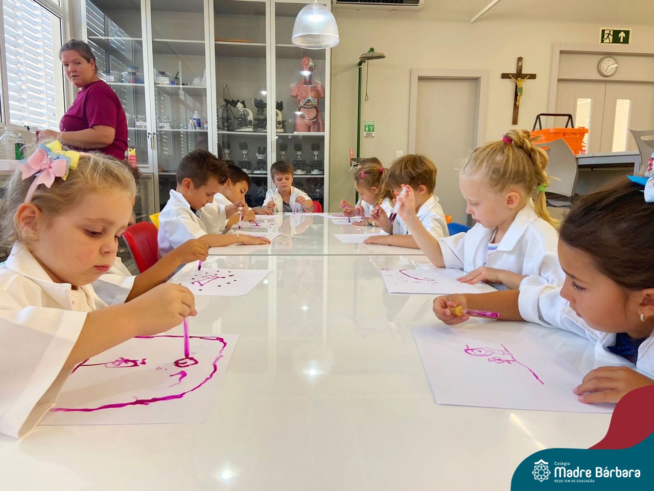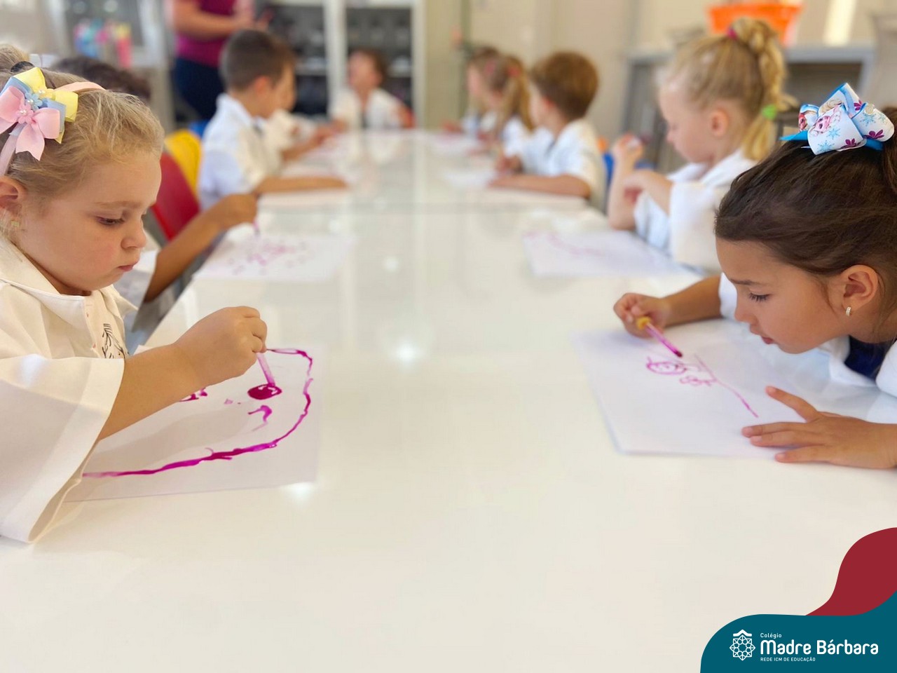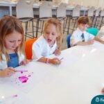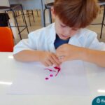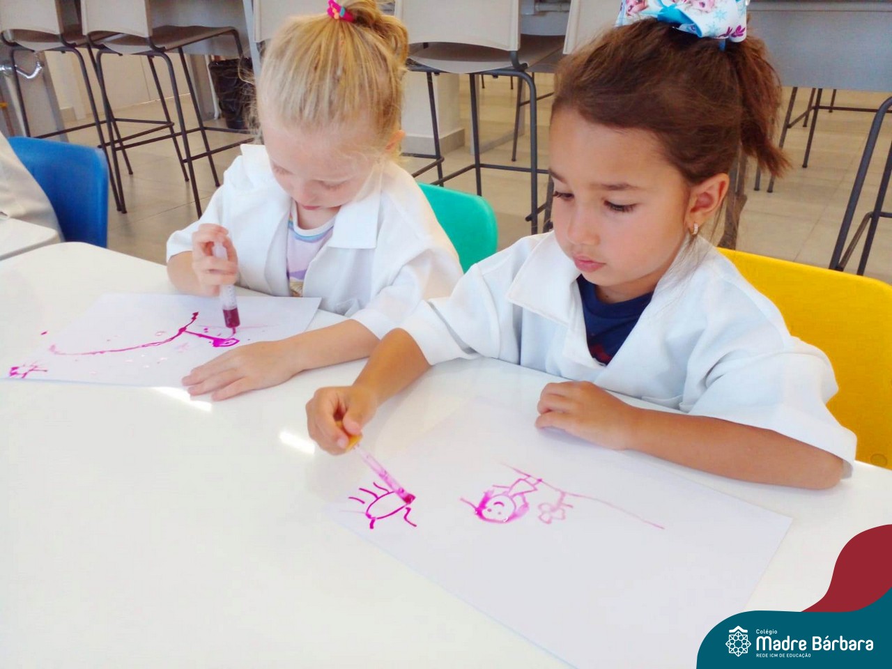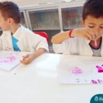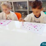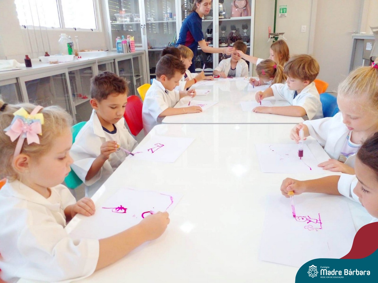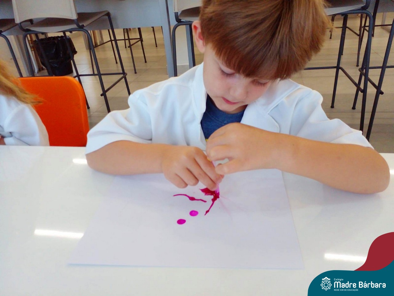 Nesta quarta-feira (8.02), o Nível 5 do Turno Extracurricular, juntamente com suas professoras Iasmine e Heloísa, realizaram a atividade ”Tinta Invisível” no Laboratório de Ciências. Observando os produtos usados para obter o líquido, as crianças ficaram surpresas em descobrir que a tinta desaparecia após secar em contato com a pele e até mesmo registrando na folha.
