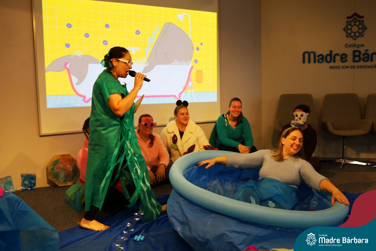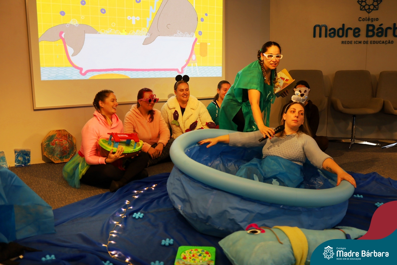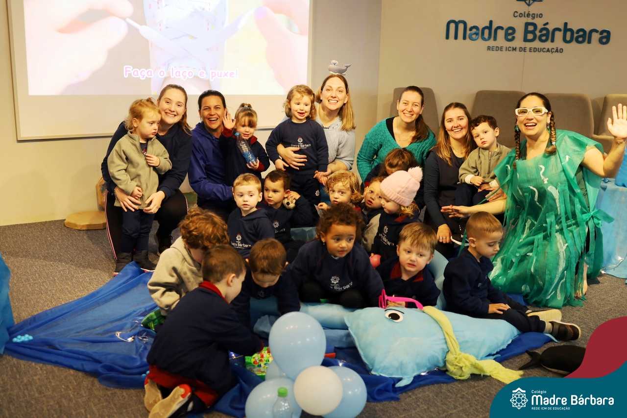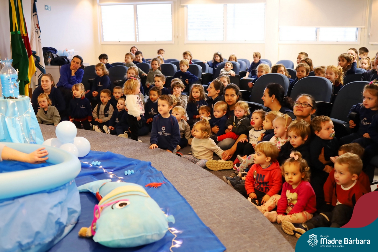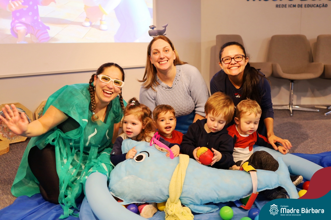 Hoje (17.07) pela manhã as turmas da Educação Infantil do Colégio Madre Bárbara assistiram o teatro que envolveu a história “A Baleia na Banheira”, da autora Susane Straber. A história foi dramatizada por um grupo de professoras e encantou às crianças.
