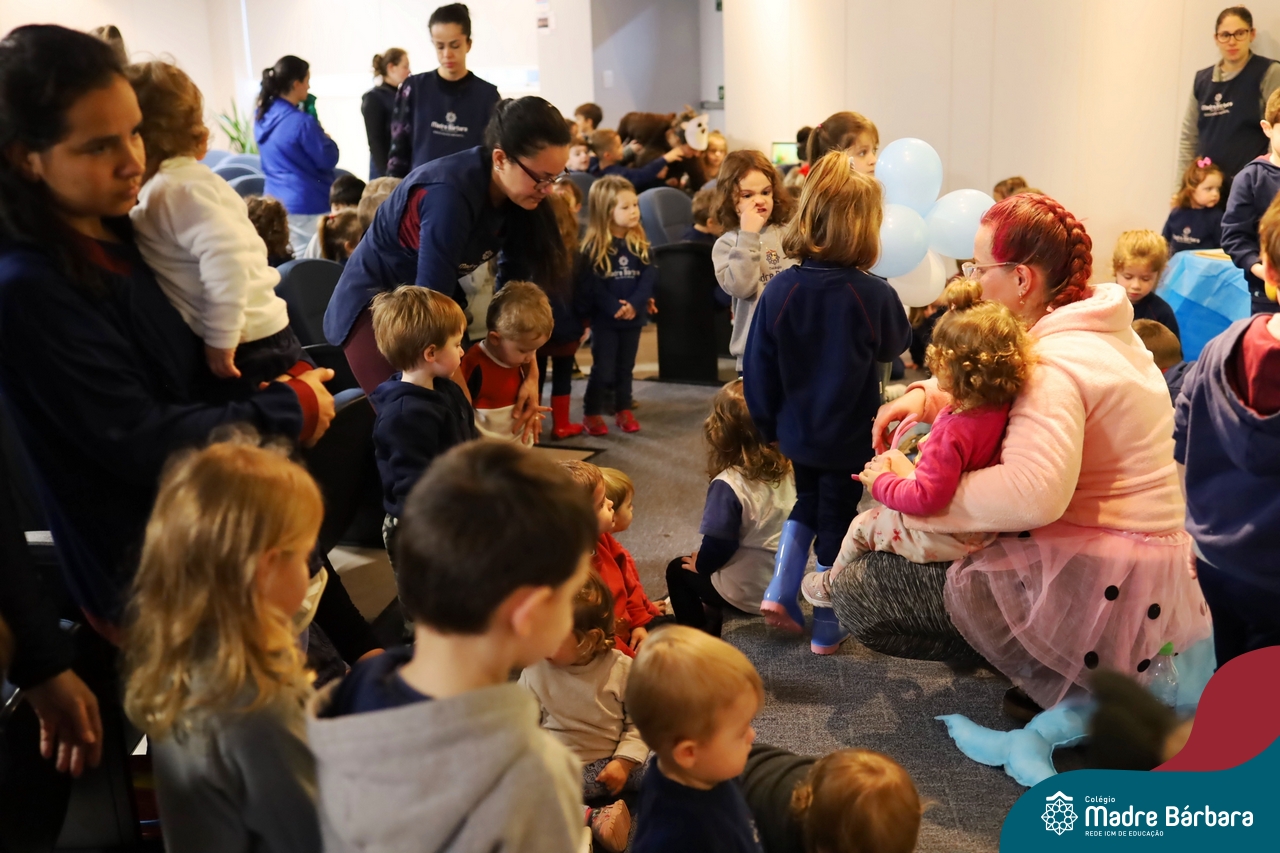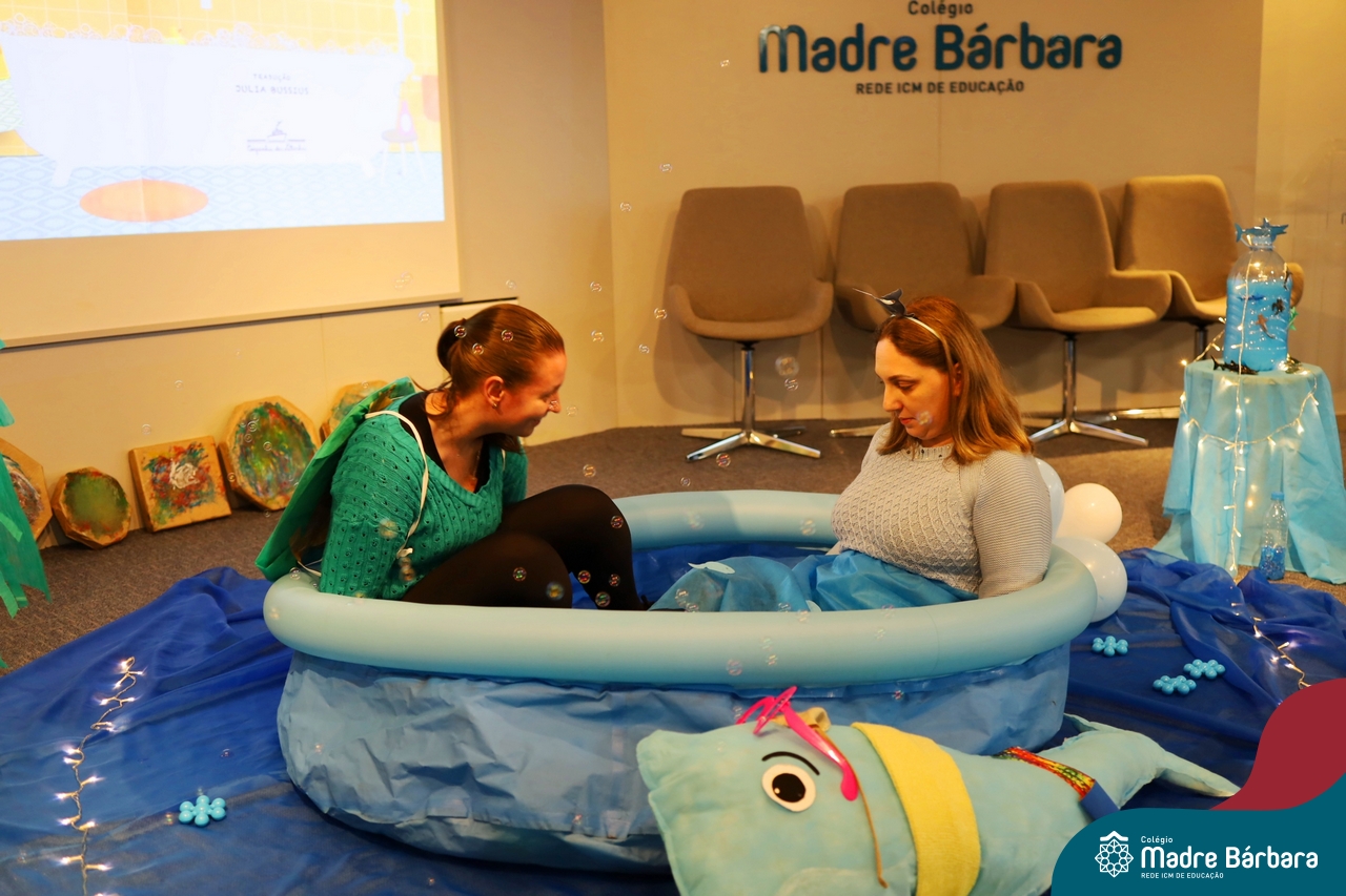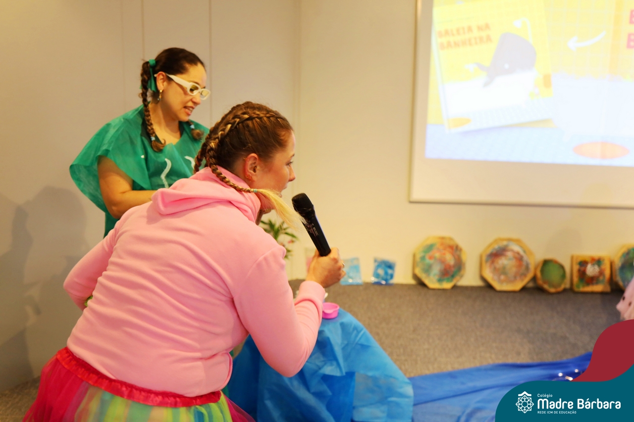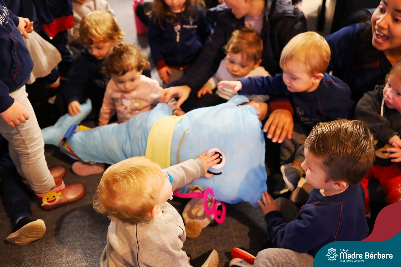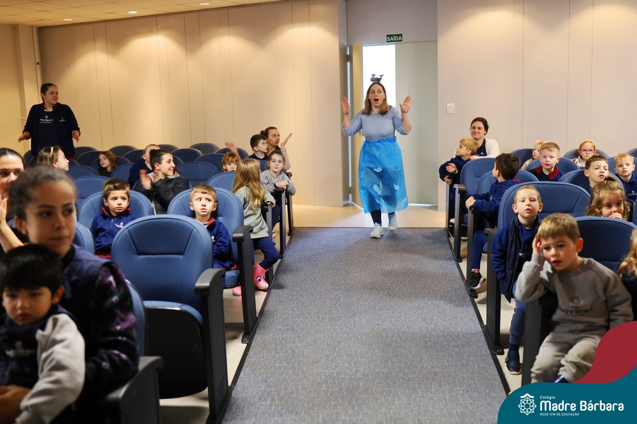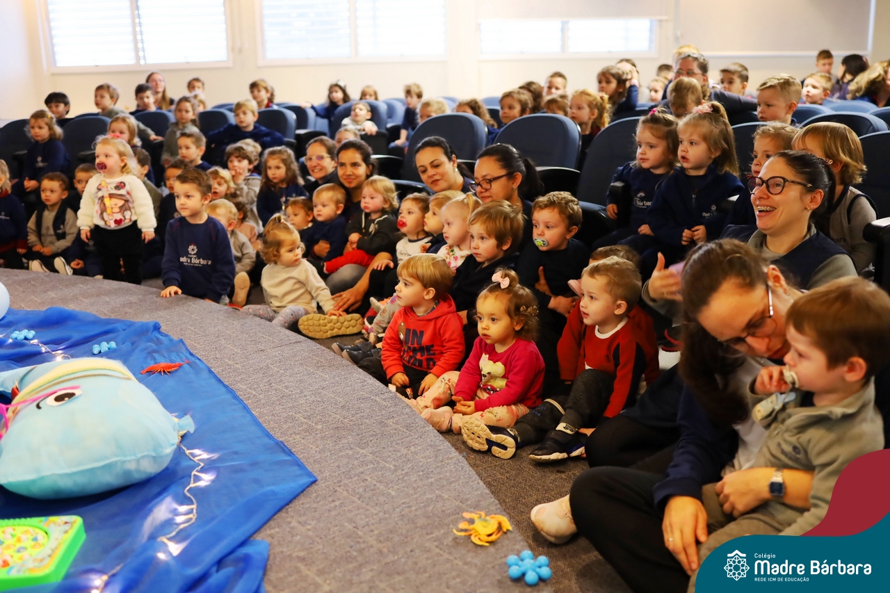 Hoje (17.07) pela manhã as turmas da Educação Infantil do Colégio Madre Bárbara assistiram o teatro que envolveu a história “A Baleia na Banheira”, da autora Susane Straber. A história foi dramatizada por um grupo de professoras e encantou às crianças.