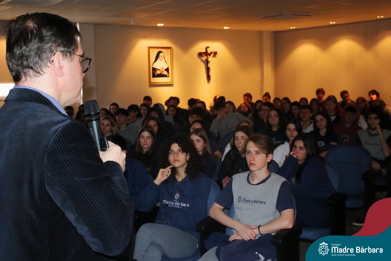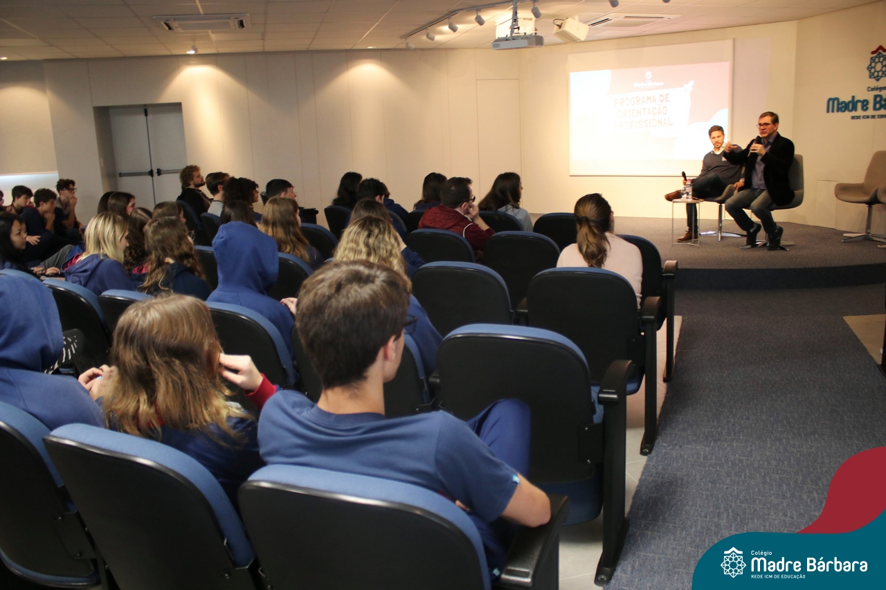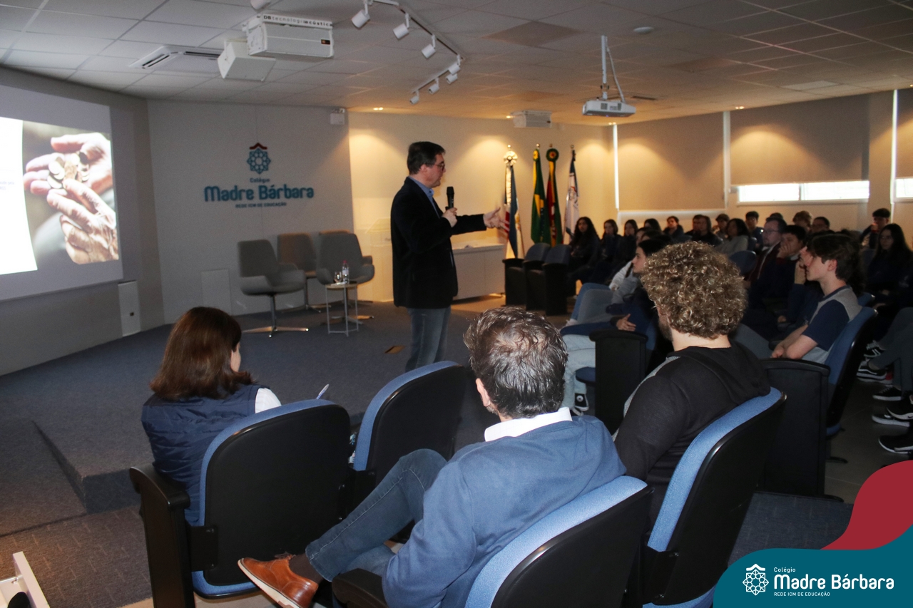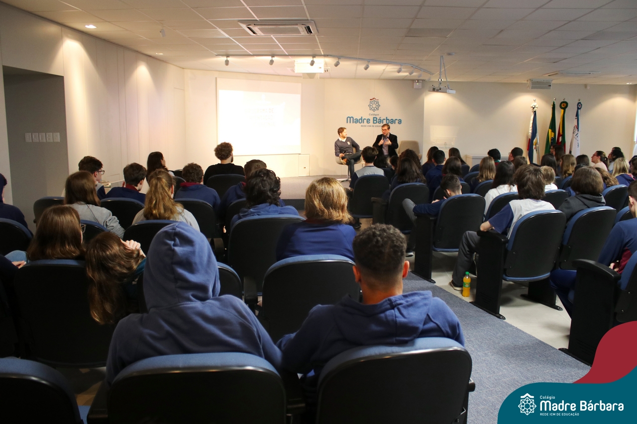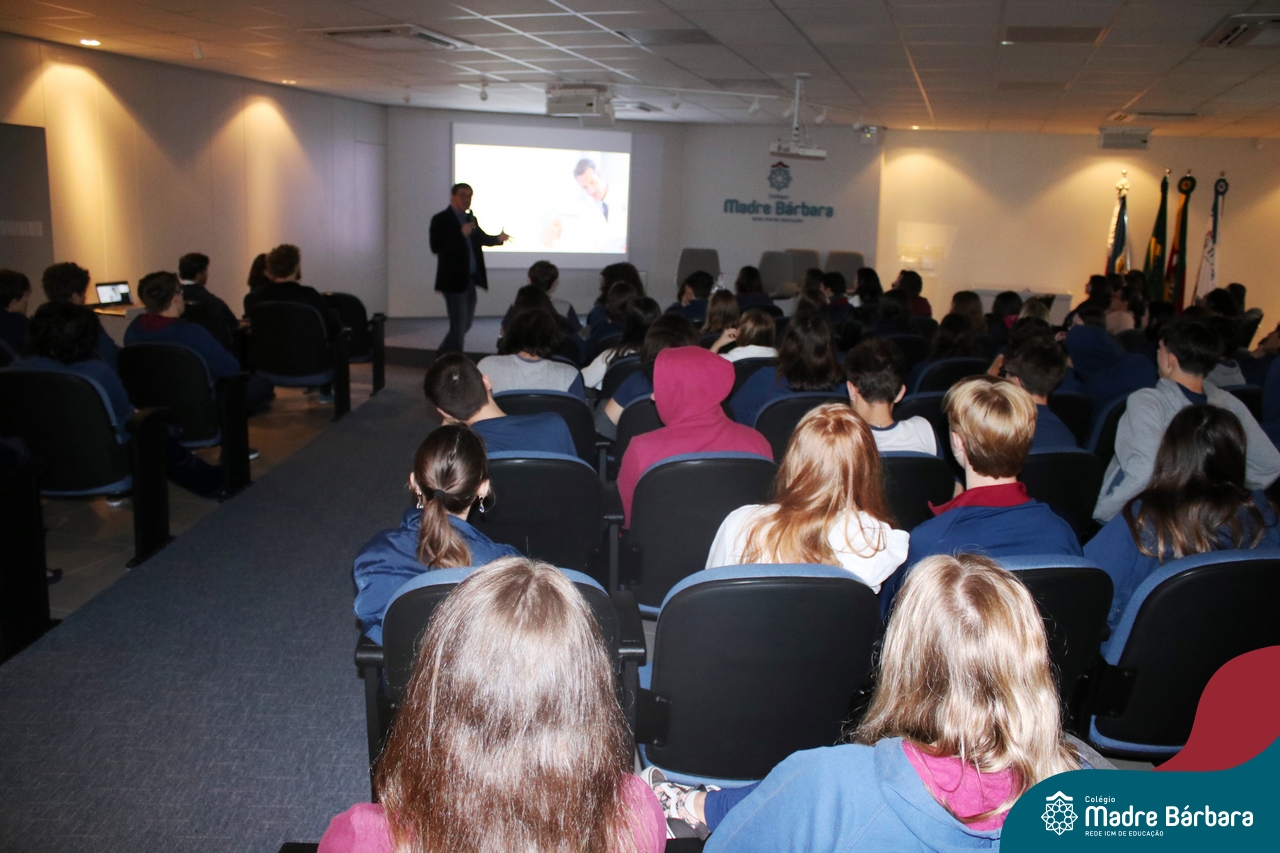 Na manhã desta segunda-feira (22.05), o Serviço de Orientação Educacional (SOE) do Colégio Madre Bárbara – Rede ICM, iniciou o Programa de Orientação Profissional, com todas as turmas do Ensino Médio. O Programa contempla um conjunto de atividades que visam auxiliar os estudantes a tomarem decisões sobre suas escolhas profissionais. No entendimento de que é um processo, a escola oportuniza, com parceria de instituições e especialistas, diversas ações voltadas para subsidiar escolhas seguras. A abertura deste ano, contou com a presença do Dr. Leandro Brust, médico Oncologista Clínico, doutor em Biotecnologia pela UCS, Head de Farmacogenomica da DASA Genomica – LATAM, Pós-graduado em Economia da Saúde – UFG, Consultor e Auditor para a Saúde em Oncologia, Hematologia e Testes Moleculares e Professor do curso de Medicina da Univates. Na oportunidade, Leandro refletiu com os estudantes, trazendo a sua experiência, narrando sobre os desafios e oportunidades nesta caminhada, enfatizando o quanto a determinação, fé, paixão e resiliência fazem a diferença em suas escolhas e busca de sonhos ou metas.