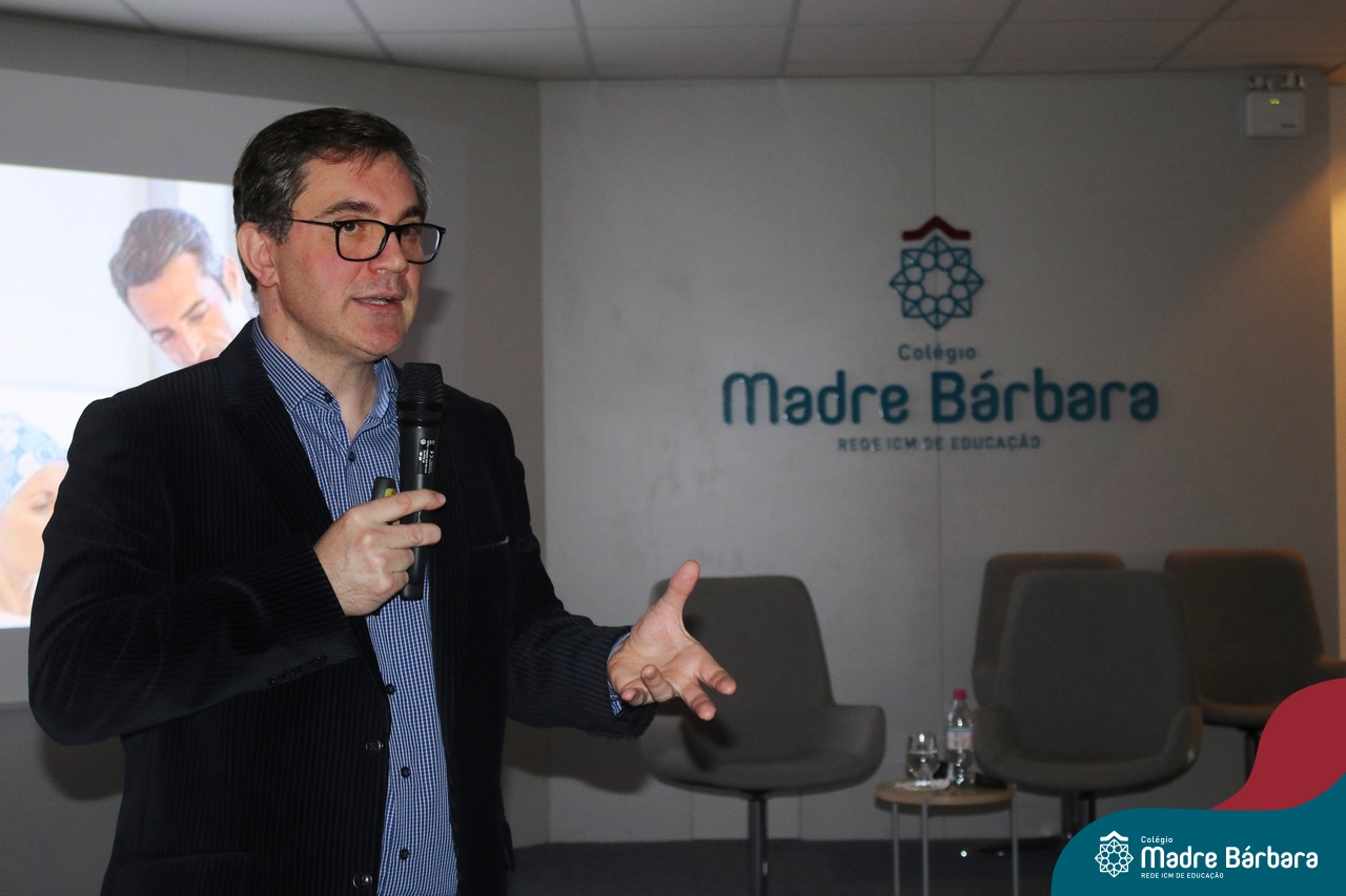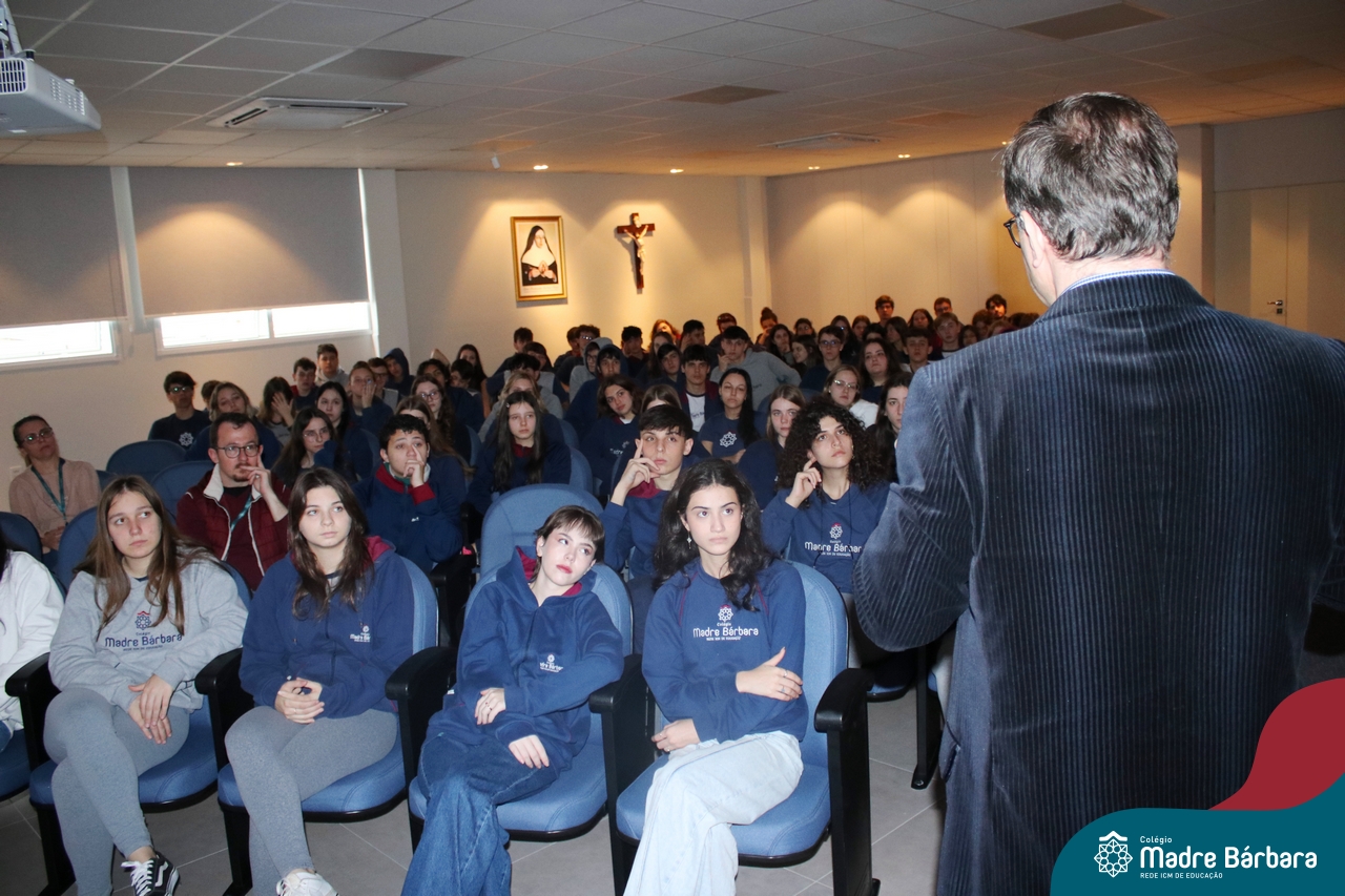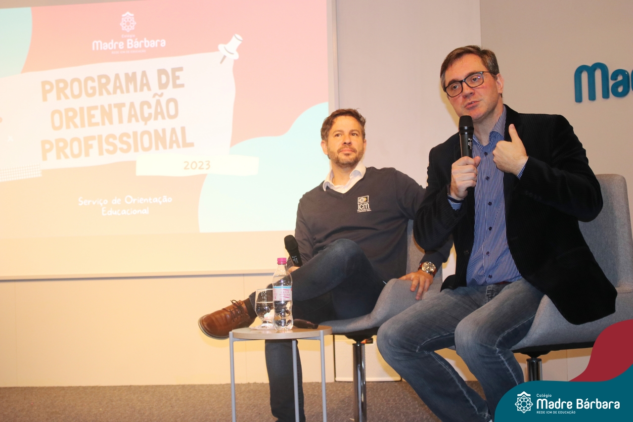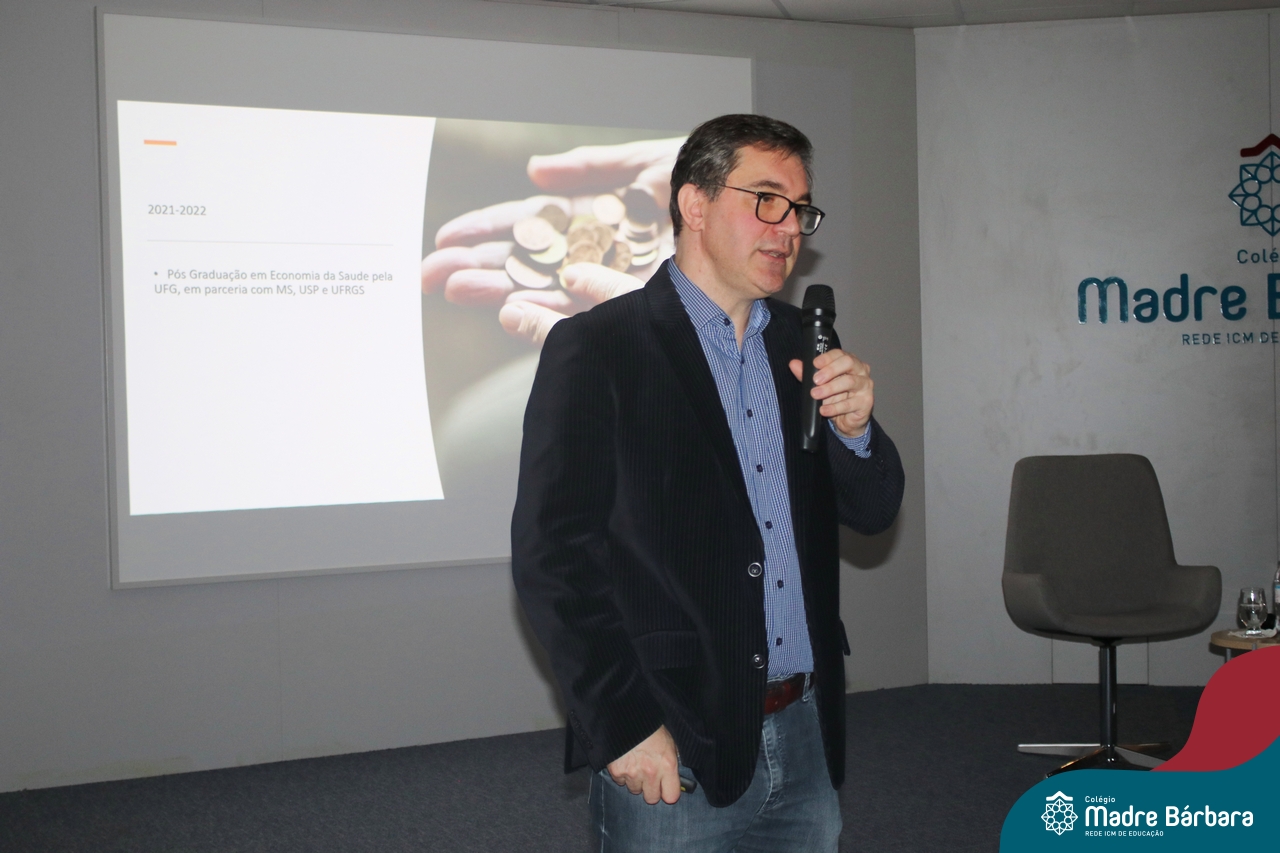 Na manhã desta segunda-feira (22.05), o Serviço de Orientação Educacional (SOE) do Colégio Madre Bárbara – Rede ICM, iniciou o Programa de Orientação Profissional, com todas as turmas do Ensino Médio. O Programa contempla um conjunto de atividades que visam auxiliar os estudantes a tomarem decisões sobre suas escolhas profissionais. No entendimento de que é um processo, a escola oportuniza, com parceria de instituições e especialistas, diversas ações voltadas para subsidiar escolhas seguras. A abertura deste ano, contou com a presença do Dr. Leandro Brust, médico Oncologista Clínico, doutor em Biotecnologia pela UCS, Head de Farmacogenomica da DASA Genomica – LATAM, Pós-graduado em Economia da Saúde – UFG, Consultor e Auditor para a Saúde em Oncologia, Hematologia e Testes Moleculares e Professor do curso de Medicina da Univates. Na oportunidade, Leandro refletiu com os estudantes, trazendo a sua experiência, narrando sobre os desafios e oportunidades nesta caminhada, enfatizando o quanto a determinação, fé, paixão e resiliência fazem a diferença em suas escolhas e busca de sonhos ou metas.