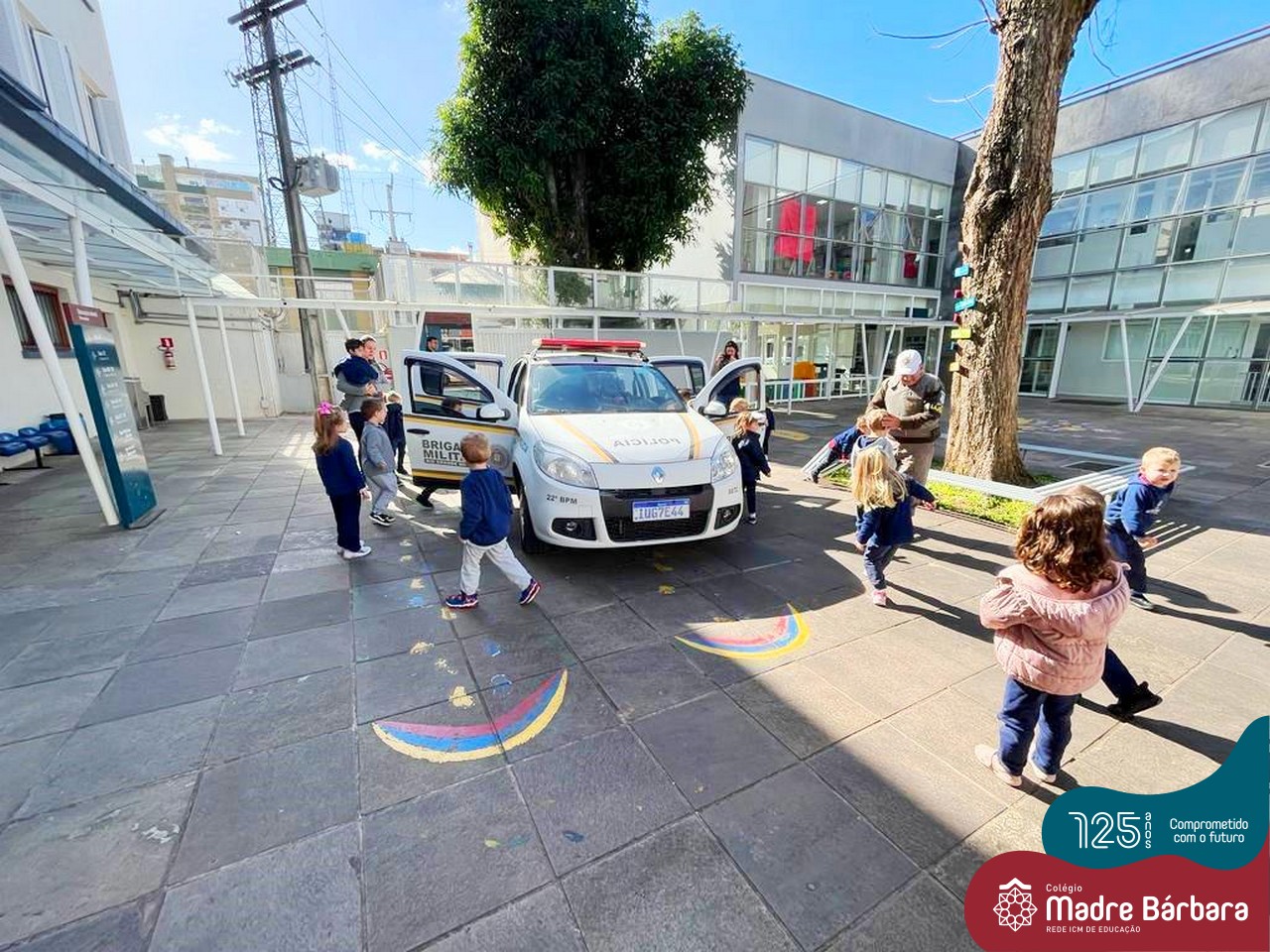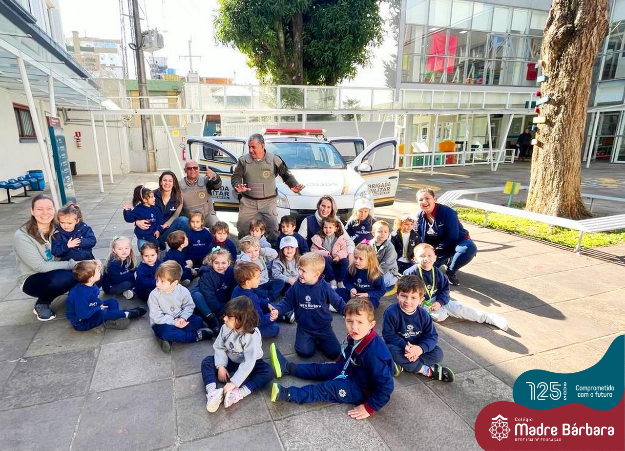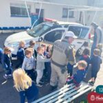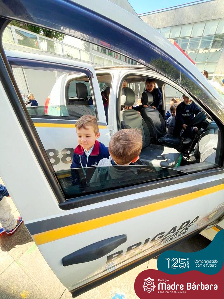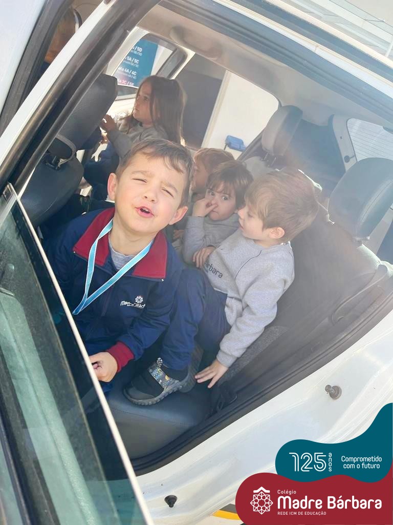 A turma do Nível 2C está com o projeto “Carro de polícia” em andamento, que surgiu a partir do interesse das crianças pelos carros estacionados em frente ao Colégio. Na última quinta-feira (18.08) o N2C convidou o N3A-tarde para um passeio pela quadra. As crianças puderam observar as placas de trânsito, carros, motos, calçadas, lojas e etc. O piso tátil nas calçadas para deficientes visuais despertou curiosidade e o interesse de muitas crianças, o carro da polícia que estava estacionado em frente à Brigada Militar causou muita alegria e entusiasmo. Mas as vivências não pararam por aí, na sexta-feira (19.08) o “Carro da Polícia” veio até o pátio da educação infantil do Colégio. Então as crianças puderam tirar fotos, conversar e experimentar o colete e boné dos policiais, entraram no carro, e o momento mais esperado e divertido aconteceu, que foi escutar a sirene da viatura. Nossa tarde foi marcada por muitos olhinhos brilhando e lindos e significativos sorrisos.