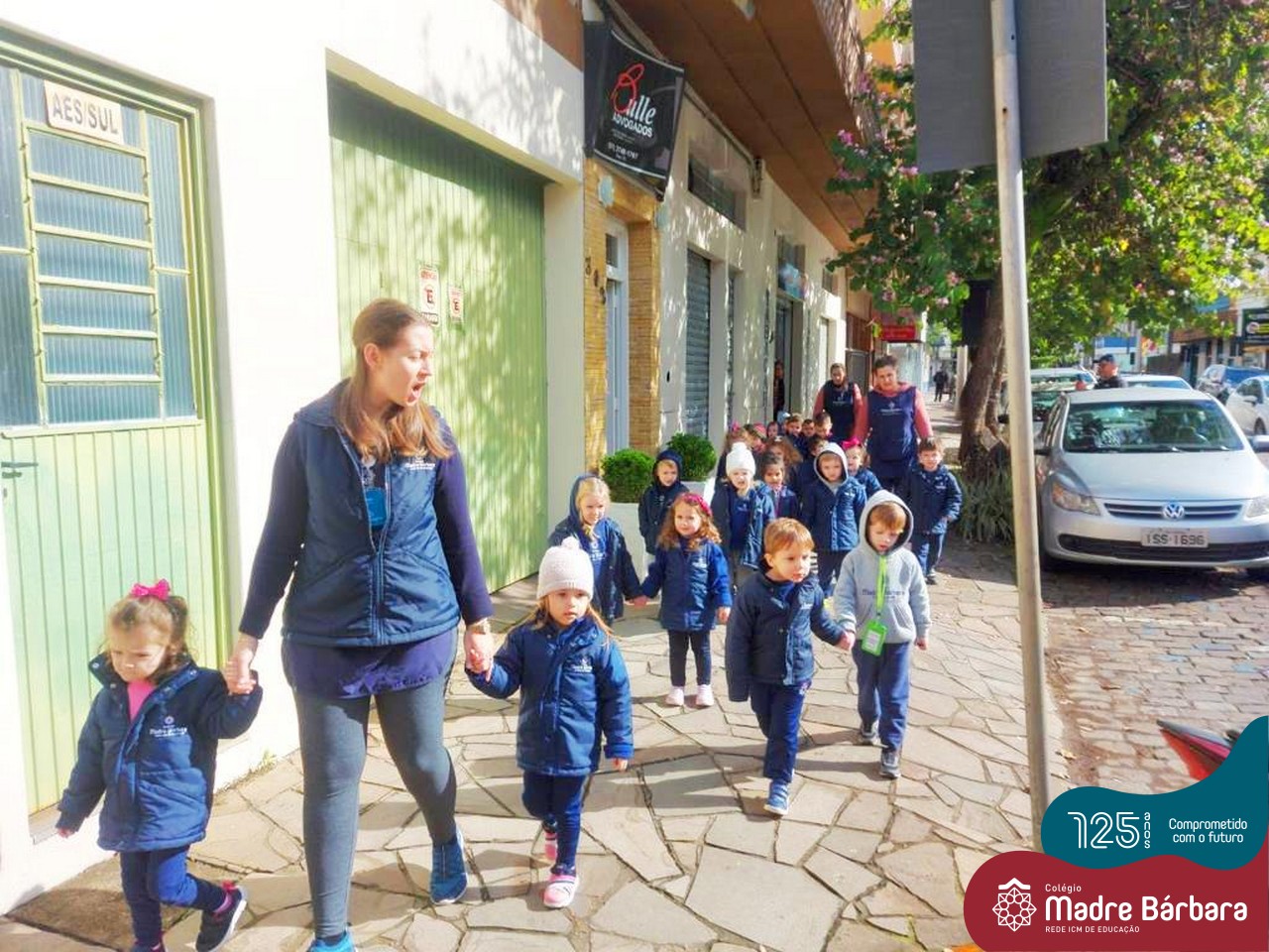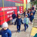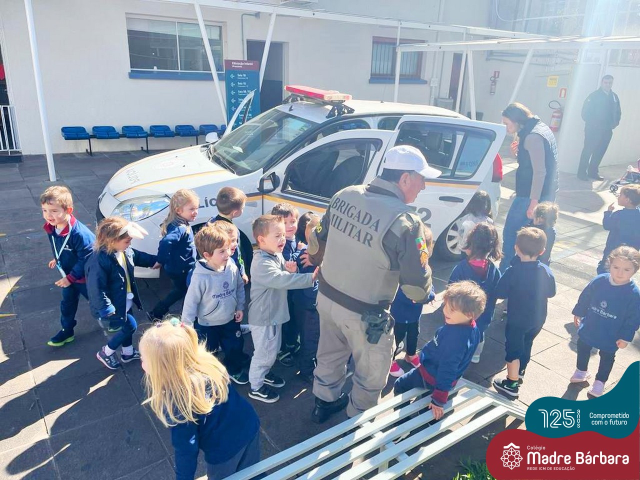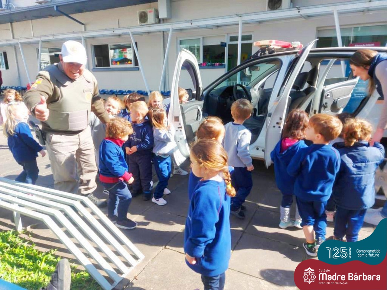 A turma do Nível 2C está com o projeto “Carro de polícia” em andamento, que surgiu a partir do interesse das crianças pelos carros estacionados em frente ao Colégio. Na última quinta-feira (18.08) o N2C convidou o N3A-tarde para um passeio pela quadra. As crianças puderam observar as placas de trânsito, carros, motos, calçadas, lojas e etc. O piso tátil nas calçadas para deficientes visuais despertou curiosidade e o interesse de muitas crianças, o carro da polícia que estava estacionado em frente à Brigada Militar causou muita alegria e entusiasmo. Mas as vivências não pararam por aí, na sexta-feira (19.08) o “Carro da Polícia” veio até o pátio da educação infantil do Colégio. Então as crianças puderam tirar fotos, conversar e experimentar o colete e boné dos policiais, entraram no carro, e o momento mais esperado e divertido aconteceu, que foi escutar a sirene da viatura. Nossa tarde foi marcada por muitos olhinhos brilhando e lindos e significativos sorrisos.