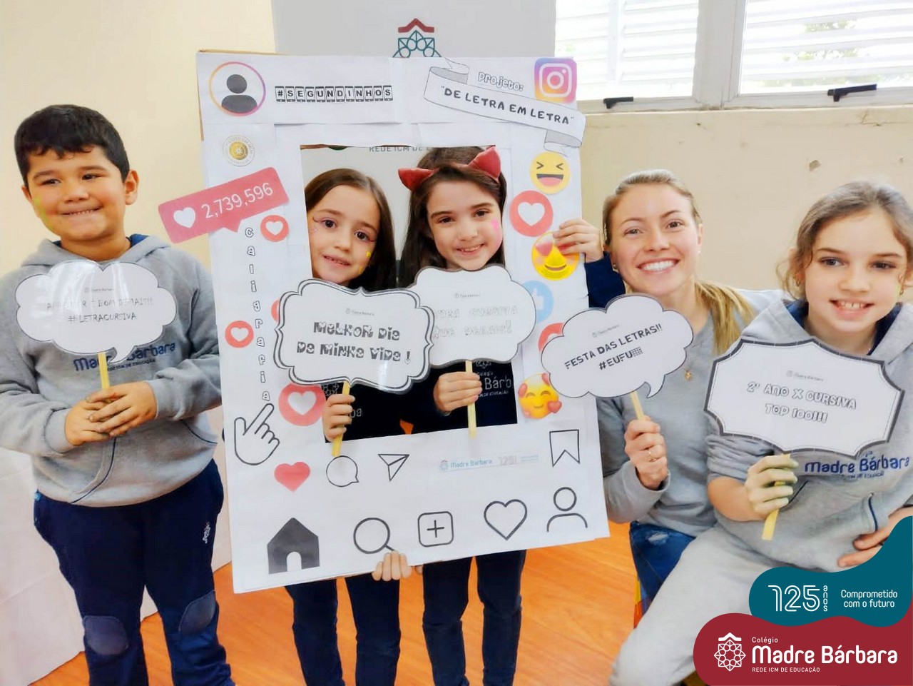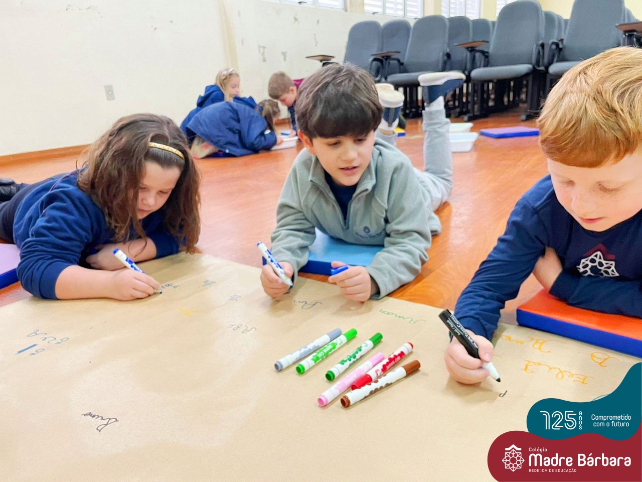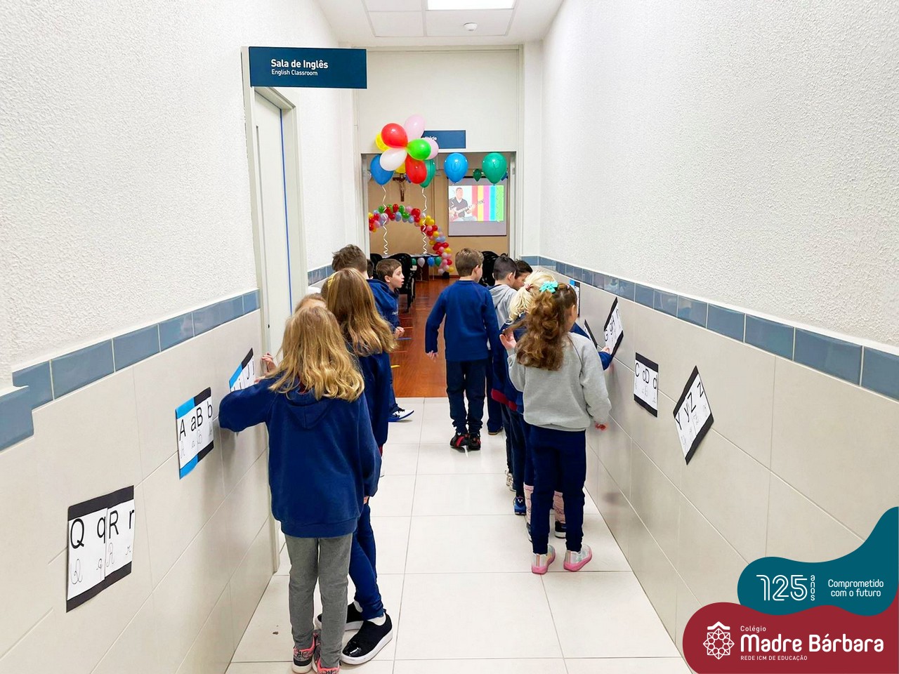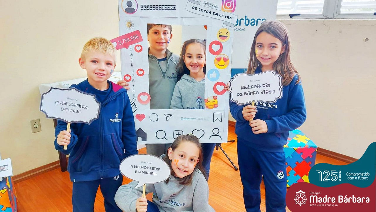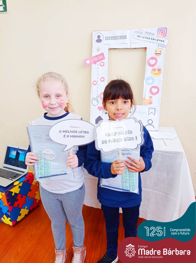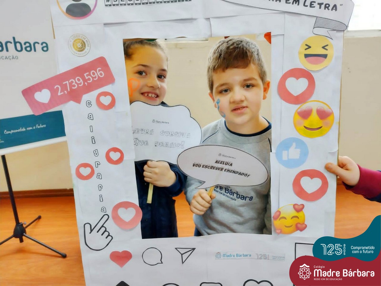 Os alunos foram convidados a participar da FESTA DA LETRA CURSIVA, que foi planejada e preparada com muito carinho pelas professoras Caroline, Juliane, Marina, Mara S. e Bruna. O presente projeto tem como objetivo despertar ainda mais o desejo em aprender a letra emendada. O lúdico no processo de aprendizagem estimula habilidades socioemocionais, nutre a autoestima e garante memórias afetivas, tão importantes no processo ensino-aprendizagem. Colocando em prática os 7 hábitos do Líder em Mim os alunos foram direcionados para estações com um objetivo em mente: desafiar-se a ler e escrever algumas letras emendadas, utilizando massinha de modelar, areia colorida, pinturas no rosto de letras e palavras, assinar o nome em um papel fixado no chão, utilizando canetões com muita sinergia.