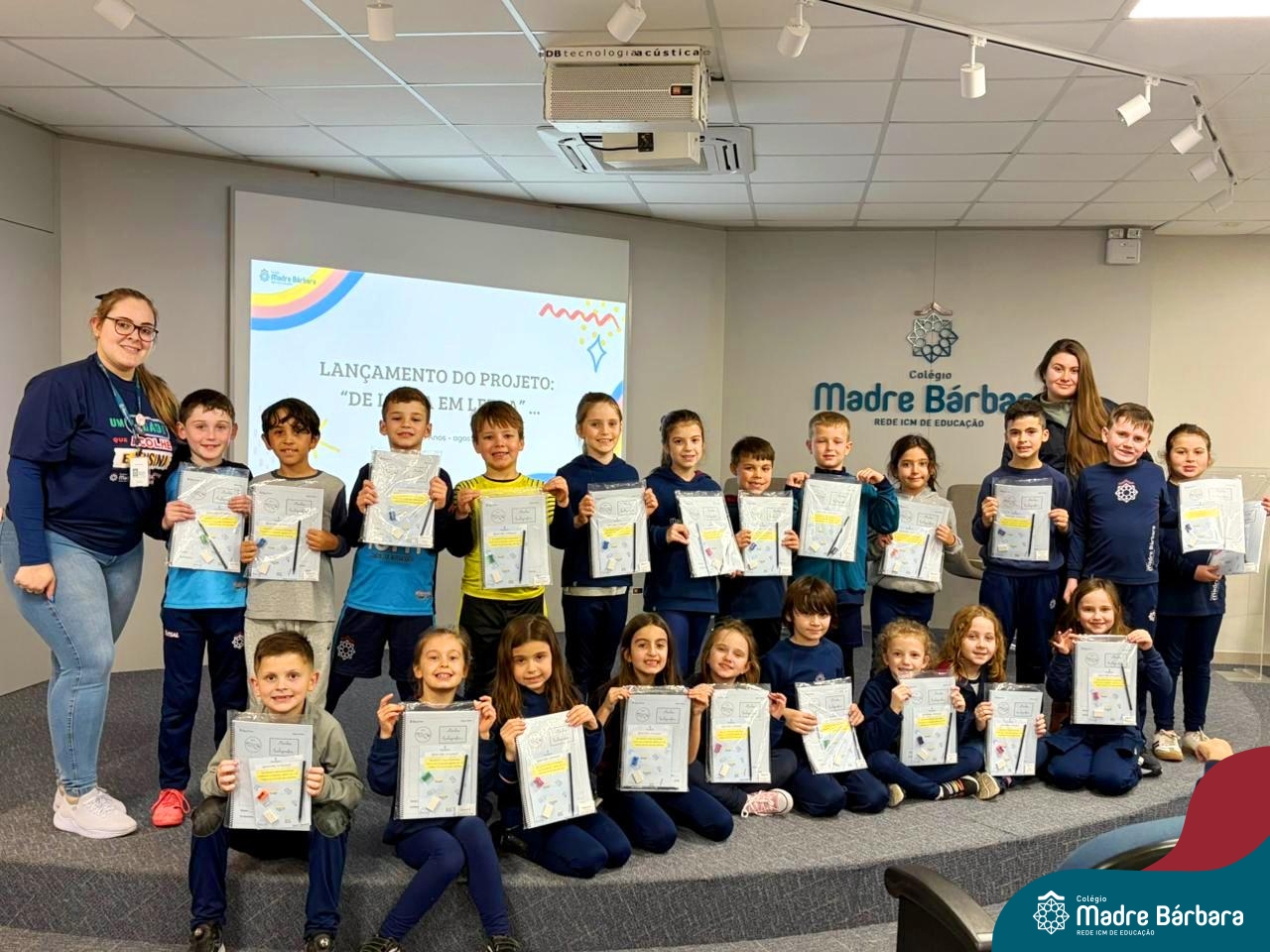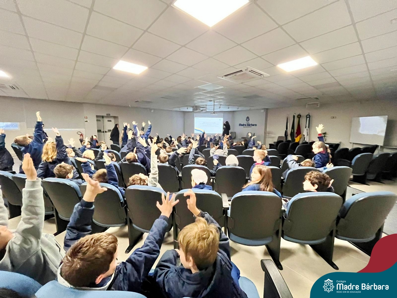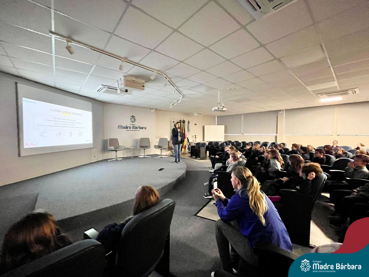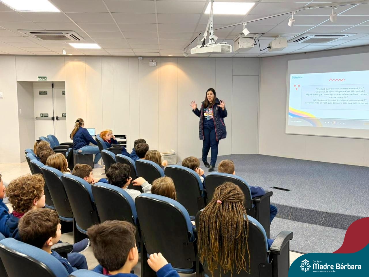 Chegou o momento mais aguardado do ano para os 2º anos: o lançamento do Projeto “De Letra em Letra”! Os alunos do segundo ano do Colégio Madre Bárbara foram recepcionados no miniauditório para um momento muito especial, planejado e preparado com muito carinho e proatividade pelas professoras Caroline, Mara, Mariana, Simoni e Vitória. A letra cursiva chegou! Ela é como um cordão encantado que une uma letra à outra, fazendo com que pareçam estar dançando de mãos dadas no papel.