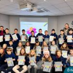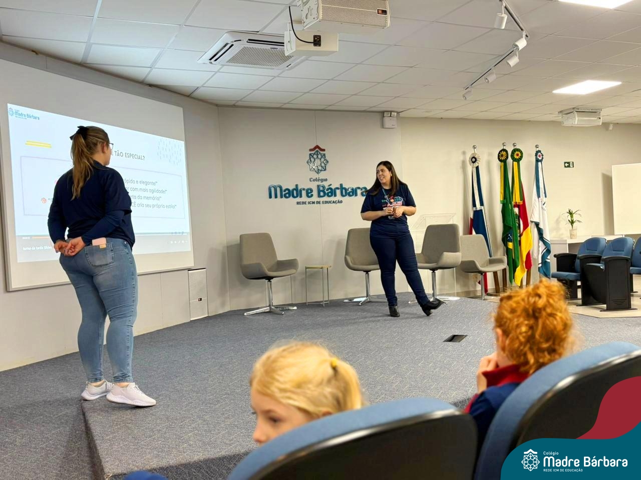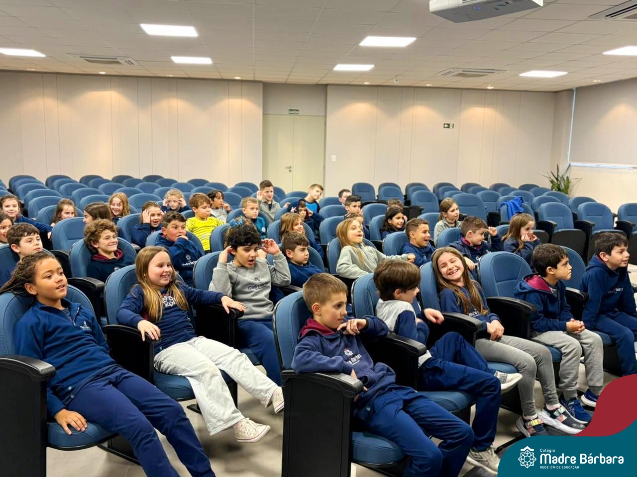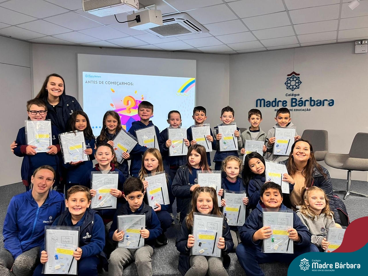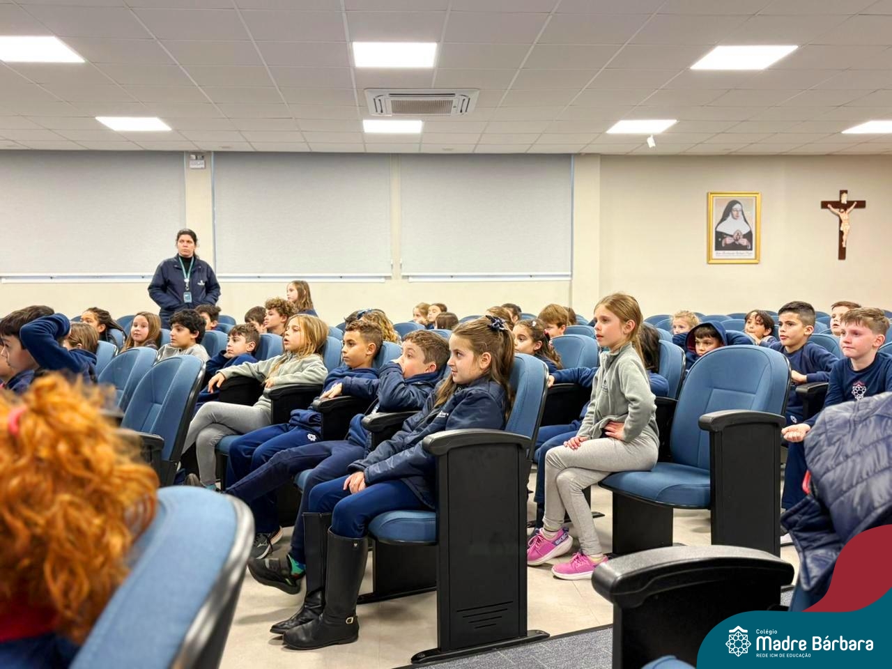 Chegou o momento mais aguardado do ano para os 2º anos: o lançamento do Projeto “De Letra em Letra”! Os alunos do segundo ano do Colégio Madre Bárbara foram recepcionados no miniauditório para um momento muito especial, planejado e preparado com muito carinho e proatividade pelas professoras Caroline, Mara, Mariana, Simoni e Vitória. A letra cursiva chegou! Ela é como um cordão encantado que une uma letra à outra, fazendo com que pareçam estar dançando de mãos dadas no papel.