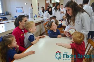 As crianças do nível 3B – tarde da Educação Infantil, juntamente com as professoras Cristiane e Tainá participaram de uma situação de aprendizagem no Laboratório de Ciências com o alunos do 2°ano do Ensino Médio. O momento de interação entre as turmas foi planejado com carinho pela professora de biologia Ângela Lenz, tendo como objetivo conhecer e aprofundar ainda mais o conhecimento sobre o corpo humano, assunto abordado no projeto “Eu sou assim”… O projeto vem despertando muitas curiosidades e encantamentos!