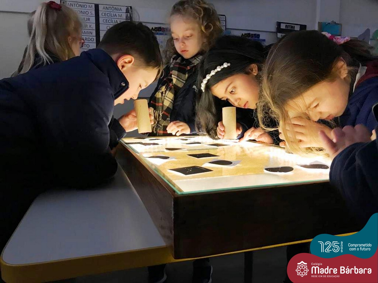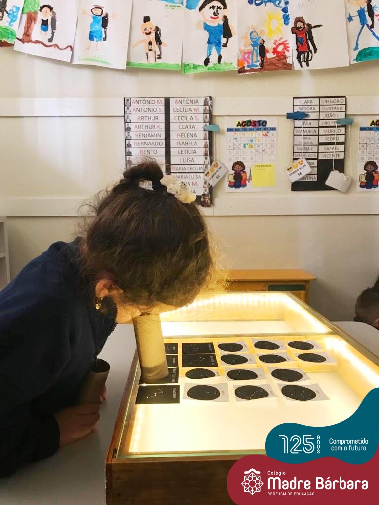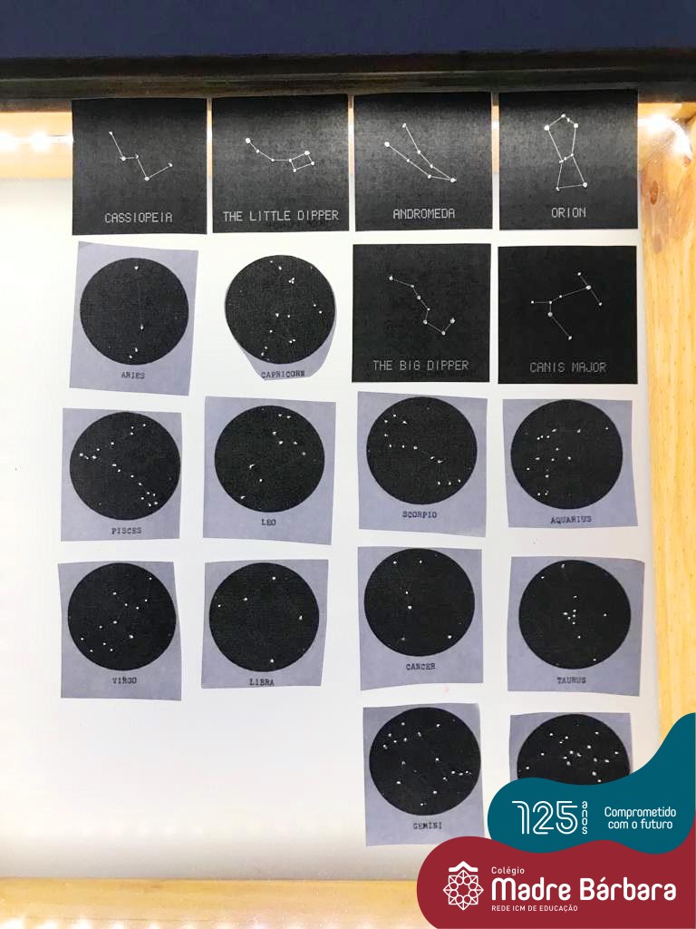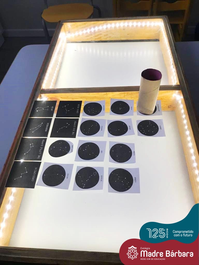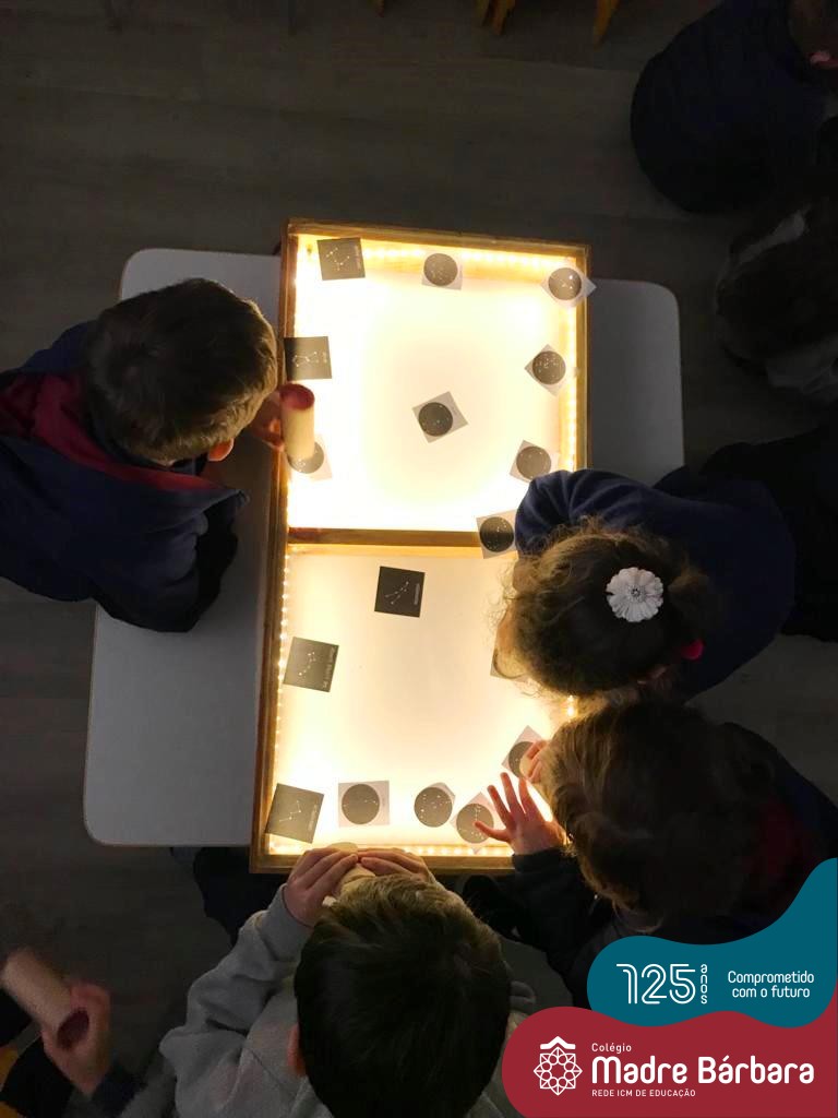 As crianças do Nível 5C juntamente com a professora Christiane e a monitora Deise, estão desenvolvendo o projeto “Todas as crianças em um só universo”. Partindo das curiosidades das crianças, um dos questionamentos foi: ” É possível desenhar nas estrelas?”. Através deste questionamento foi proposta uma situação de pesquisa com o auxílio dos tablets. Para direcionar a pesquisa, foram colocados por alguns espaços QR CODES que direcionaram as crianças para vídeos explicativos sobre as estrelas elencando as constelações. Após assistirmos aos vídeos foi oportunizado um momento de observação através da caixa de luz e imagens com algumas constelações.