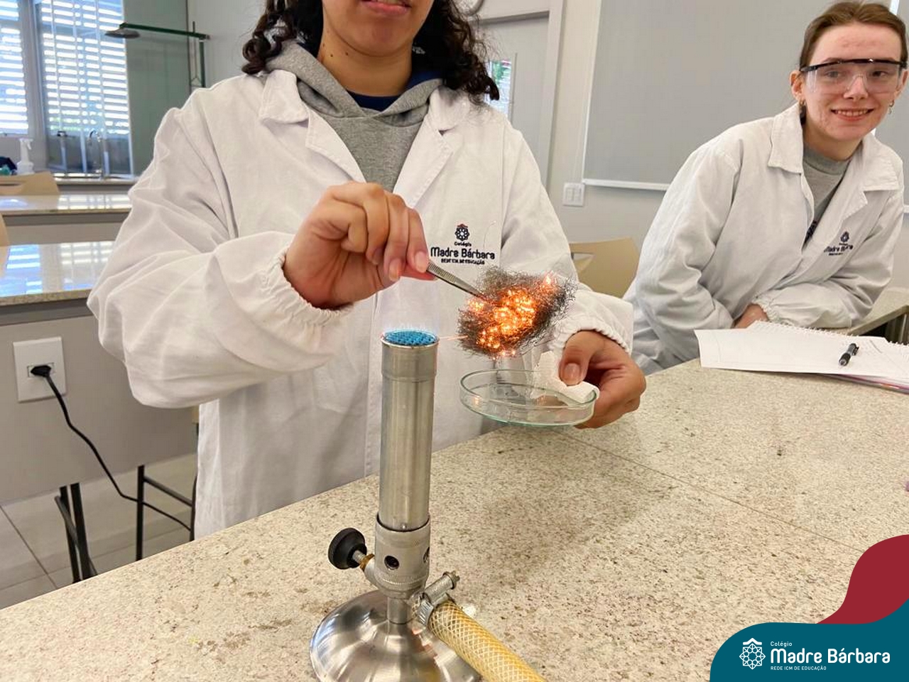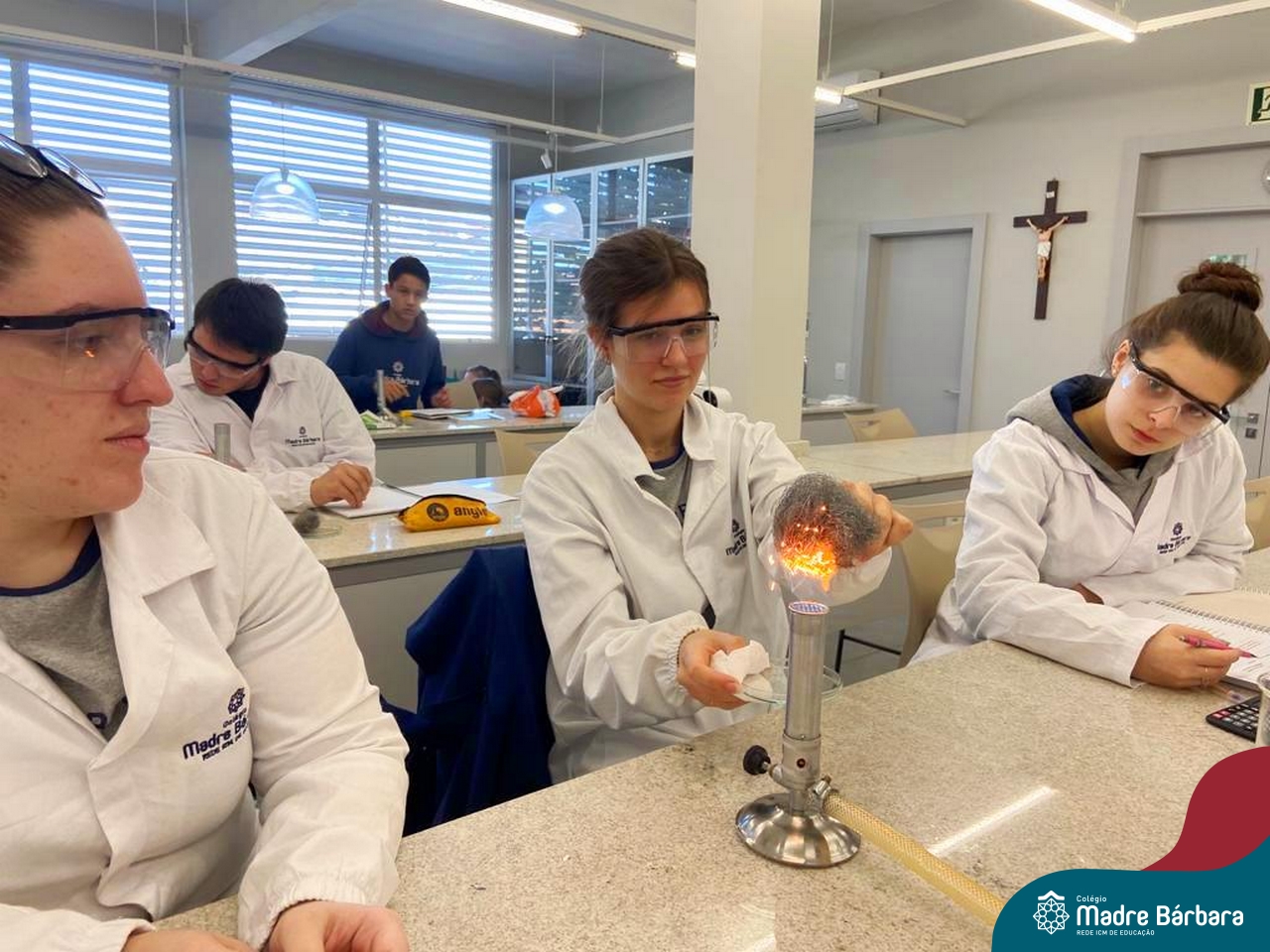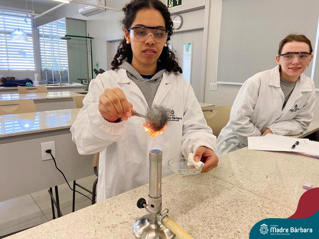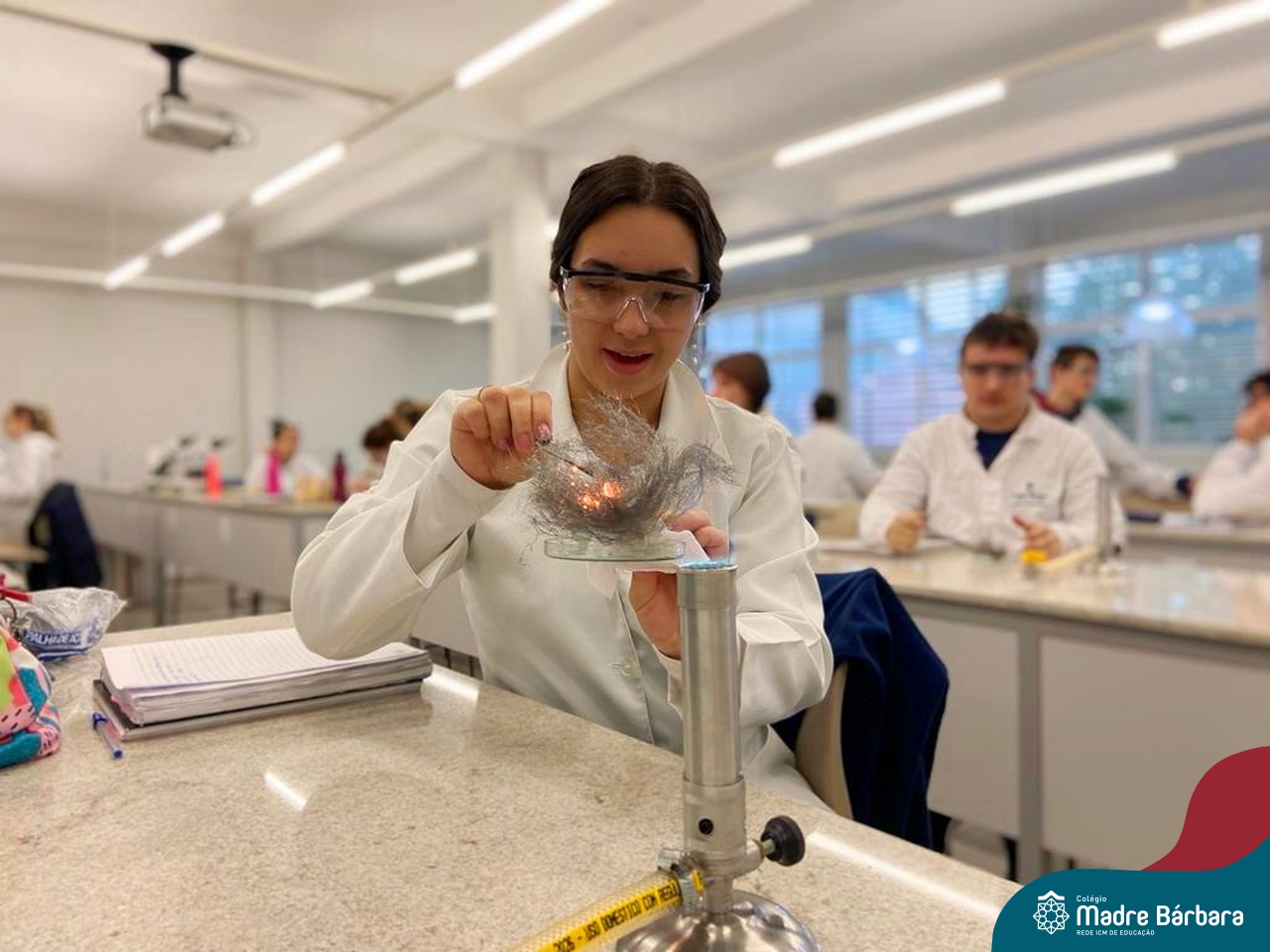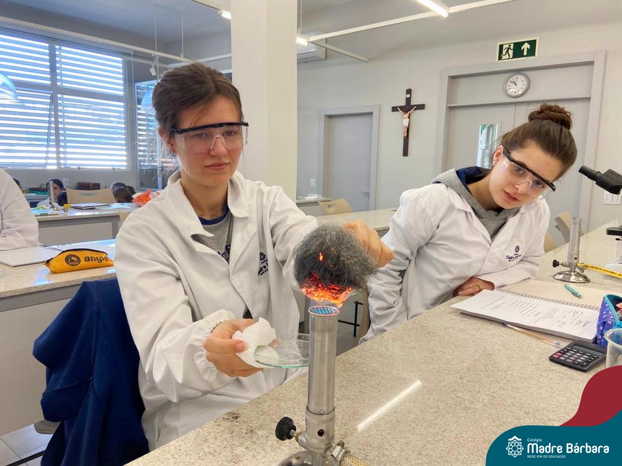 Os estudantes dos 3°s anos do Ensino Médio tiveram que ir atrás dessa resposta. Dentro da proposta de revisão do cálculo estequiométrico, os estudantes foram desafiados a calcular o rendimento de uma reação química a partir de uma reação química a partir da reação de combustão do ferro no Laboratório de Ciências da Natureza. A proposta é coordenada pelo professor Aliar Anacleto Jung.