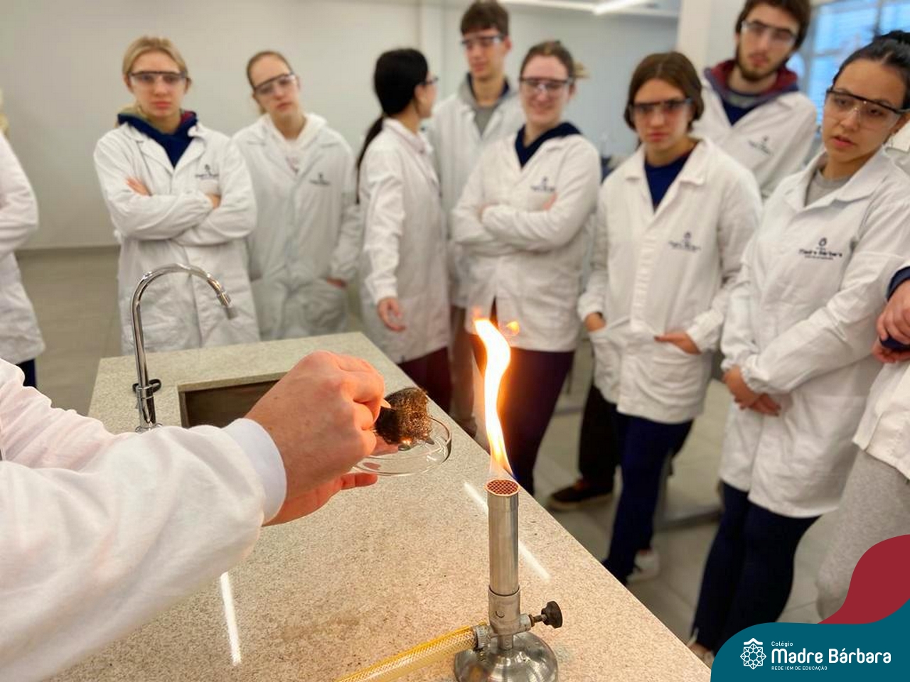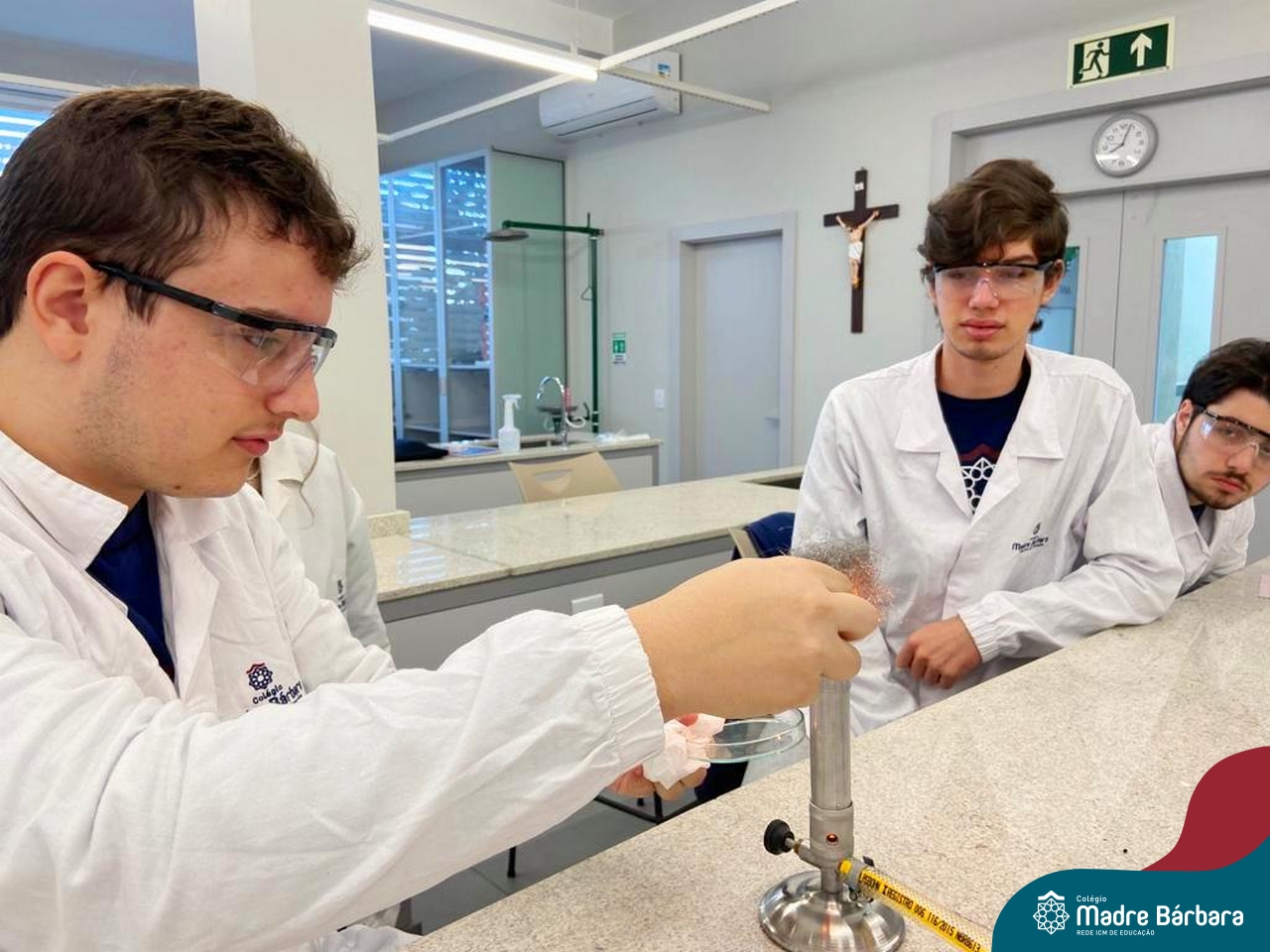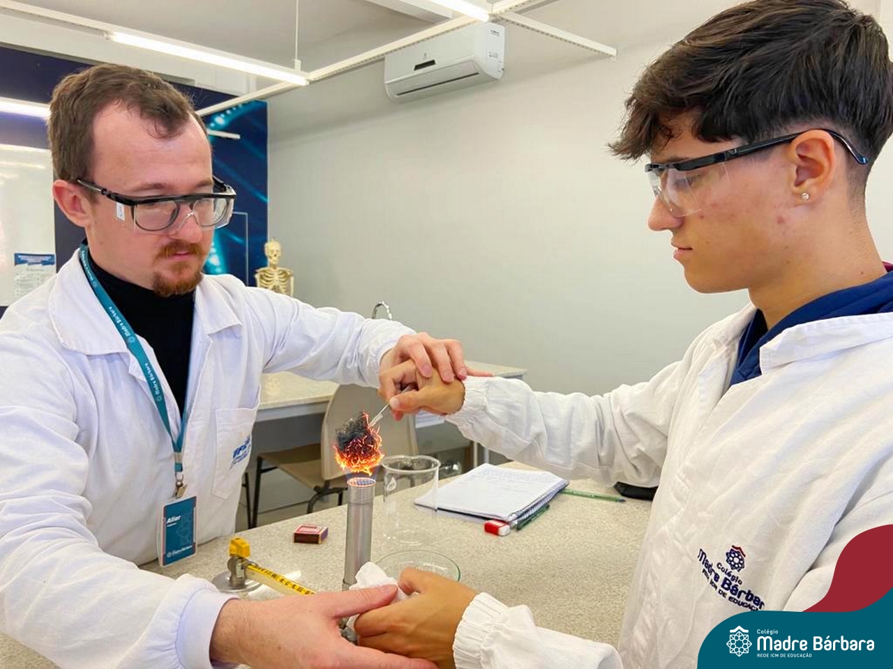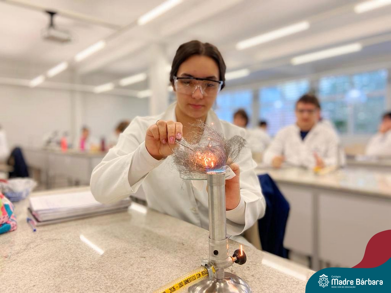Os estudantes dos 3°s anos do Ensino Médio tiveram que ir atrás dessa resposta. Dentro da proposta de revisão do cálculo estequiométrico, os estudantes foram desafiados a calcular o rendimento de uma reação química a partir de uma reação química a partir da reação de combustão do ferro no Laboratório de Ciências da Natureza. A proposta é coordenada pelo professor Aliar Anacleto Jung.