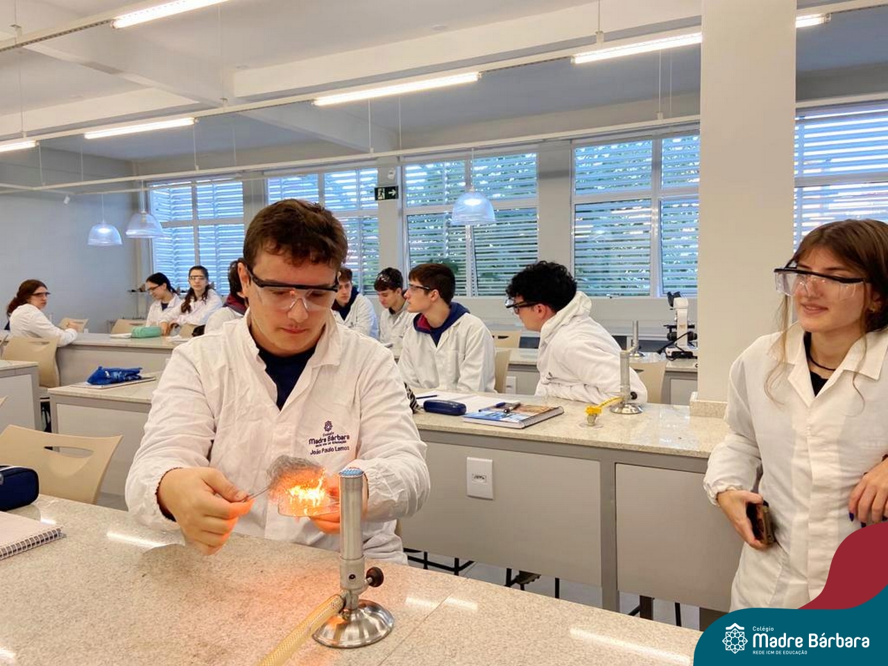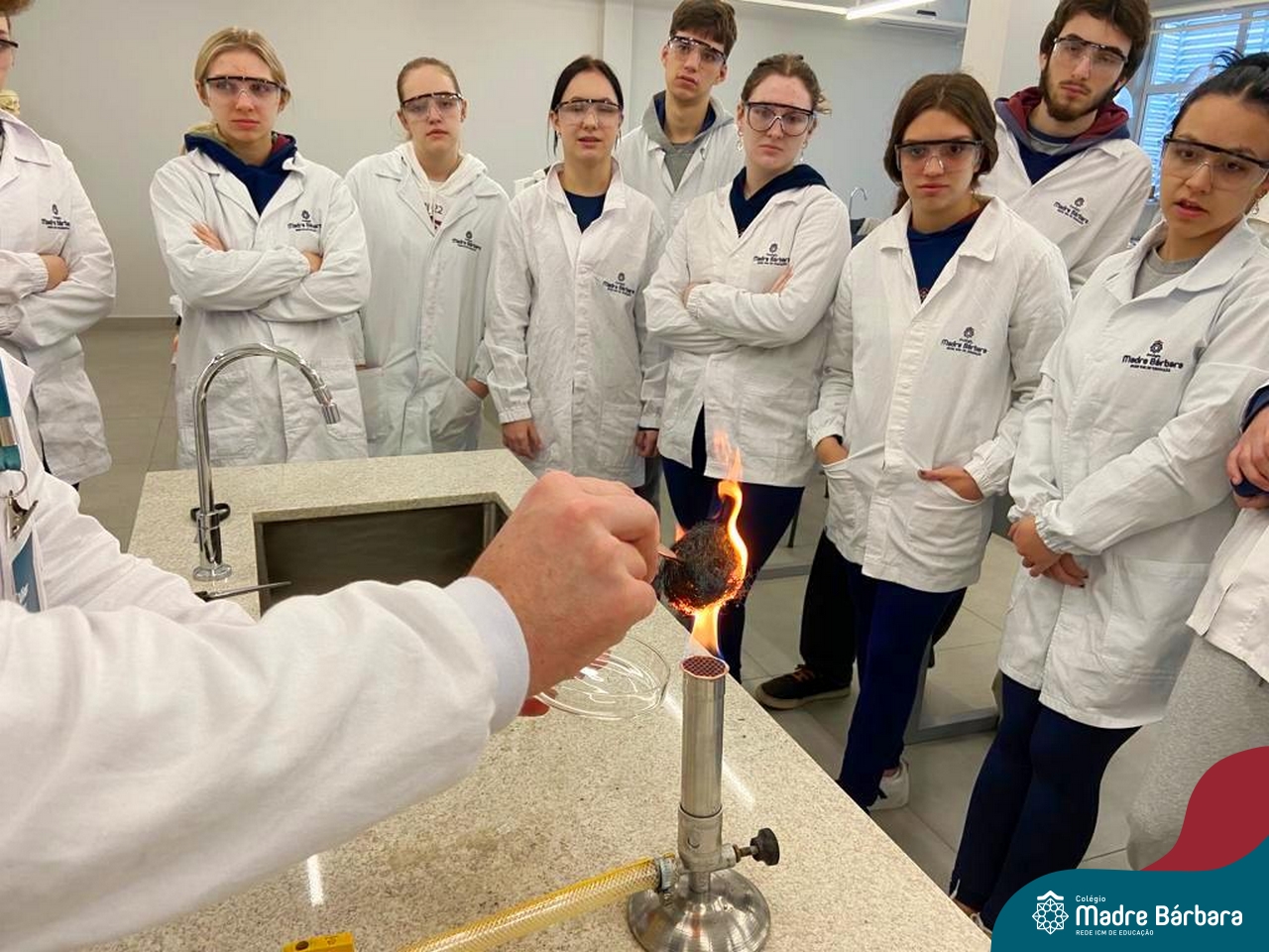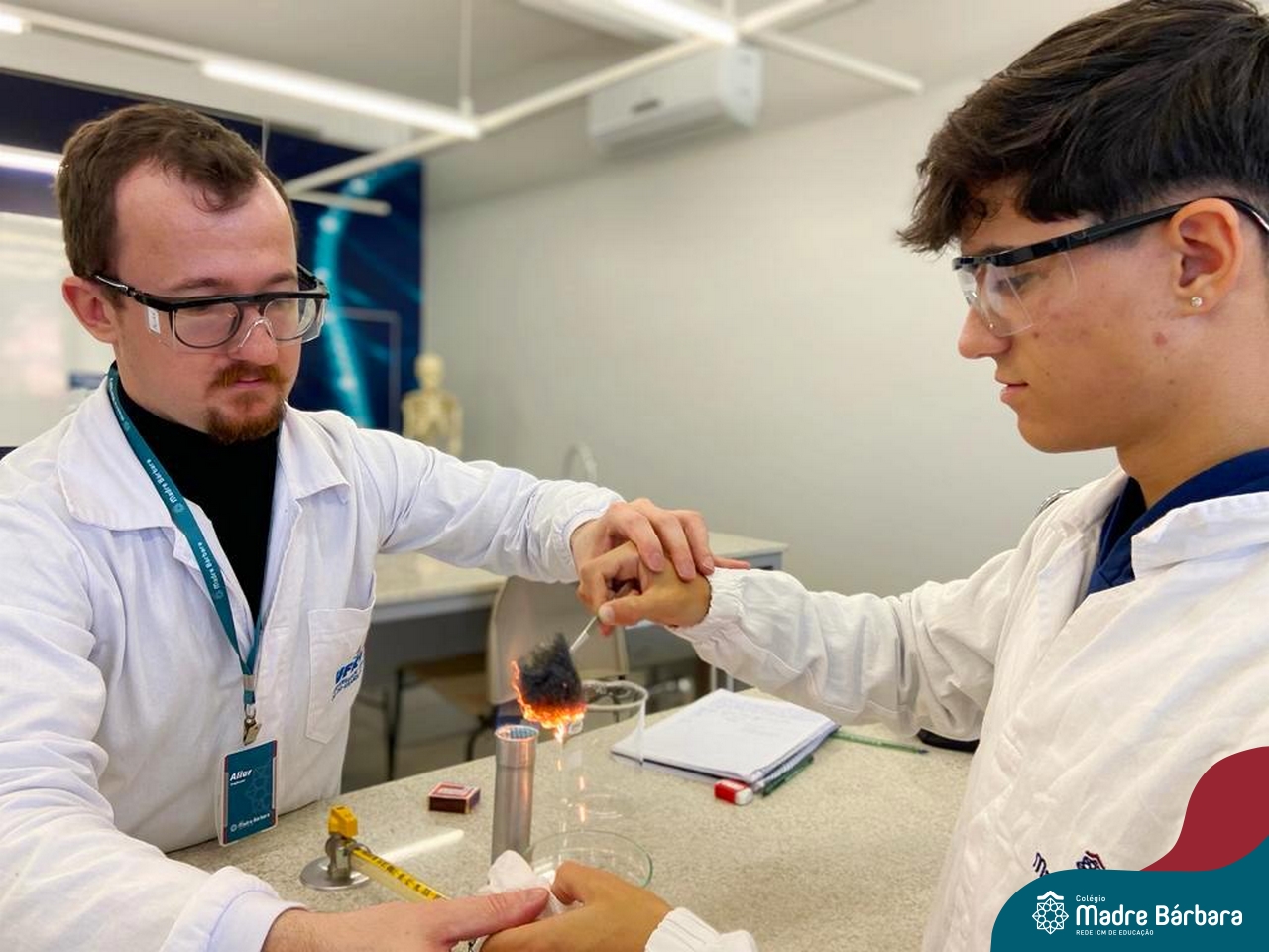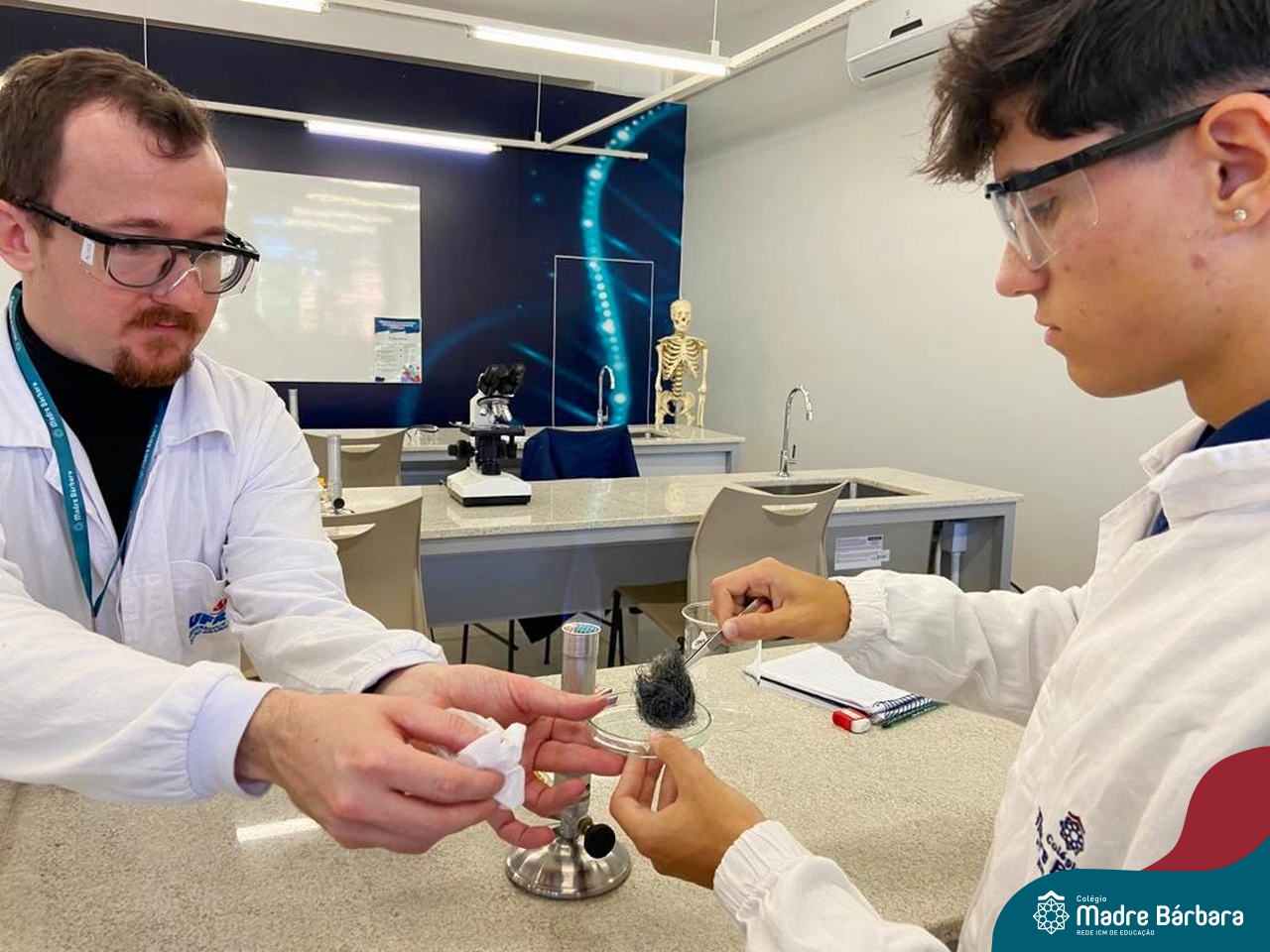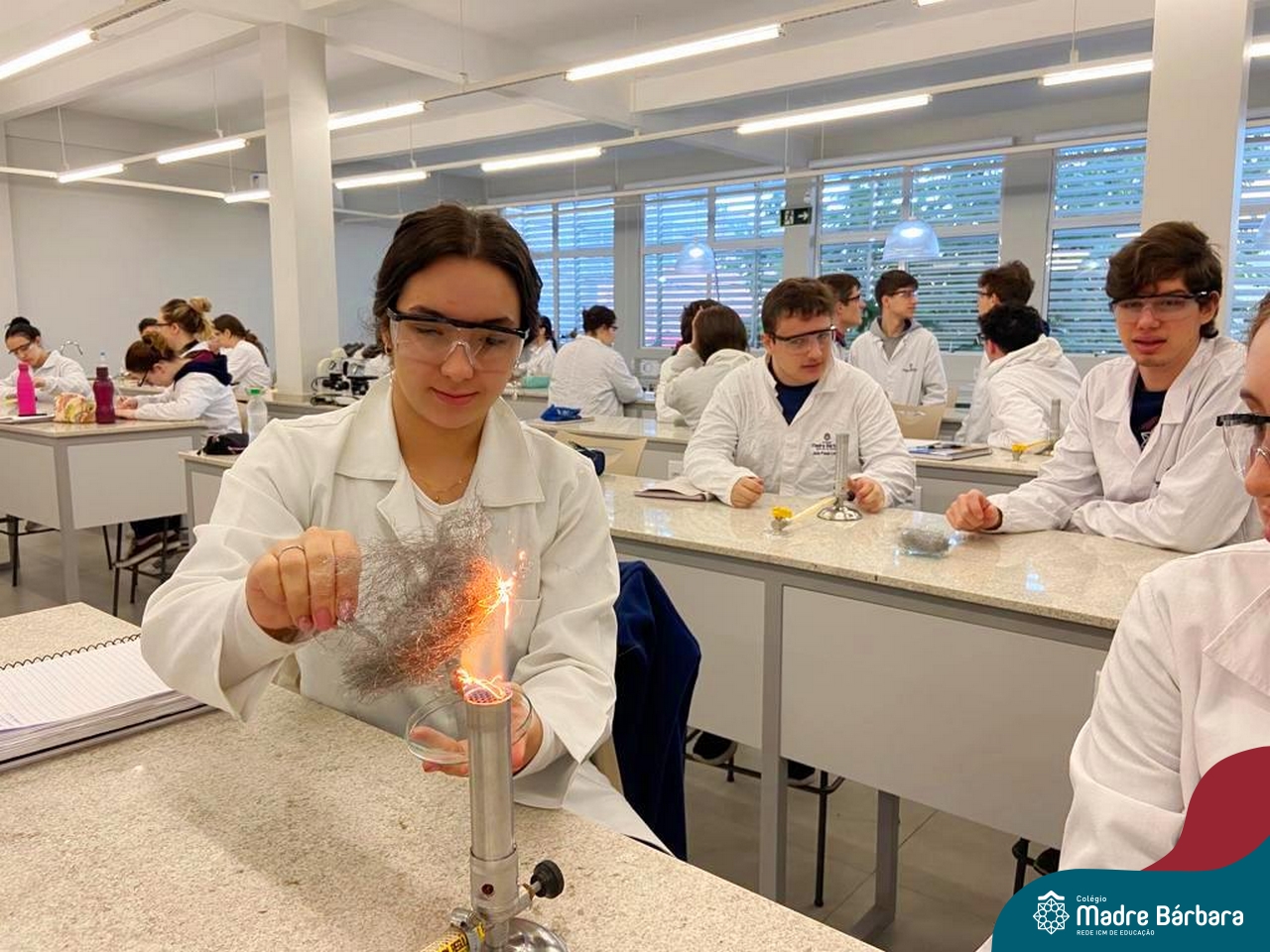 Os estudantes dos 3°s anos do Ensino Médio tiveram que ir atrás dessa resposta. Dentro da proposta de revisão do cálculo estequiométrico, os estudantes foram desafiados a calcular o rendimento de uma reação química a partir de uma reação química a partir da reação de combustão do ferro no Laboratório de Ciências da Natureza. A proposta é coordenada pelo professor Aliar Anacleto Jung.