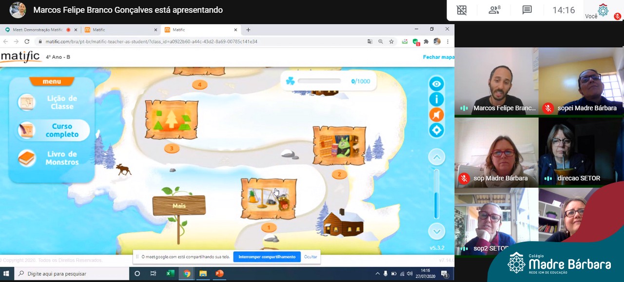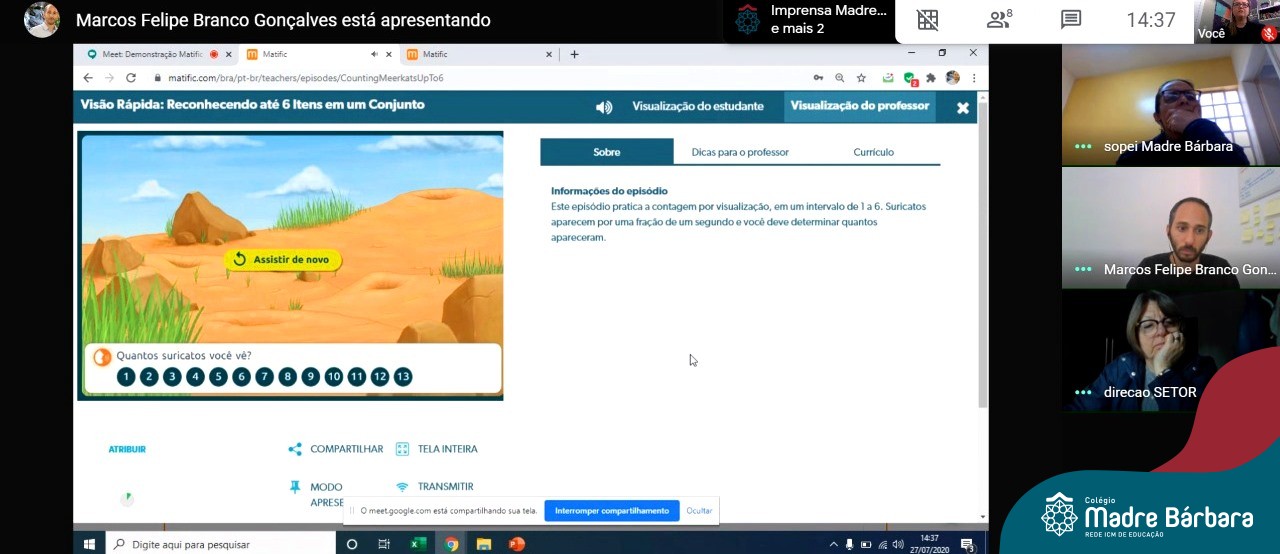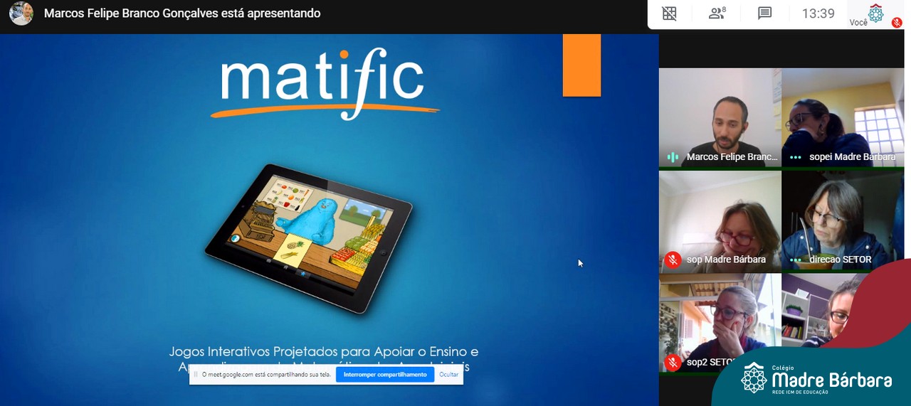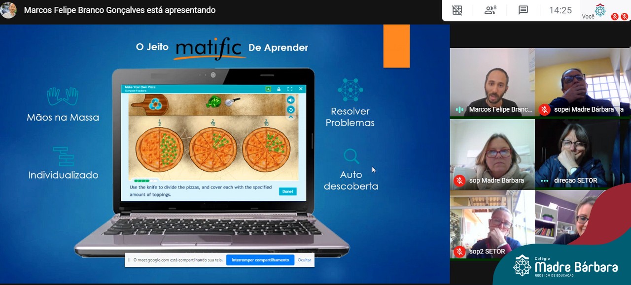 A Rede ICM está consolidando uma parceria com a plataforma Matific, que é composta por atividades matemáticas que ensinam a resolução de problemas e o pensamento crítico a partir da utilização da gamificação e jogos como incentivo a essa curiosidade e descoberta do aluno. Os professores podem atribuir a plataforma de acordo com planejamento e com ritmo do aluno, permitindo atribuição individualizada e resultados acompanhados pelos relatórios. Nessa segunda-feira (27.07) a coordenação pedagógica e direção do Colégio Madre Bárbara – Rede ICM participaram de uma reunião com o executivo de contas da Matific, Marcos Gonçalves, que demonstrou a ferramenta e conversou sobre a implementação.