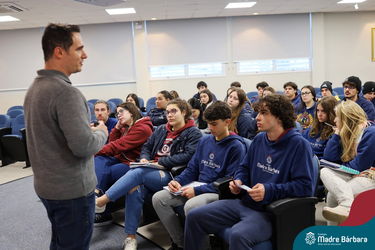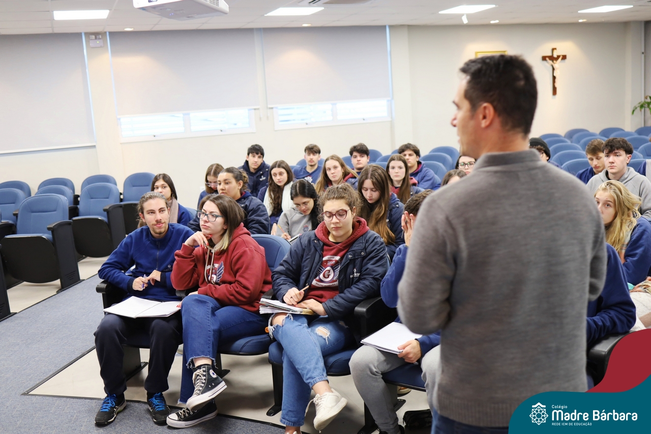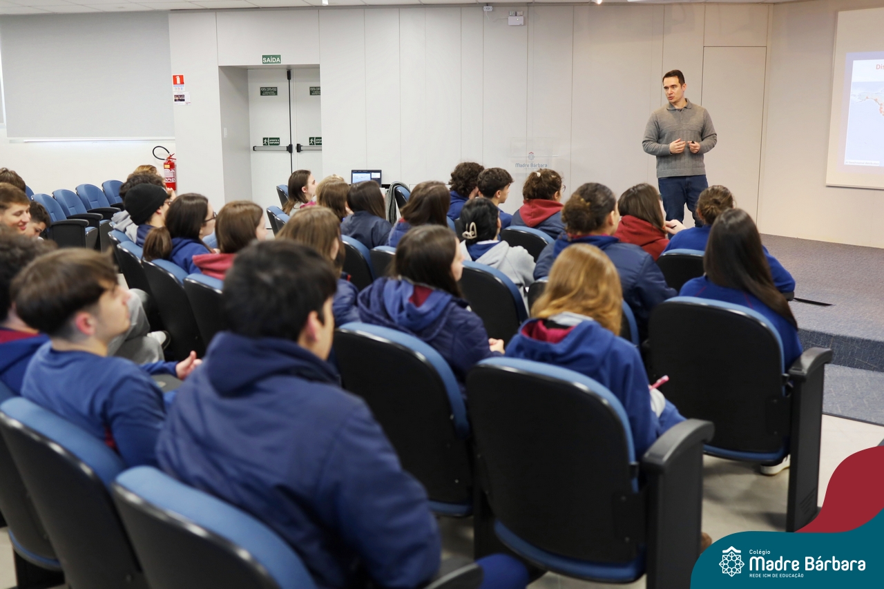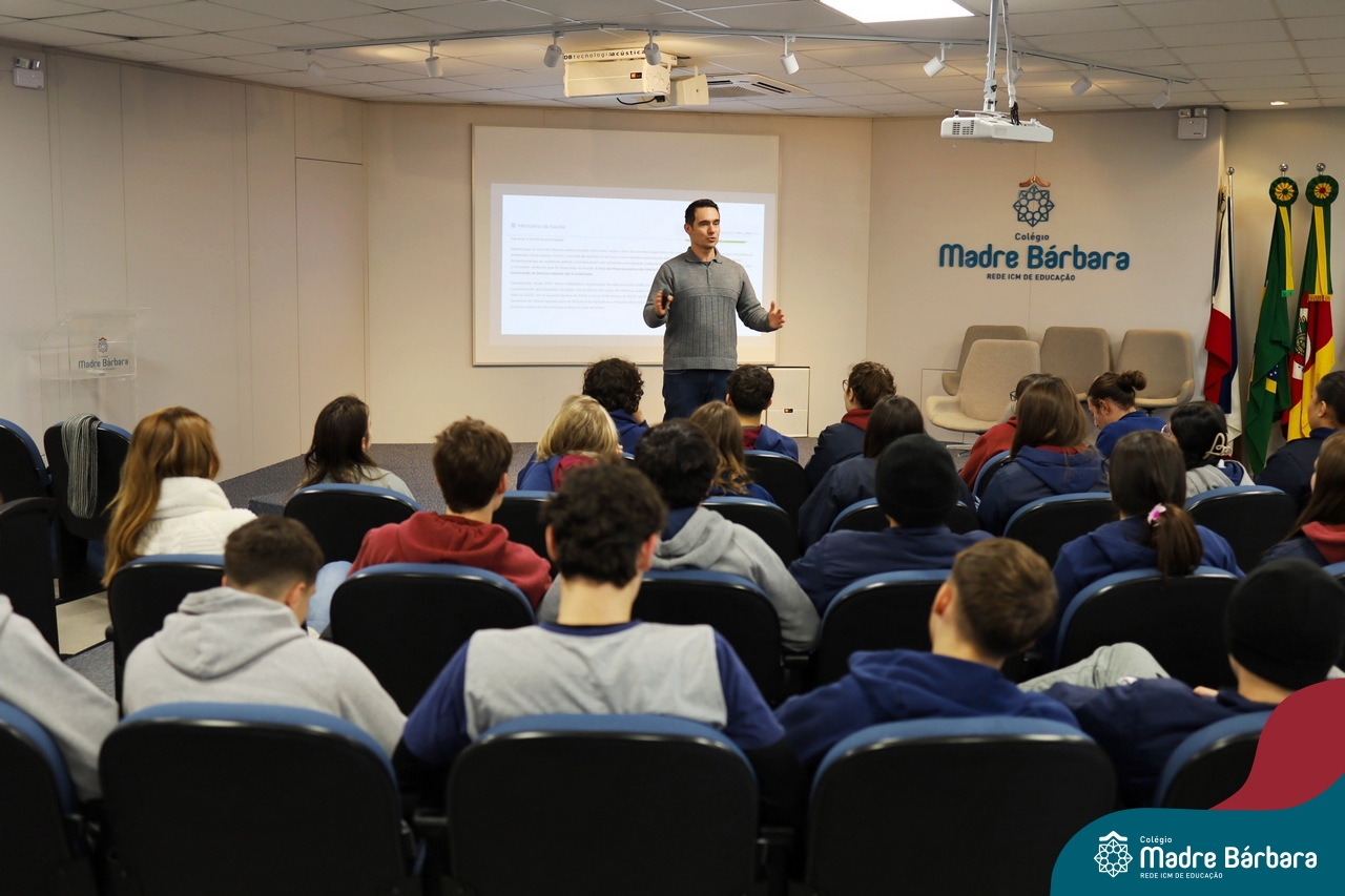 Os estudantes do 3º ano do Ensino Médio participaram de uma enriquecedora palestra com o médico veterinário Dr. Felipe Lopes Campos, fiscal Estadual Agropecuário da Secretaria da Agricultura, Pecuária, Produção Sustentável e Irrigação do RS (SEAPI-RS) e coordenador da Seção de Educação Sanitária. Com vasta experiência na área, Dr. Felipe trouxe uma análise profunda sobre as principais zoonoses — doenças que podem ser transmitidas entre animais e seres humanos — destacando seu impacto direto na economia, na saúde coletiva e no desenvolvimento das populações.