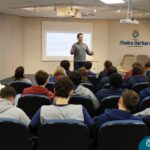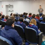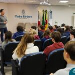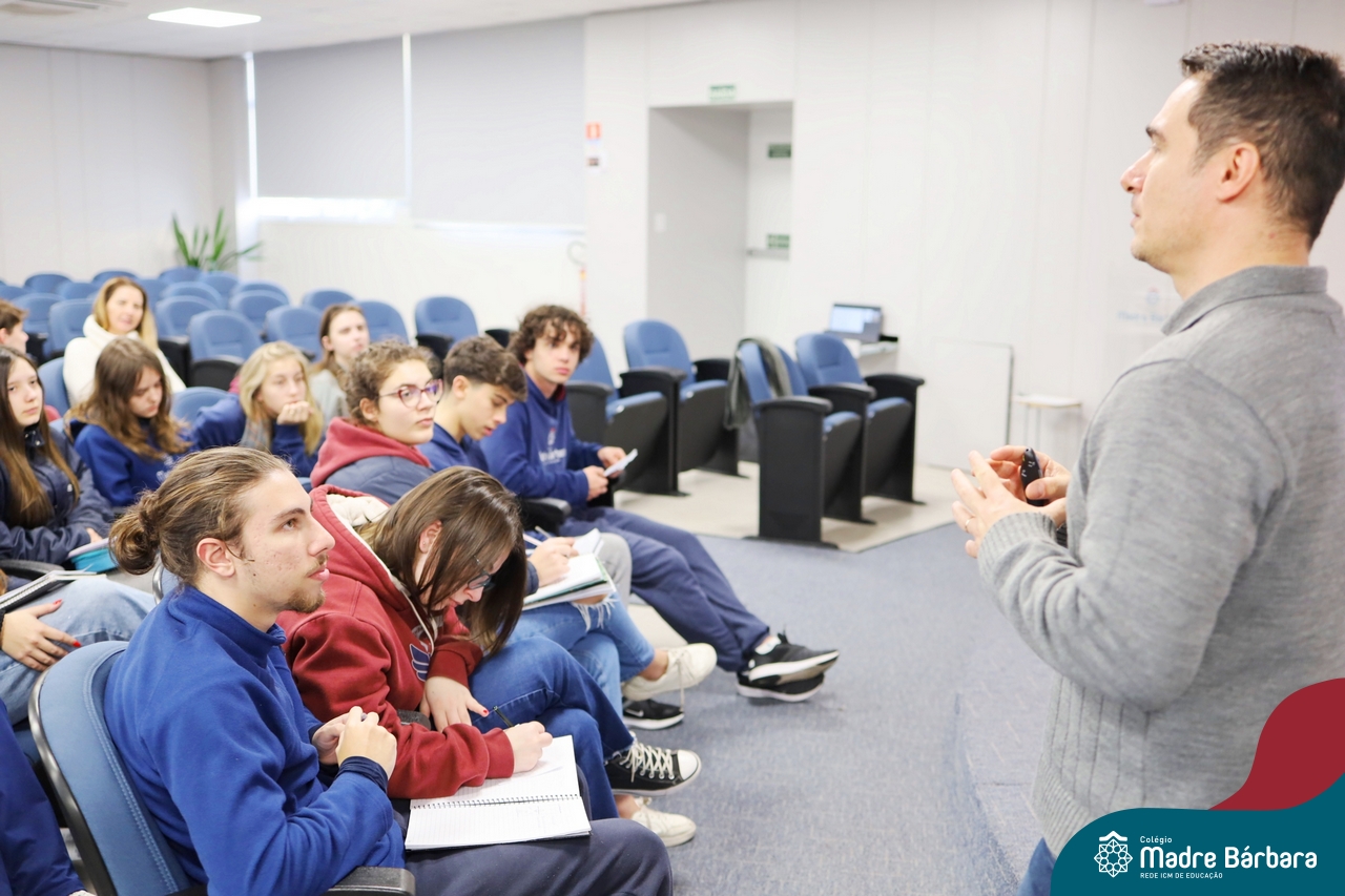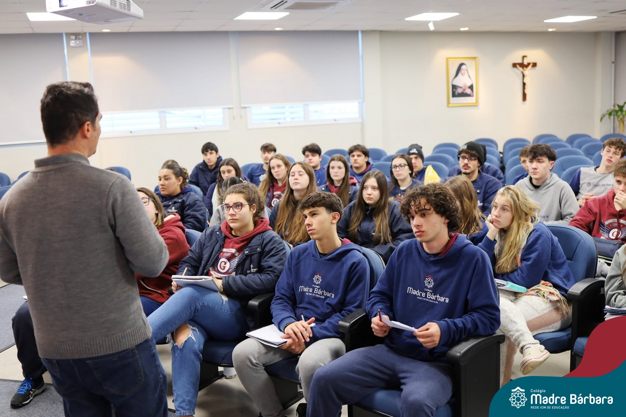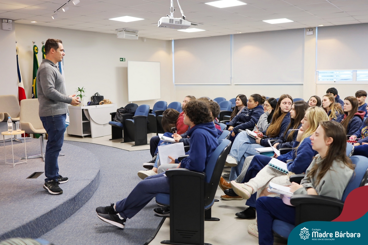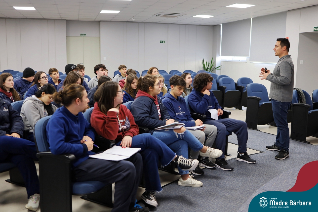 Os estudantes do 3º ano do Ensino Médio participaram de uma enriquecedora palestra com o médico veterinário Dr. Felipe Lopes Campos, fiscal Estadual Agropecuário da Secretaria da Agricultura, Pecuária, Produção Sustentável e Irrigação do RS (SEAPI-RS) e coordenador da Seção de Educação Sanitária. Com vasta experiência na área, Dr. Felipe trouxe uma análise profunda sobre as principais zoonoses — doenças que podem ser transmitidas entre animais e seres humanos — destacando seu impacto direto na economia, na saúde coletiva e no desenvolvimento das populações.