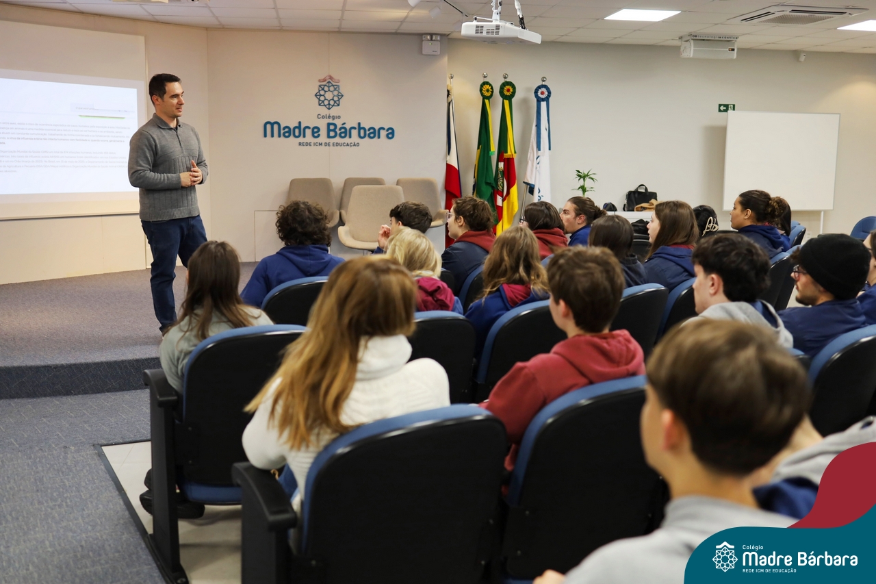 A atividade, que também contou com a presença da médica veterinária Cristina Terra e foi mediada pela professora de Biologia Ângela Lenz, proporcionou uma importante reflexão sobre a relação entre o desequilíbrio ambiental e o surgimento de novos microrganismos patogênicos. A destruição de habitats, o uso inadequado dos recursos naturais e o manejo incorreto da produção animal favorecem o surgimento e a disseminação de doenças, muitas vezes desconhecidas, capazes de alterar drasticamente a dinâmica natural da vida e gerar cenários de crise sanitária global.