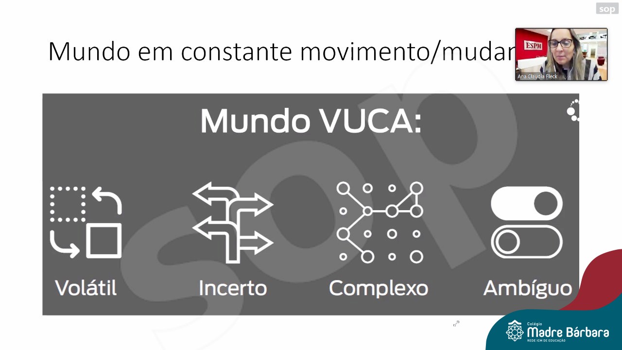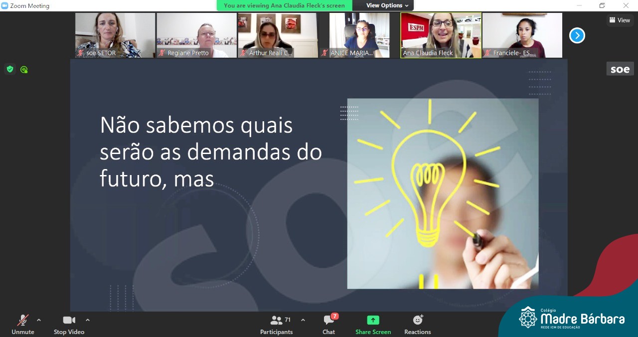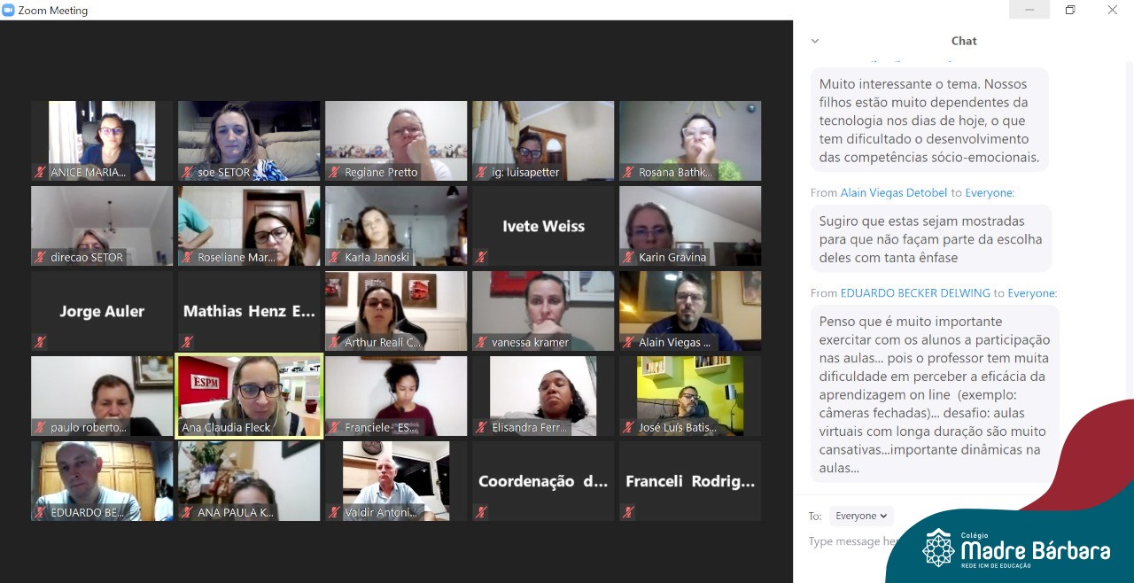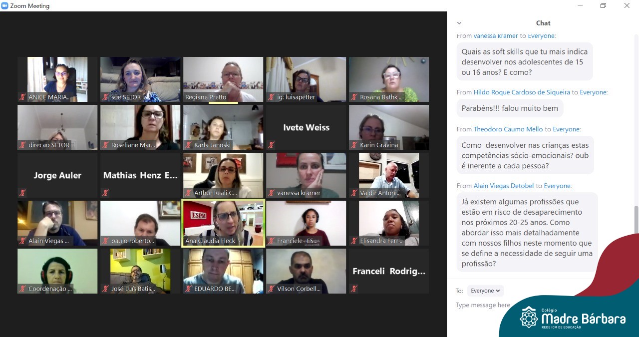 Na noite de segunda-feira (22) ocorreu a Reunião de Famílias das turmas de 1ºs e 2º anos do Ensino Médio do Colégio Madre Bárbara – Rede ICM. A reunião contou com a participação da psicóloga da ESPM, Ana C. Fleck, que realizou uma abordagem para os pais, sobre o papel deles nesta nova etapa na vida de seus filhos, desafiando cada um com reflexões muito significativas. Na oportunidade, a coordenação pedagógica também explanou sobre os instrumentos avaliativos, metodologias e o andamento do processo pedagógico durante o ano letivo de 2021.