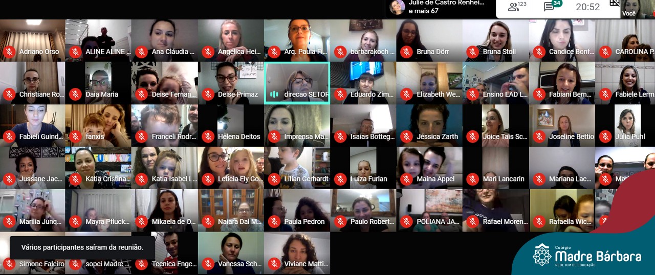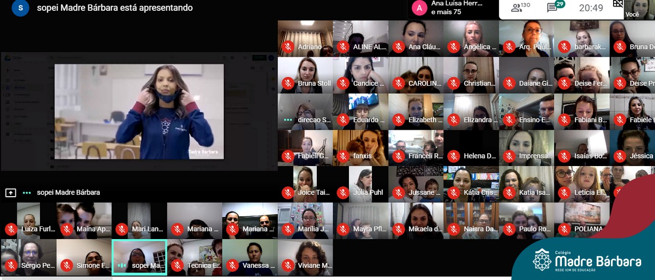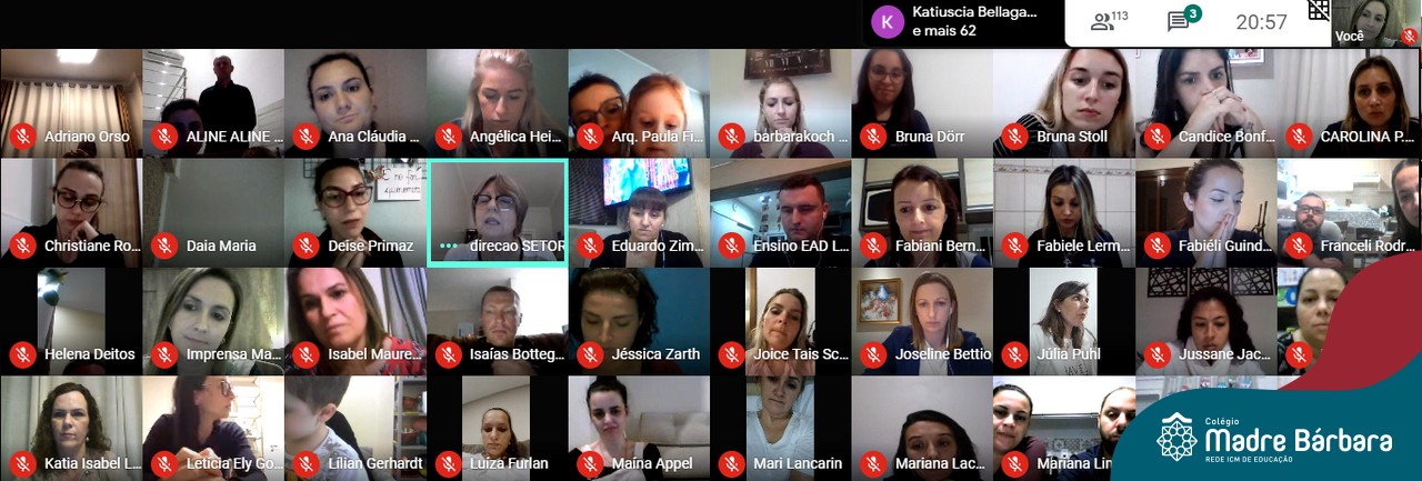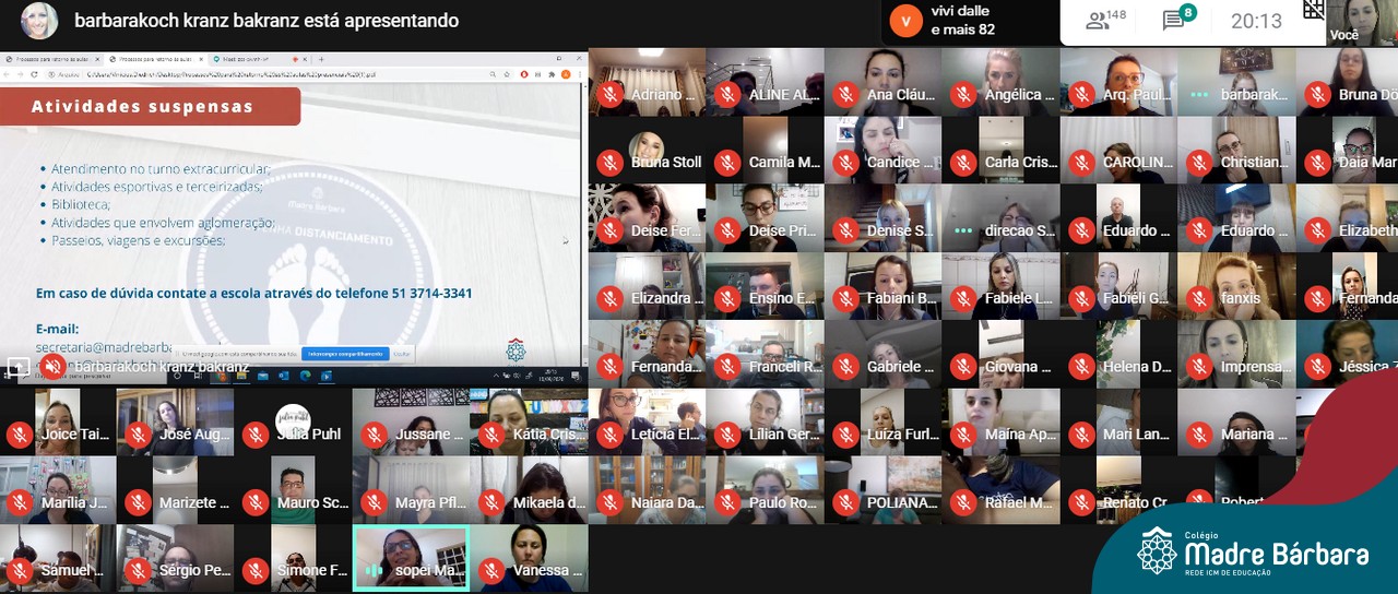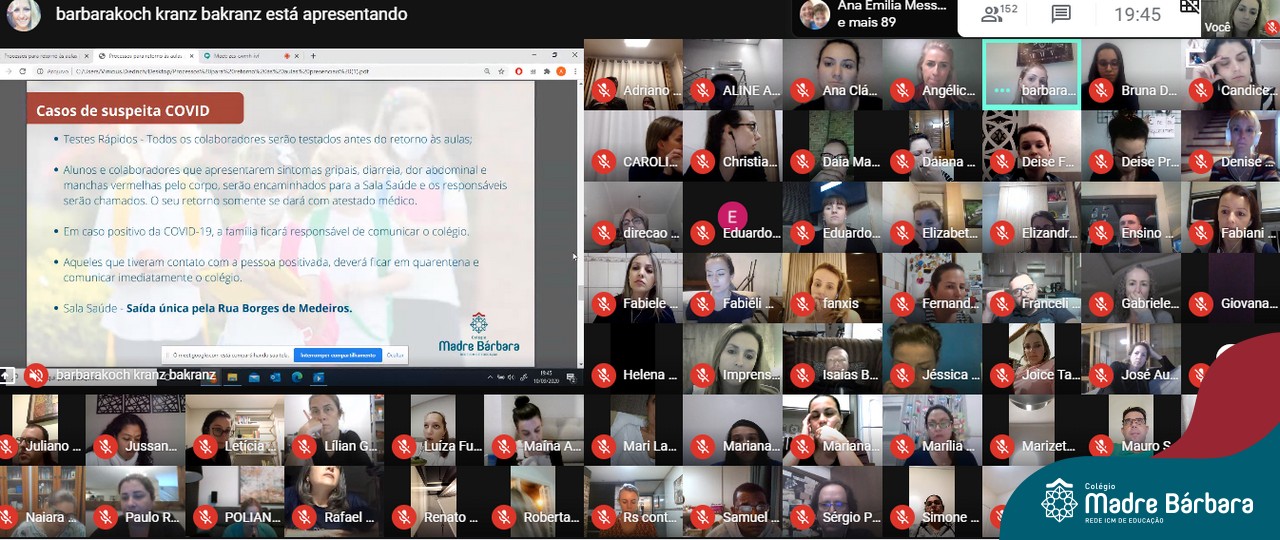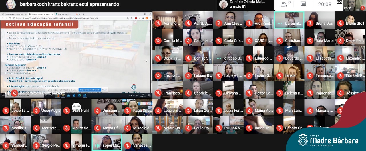 Aproximadamente 150 pais e mães dos Níveis 4 e 5 da Educação Infantil do Colégio Madre Bárbara – Rede ICM participaram da reunião online através da plataforma Google Meet nesta quinta-feira (10.09) sobre o Retorno às Atividades Presenciais. O encontro contou com a participação da coordenação pedagógica, direção e equipe do COE Local. Entre os assuntos debatidos, foi apresentado o Plano de Contingência, foram repassadas orientações sobre os protocolos de segurança do retorno e também apresentadas questões pedagógicas visando o acolhimento e bem-estar das crianças.