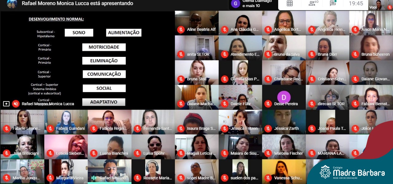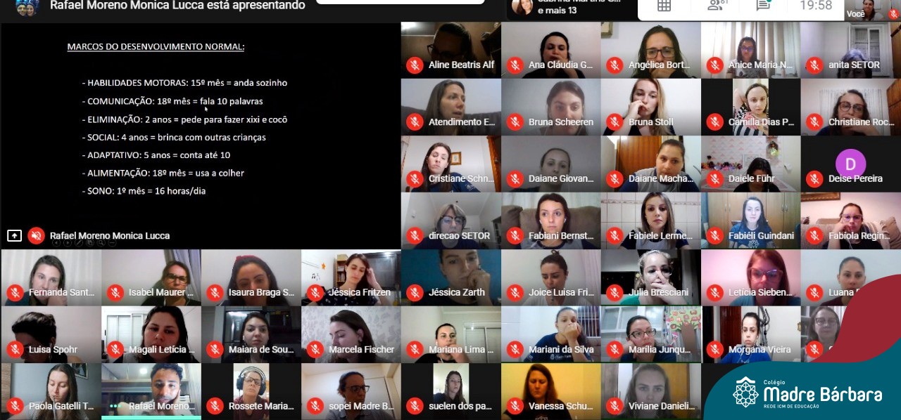 Na noite desta segunda-feira (26) ocorreu por videoconferência via Google Meet a Reunião Pedagógica da Educação Infantil com a participação do Dr. Rafael Moreno com o tema “Marcos do desenvolvimento Infantil”. Foi um momento de muitos aprendizados para a equipe da Educação Infantil do Colégio Madre Bárbara – Rede ICM.