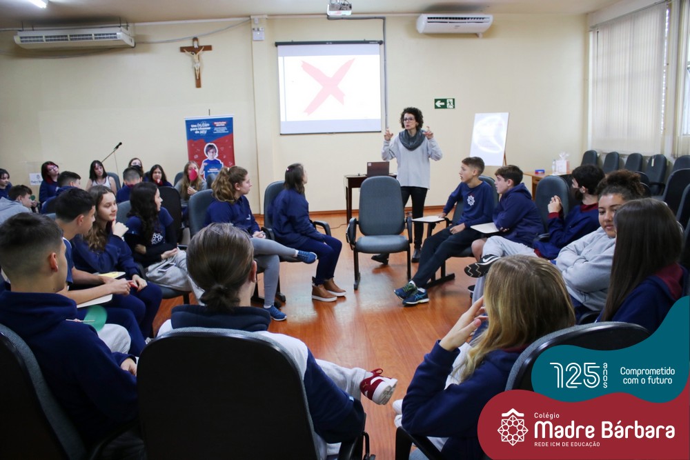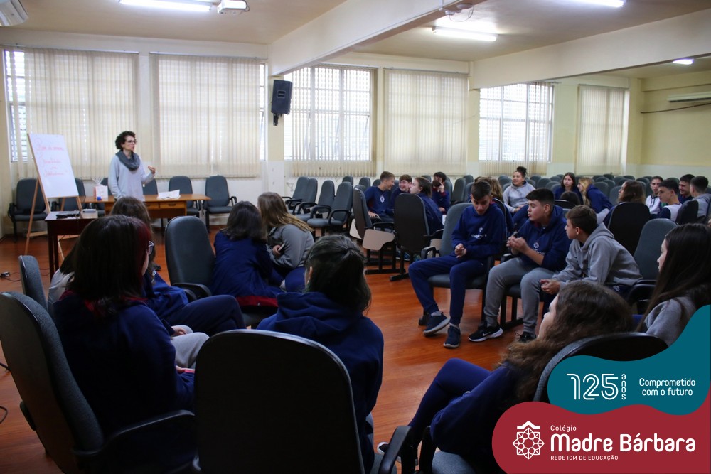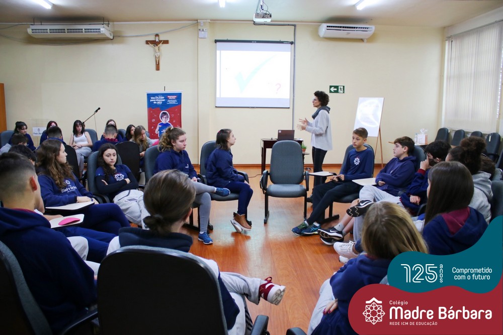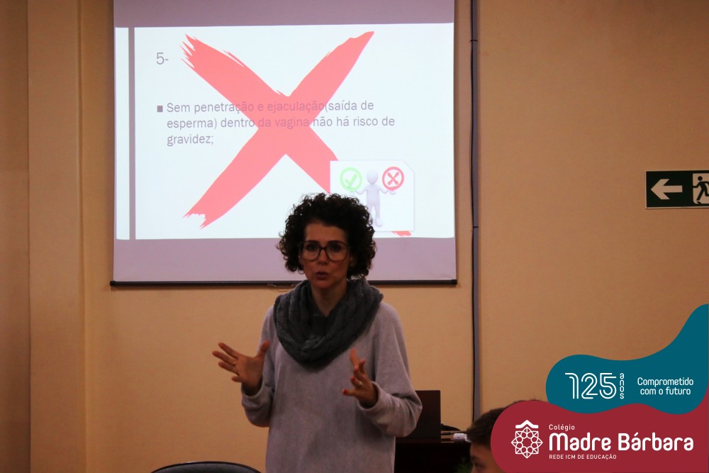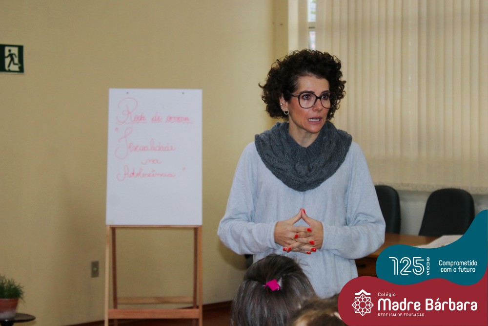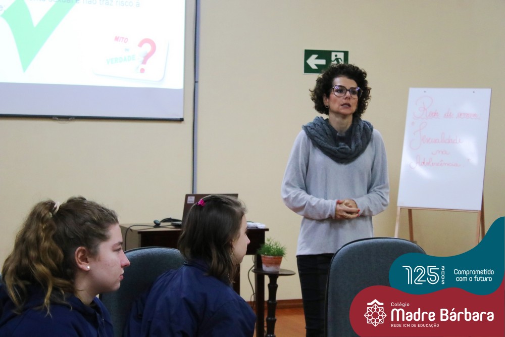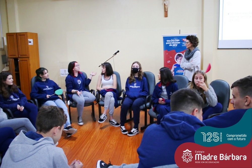 Nesta segunda-feira (02.05) as turmas de 9ºs anos do Ensino Fundamental – Anos Finais (91 e 92) participaram de uma Roda de Conversa sobre o tema “As Manifestações da Sexualidade na Adolescência”, com a médica Letícia Leite, Ginecologista Qualificada em Atendimento com Crianças e Adolescentes. O encontro foi idealizado pelos Serviços de Orientação Educacional e Psicologia Escolar do Colégio Madre Bárbara – Rede ICM.