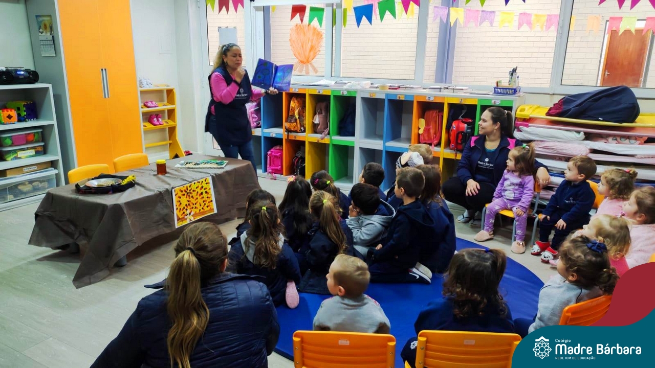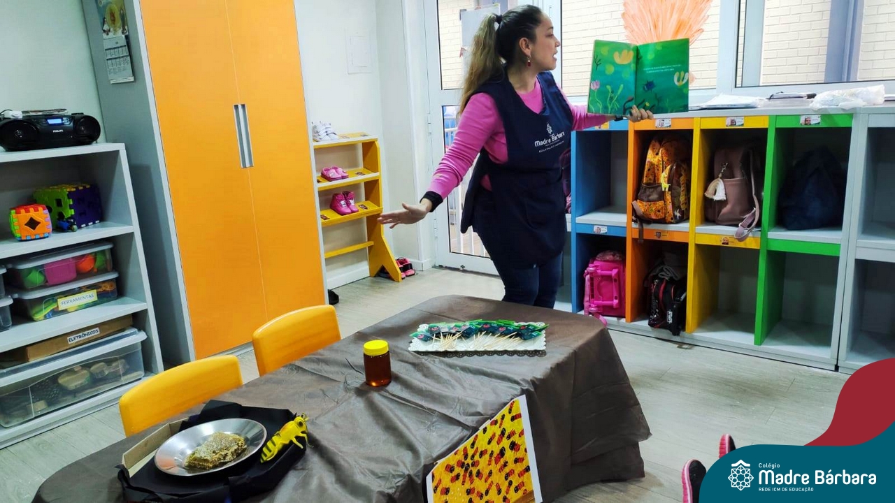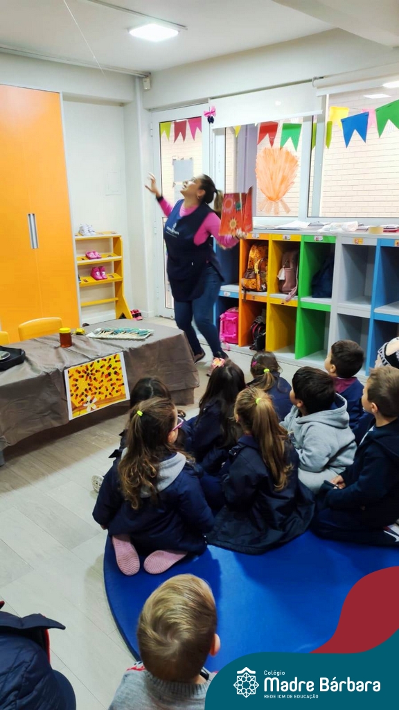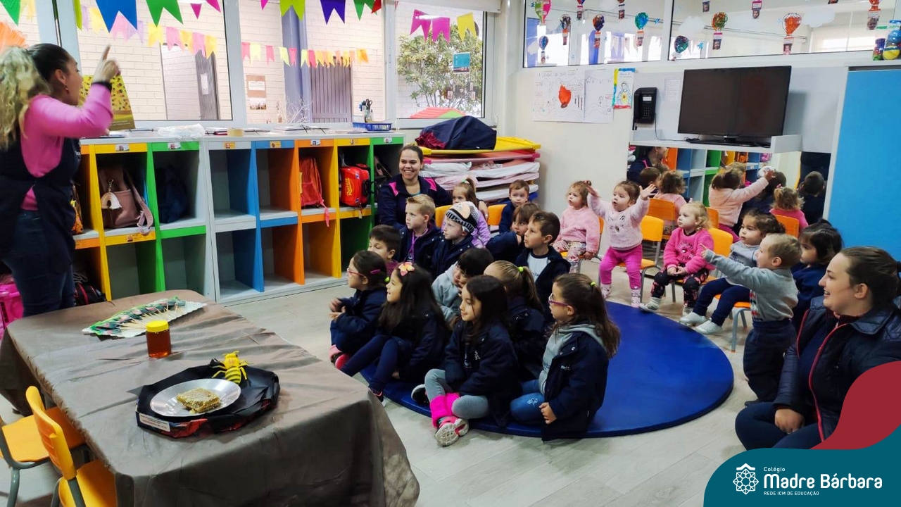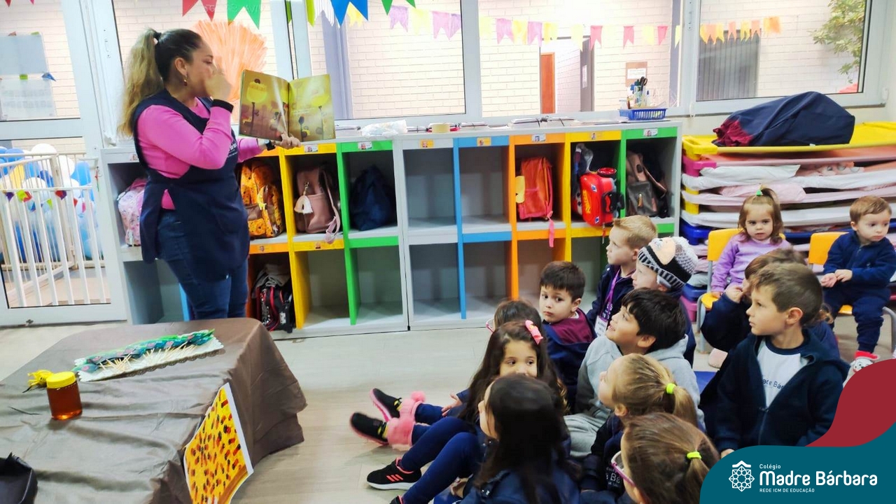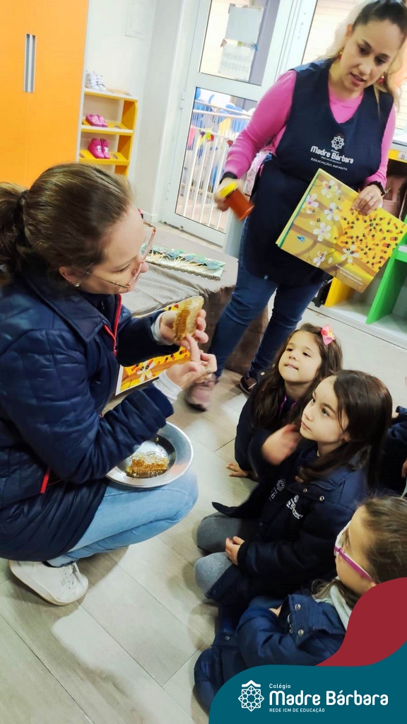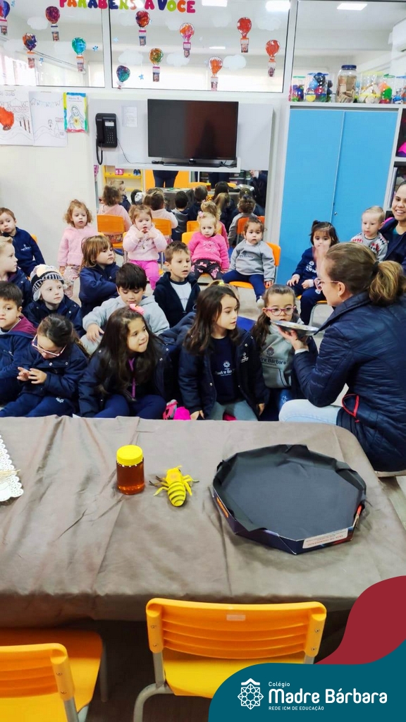 A segunda-feira, 12.06 iniciou diferente para as turmas dos Níveis 1D e 4A. Uma contação de história muito especial foi realizada e as crianças conheceram o livro “Se eu fosse…” de Mies Van Hout que trouxe o encanto dos bichinhos. Joaninhas, borboletas, gafanhotos, abelhas… surgiram nas páginas e as crianças se divertiram com a encenação das professoras Julia e Marilaine e as monitoras Eduarda e Vandressa. Depois de conhecer esta linda história, as crianças puderam ver, cheirar e tocar num favo de mel que as abelhinhas trabalhadoras produziram e o cheirinho gostoso deixou a sala ainda mais perfumada. Esta linda integração entre turmas foi oportunizada uma vez que ambas turmas estão com projetos envolvendo pequenos animais e com certeza muitas outras situações irão acontecer.
