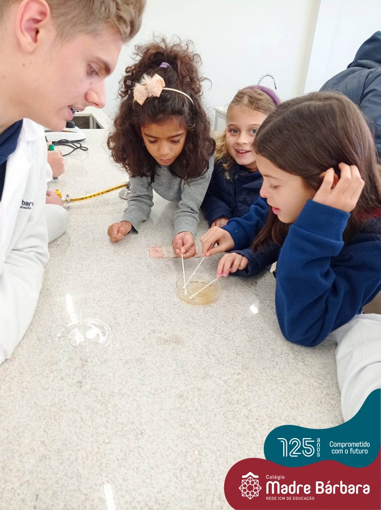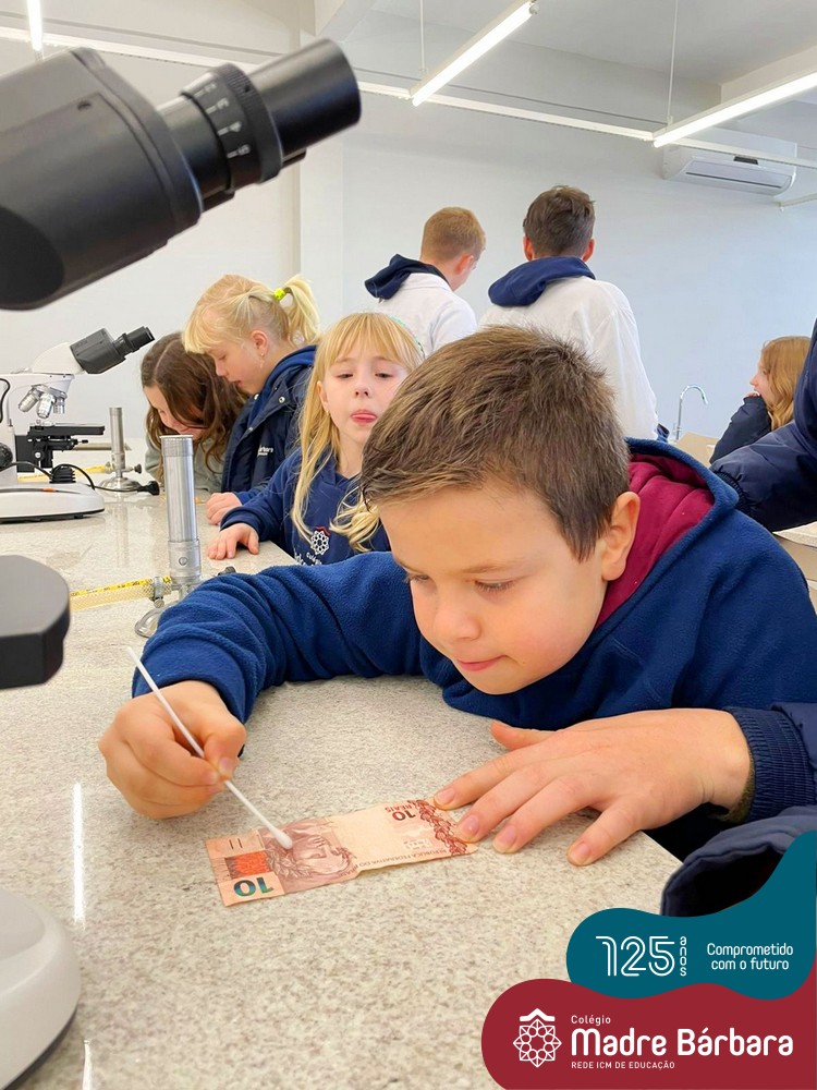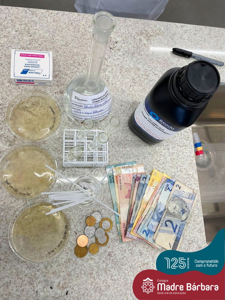 As turmas do Segundos Anos, do Colégio Madre Bárbara – Rede ICM, juntamente com as suas professoras Bruna, Caroline, Mara e Marina estão desenvolvendo um trabalho de pesquisa para a Mostra Científico–Pedagógica e dentre os assuntos pesquisados, os alunos demonstraram interesse em saber se no dinheiro havia bactérias. Com o objetivo de descobrir este mistério, contaram com a ajuda dos alunos do 3º ano do Ensino Médio, da professora Ângela Lenz e da Camila Rockenbach, monitora do laboratório. Após coletarem amostras das cédulas e moedas, aguardaram uma semana para observarem os resultados, aprendendo assim algo muito importante: “Na Ciência é preciso ter paciência”. Para surpresa de todos, viram que no dinheiro observado haviam muitas bactérias. Desta forma, perceberam a importância de serem líderes proativos, tendo mais cuidados ao manusear o dinheiro e também alertando as pessoas sobre a importância de lavar as mãos, passando esse conhecimento adiante.