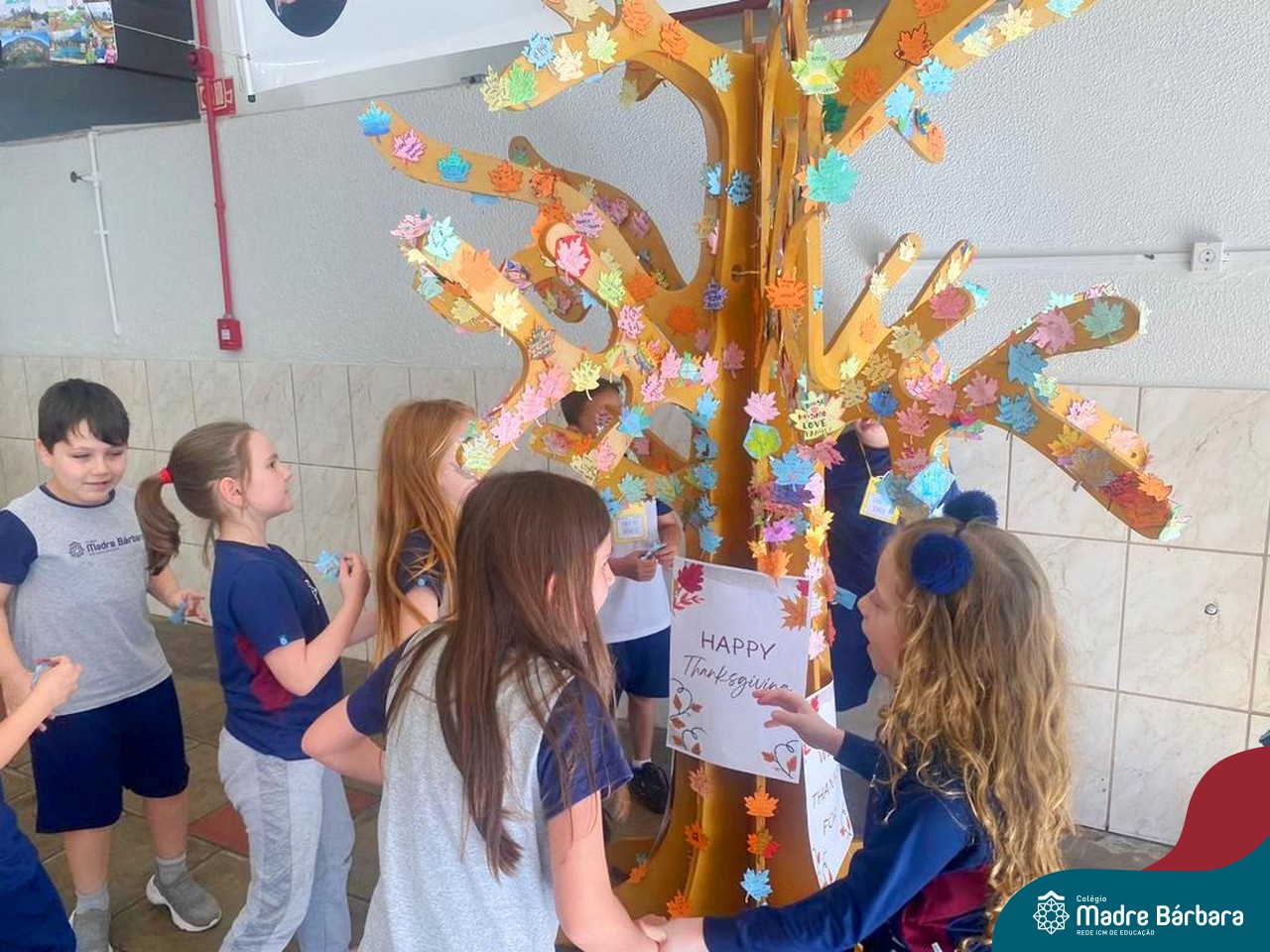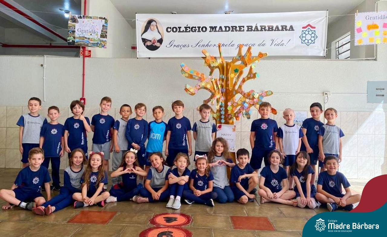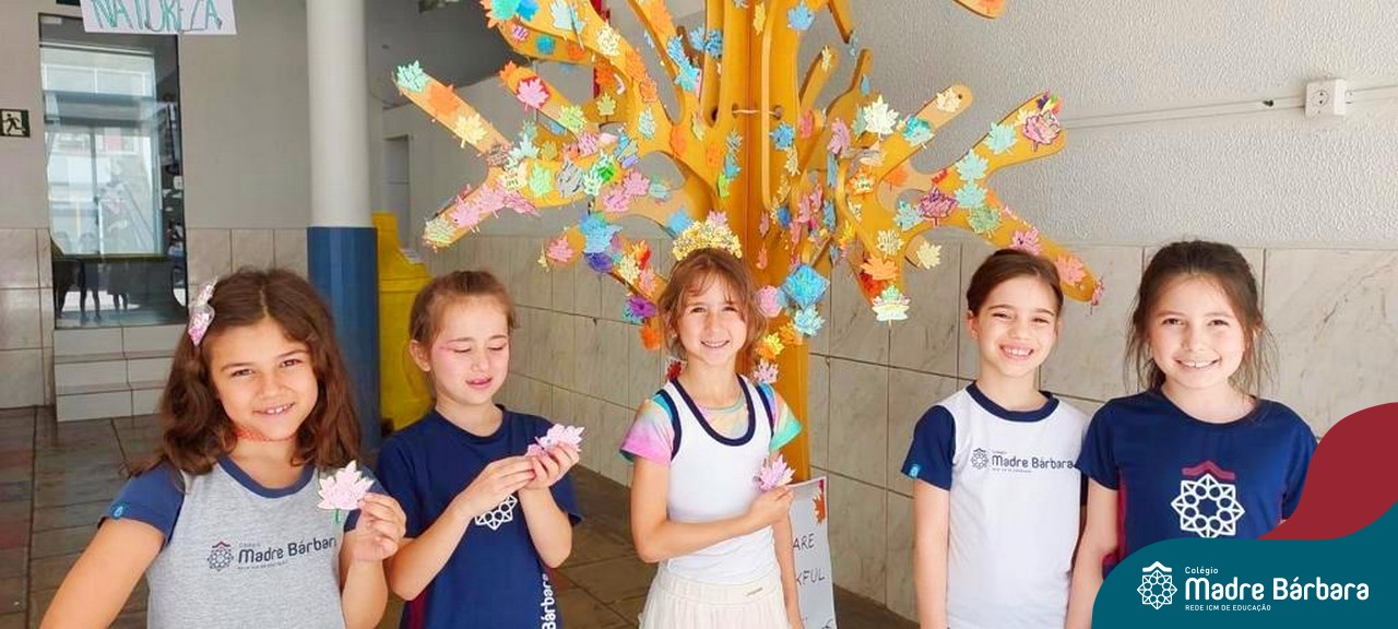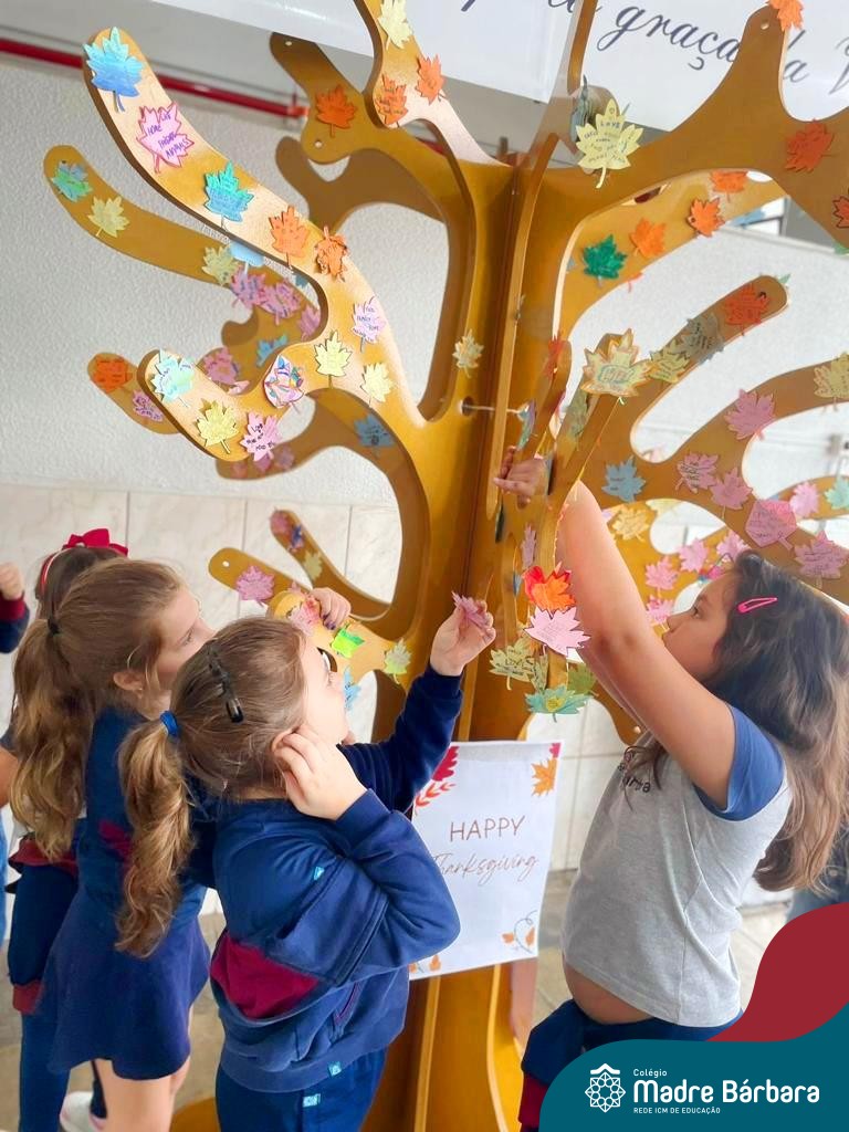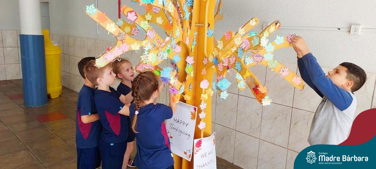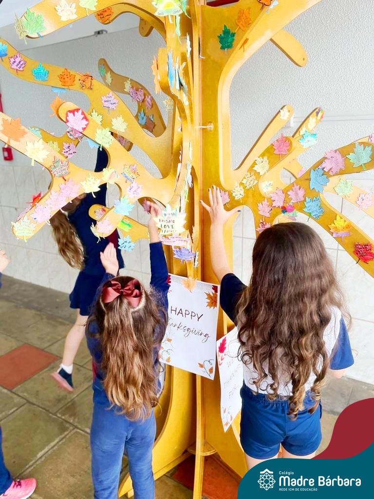 O Dia de Ação de Graças, ou Thanksgiving Day, é um feriado tradicional nos Estados Unidos. É o dia de manifestar gratidão pelas conquistas alcançadas. Essa importante data motivou uma atividade na disciplina de Inglês. Coordenados pelas teachers dos anos iniciais, Bruna e Mariana, os alunos confeccionaram folhas, nas quais escreveram os motivos pelos quais são gratos. As folhas foram coladas pelas turmas em nossa árvore da liderança que se transformou em uma grande árvore da gratidão.