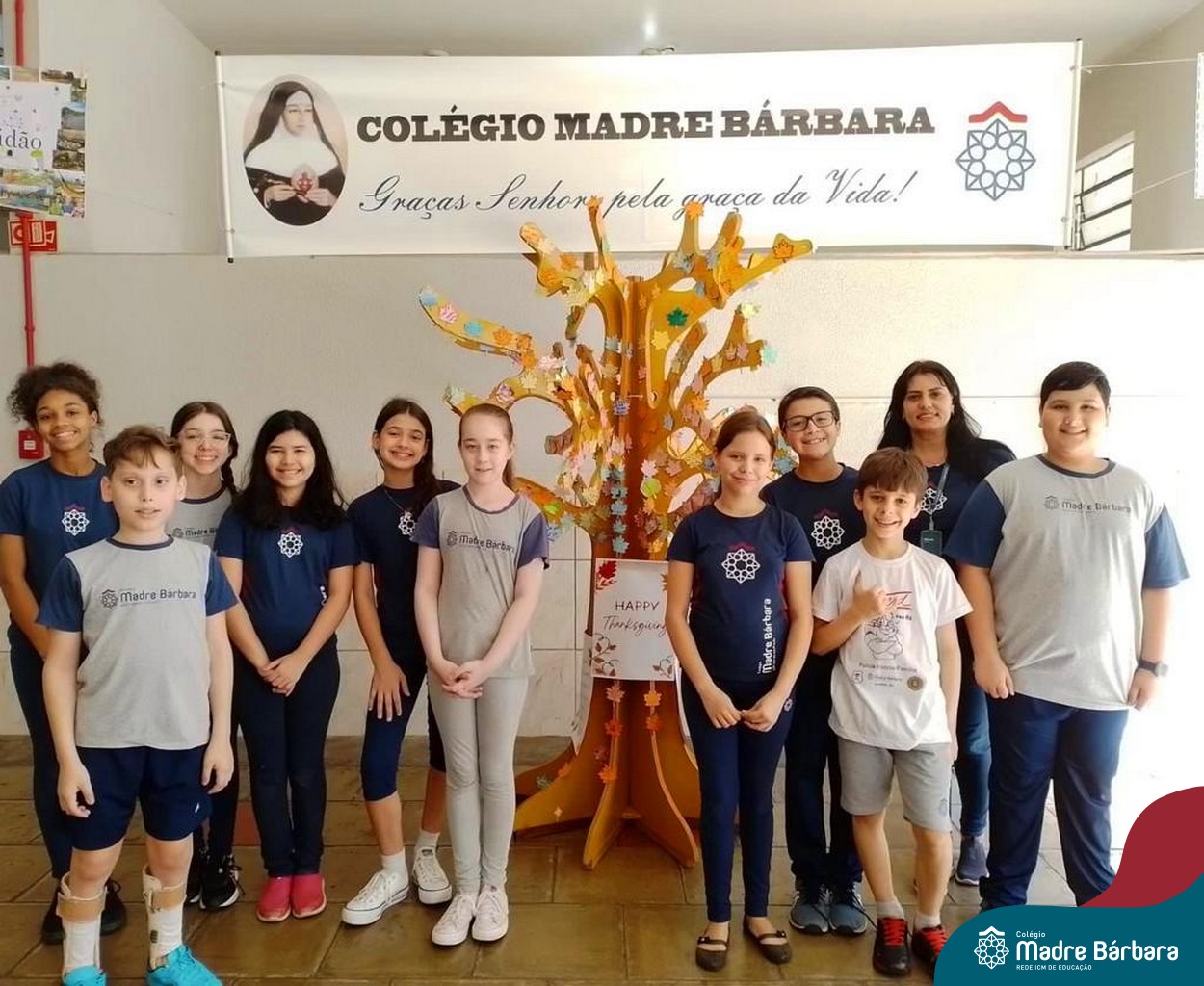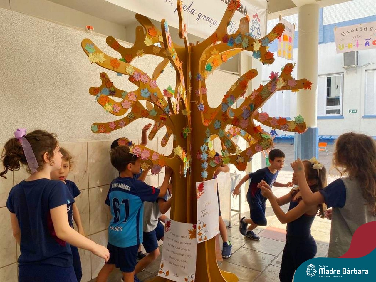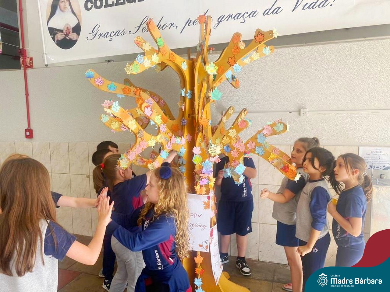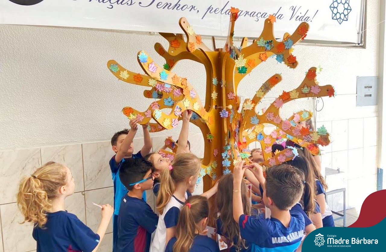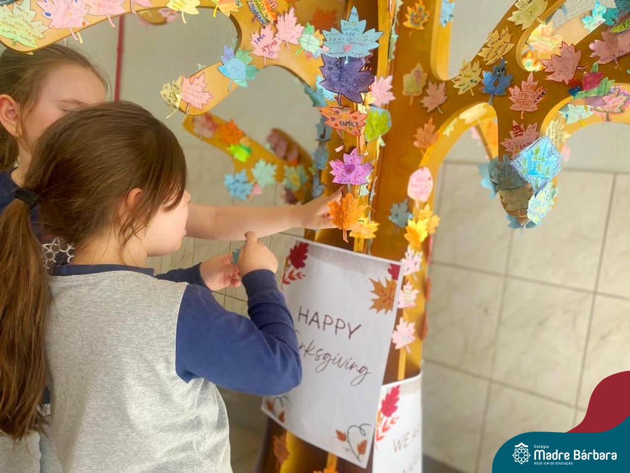 O Dia de Ação de Graças, ou Thanksgiving Day, é um feriado tradicional nos Estados Unidos. É o dia de manifestar gratidão pelas conquistas alcançadas. Essa importante data motivou uma atividade na disciplina de Inglês. Coordenados pelas teachers dos anos iniciais, Bruna e Mariana, os alunos confeccionaram folhas, nas quais escreveram os motivos pelos quais são gratos. As folhas foram coladas pelas turmas em nossa árvore da liderança que se transformou em uma grande árvore da gratidão.