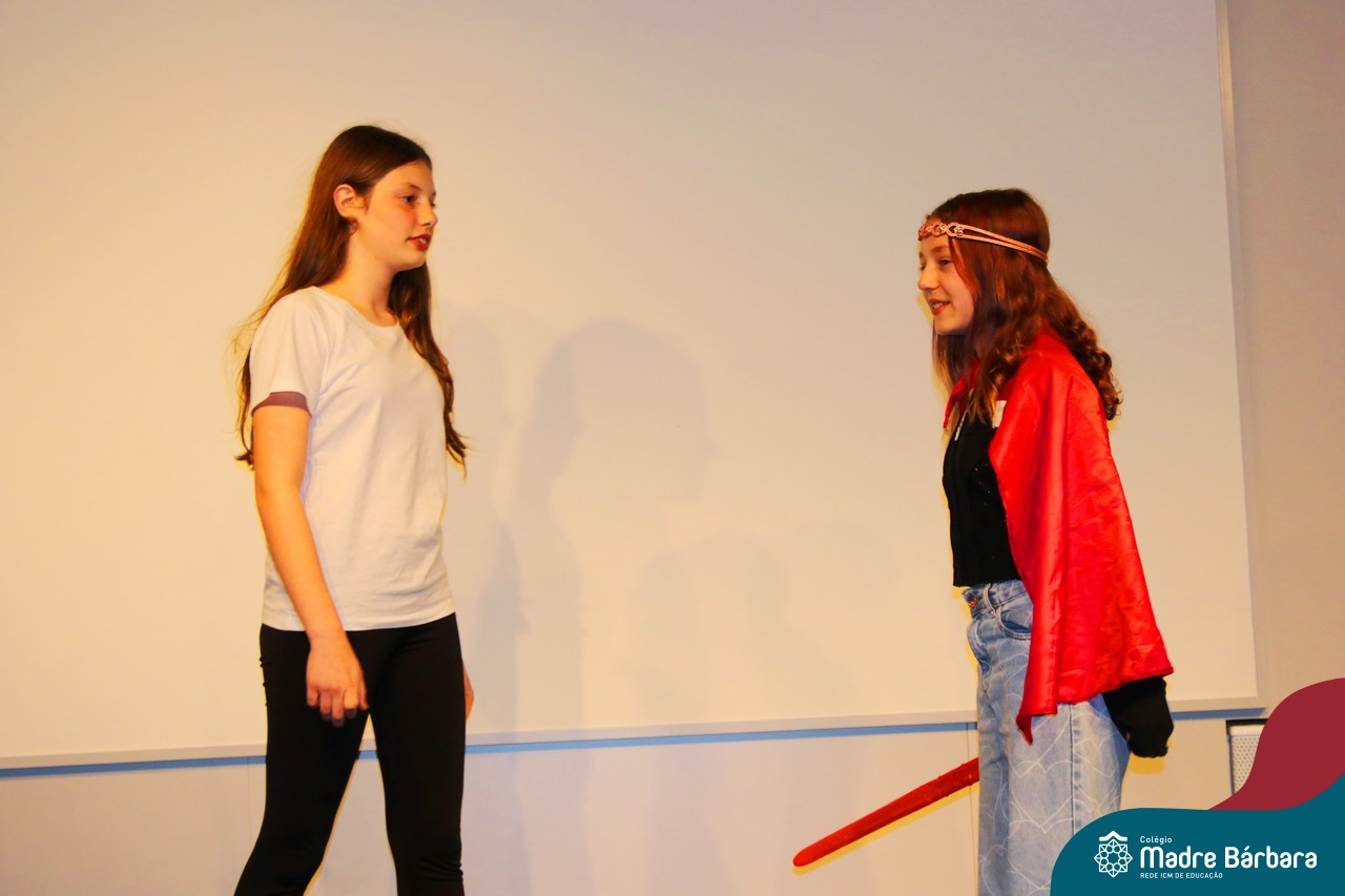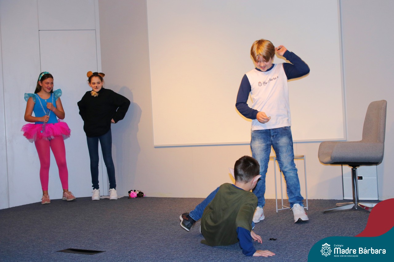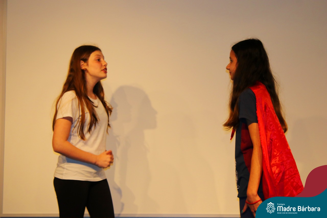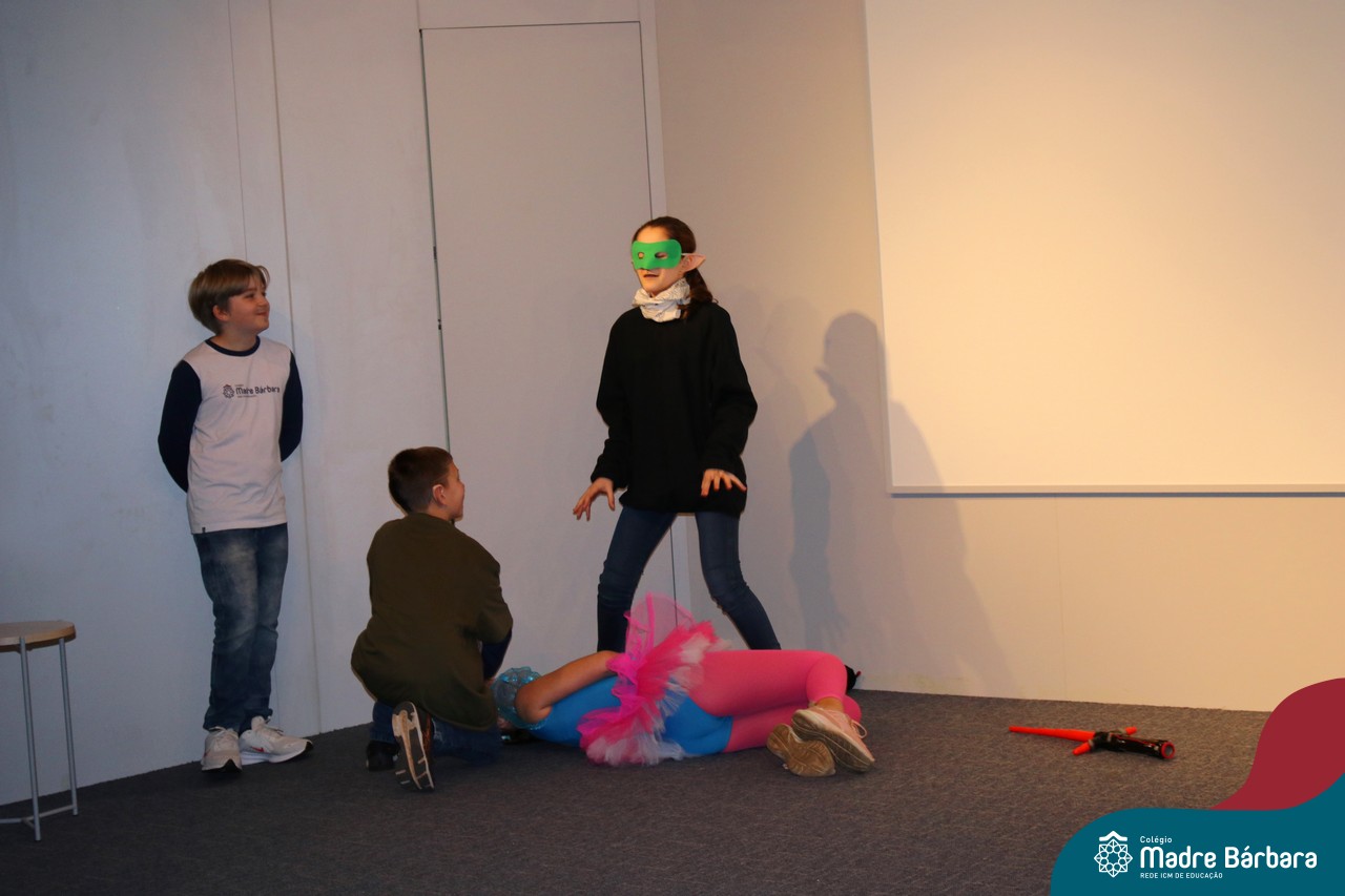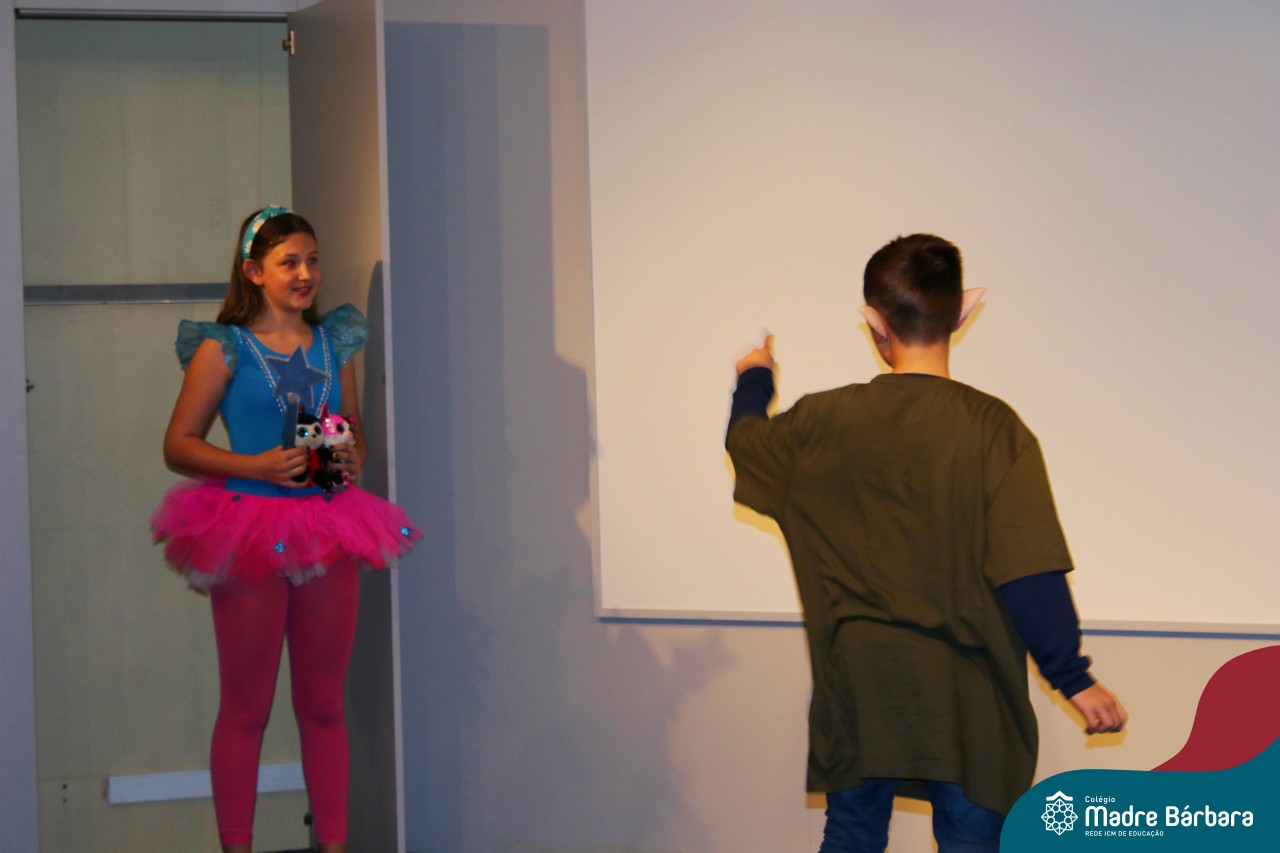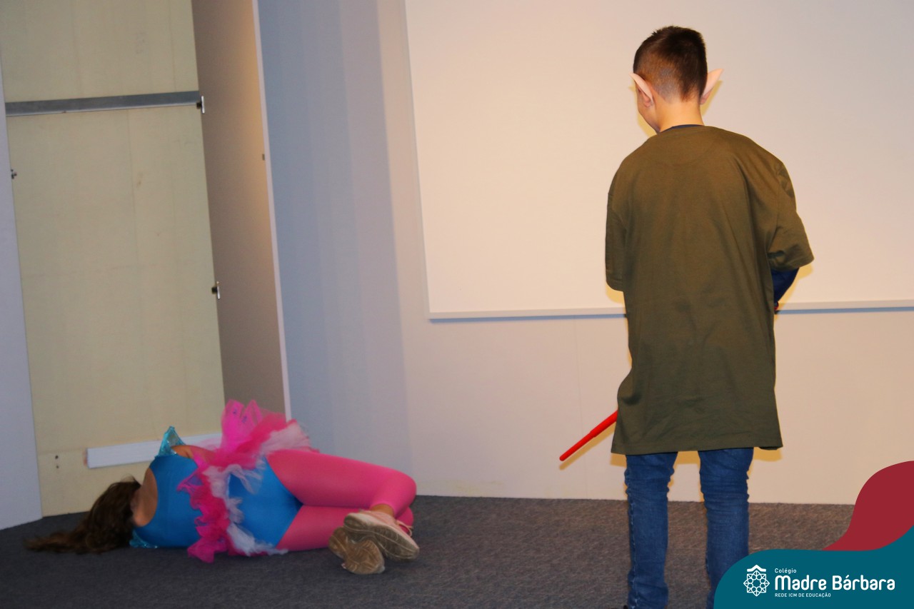 Os estudantes dos Anos Finais estão trabalhando o teatro e seus múltiplos olhares na disciplina de arte com a professora Cristiane Schneider. Trabalharam com a escrita de roteiro, atividade em grupo, além de figurinos e acessórios cênicos para apresentar frente aos colegas. Precisaram planejar o cenário, figurino, texto, maquiagem e todos os itens tinham que aparecer em cena. Na última semana, os estudantes dos 6ºs anos estiveram no miniauditório apresentando as peças teatrais de suas autorias.