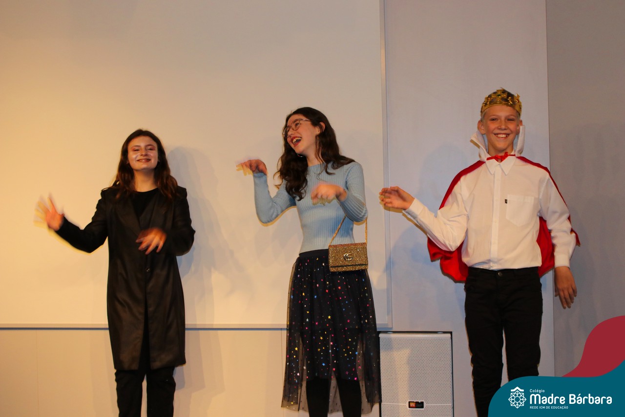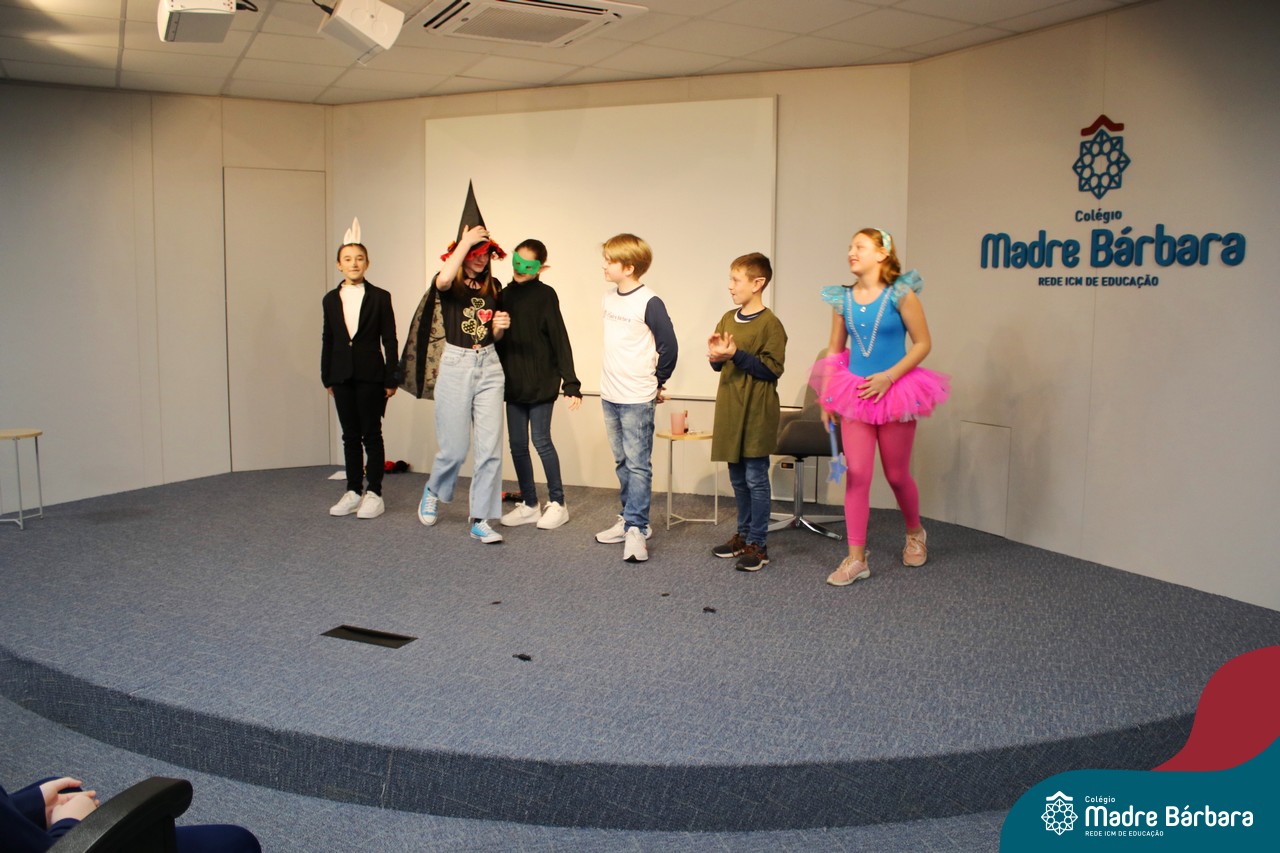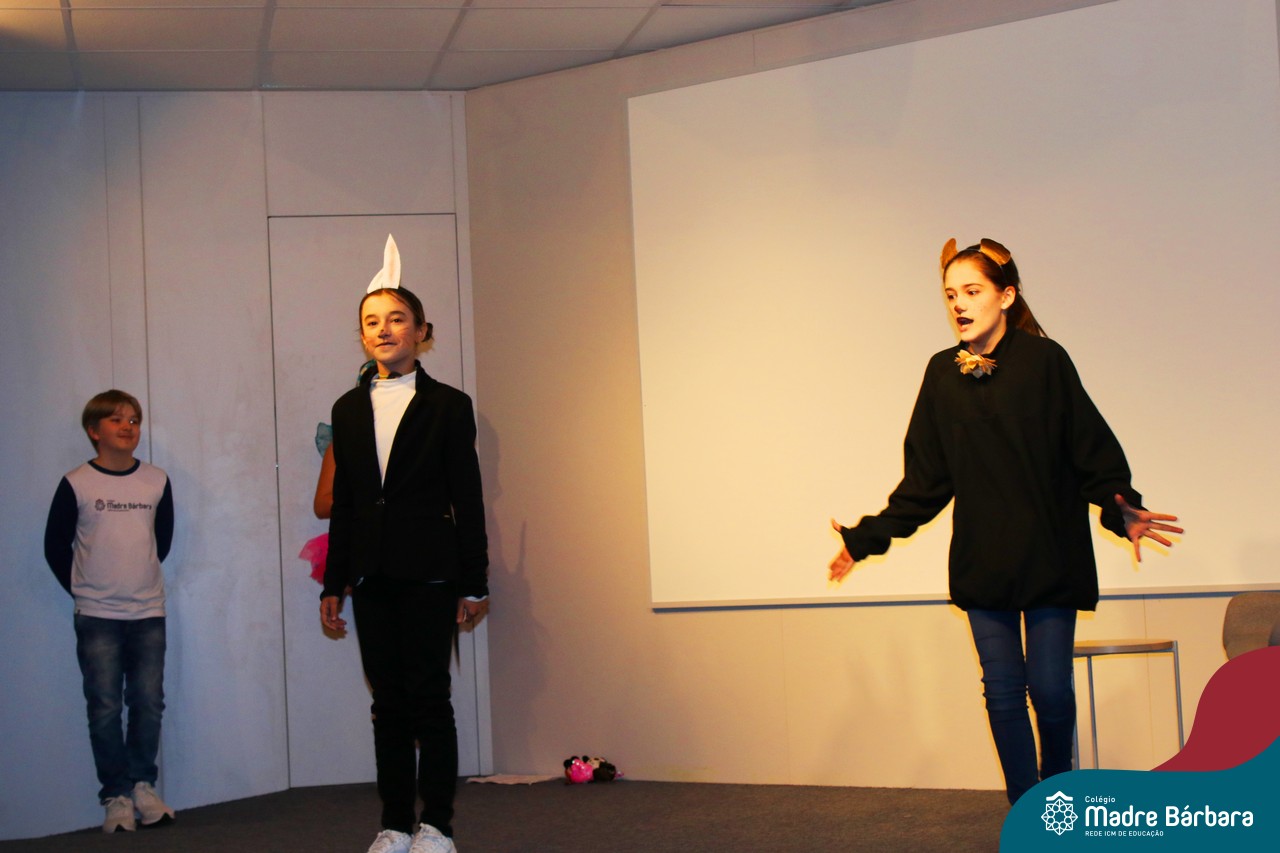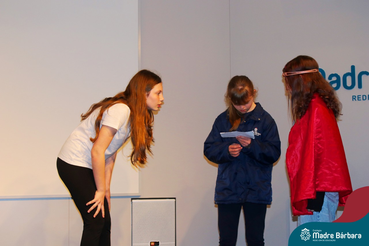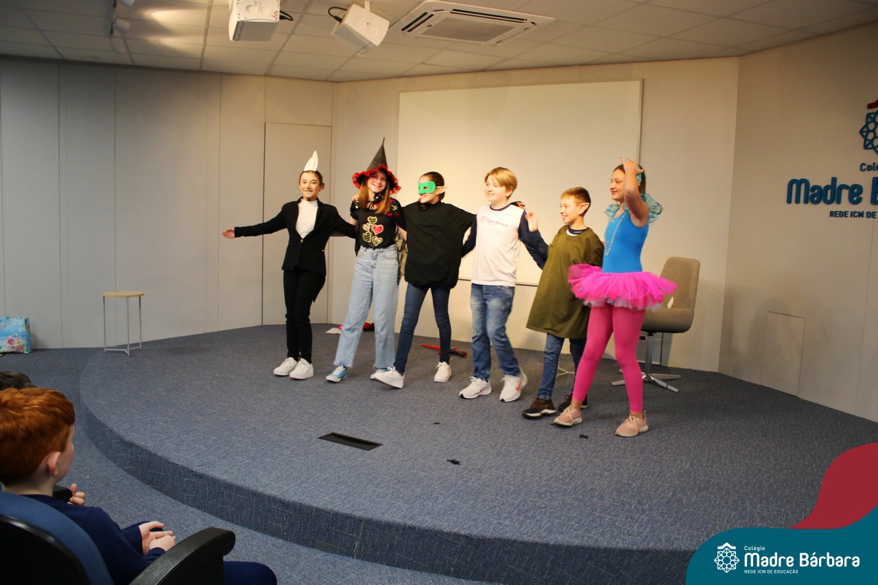 Os estudantes dos Anos Finais estão trabalhando o teatro e seus múltiplos olhares na disciplina de arte com a professora Cristiane Schneider. Trabalharam com a escrita de roteiro, atividade em grupo, além de figurinos e acessórios cênicos para apresentar frente aos colegas. Precisaram planejar o cenário, figurino, texto, maquiagem e todos os itens tinham que aparecer em cena. Na última semana, os estudantes dos 6ºs anos estiveram no miniauditório apresentando as peças teatrais de suas autorias.