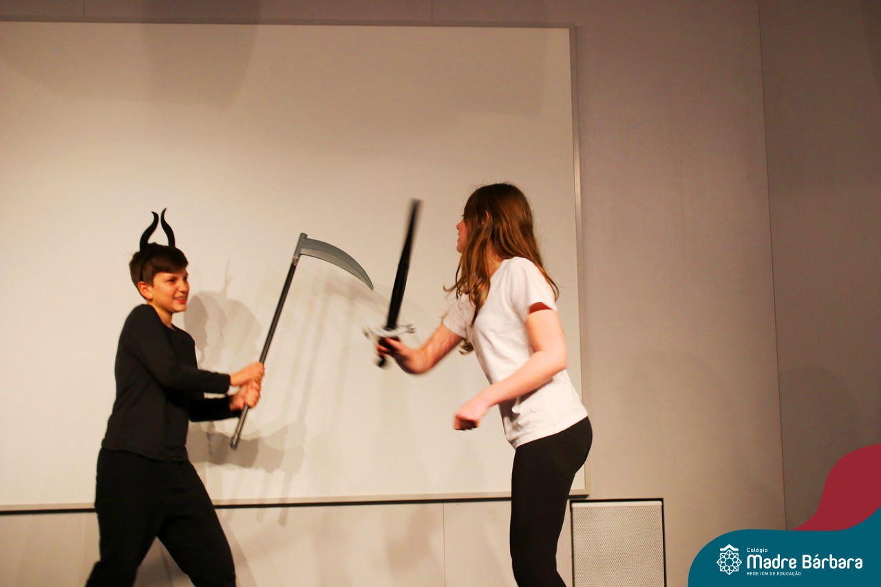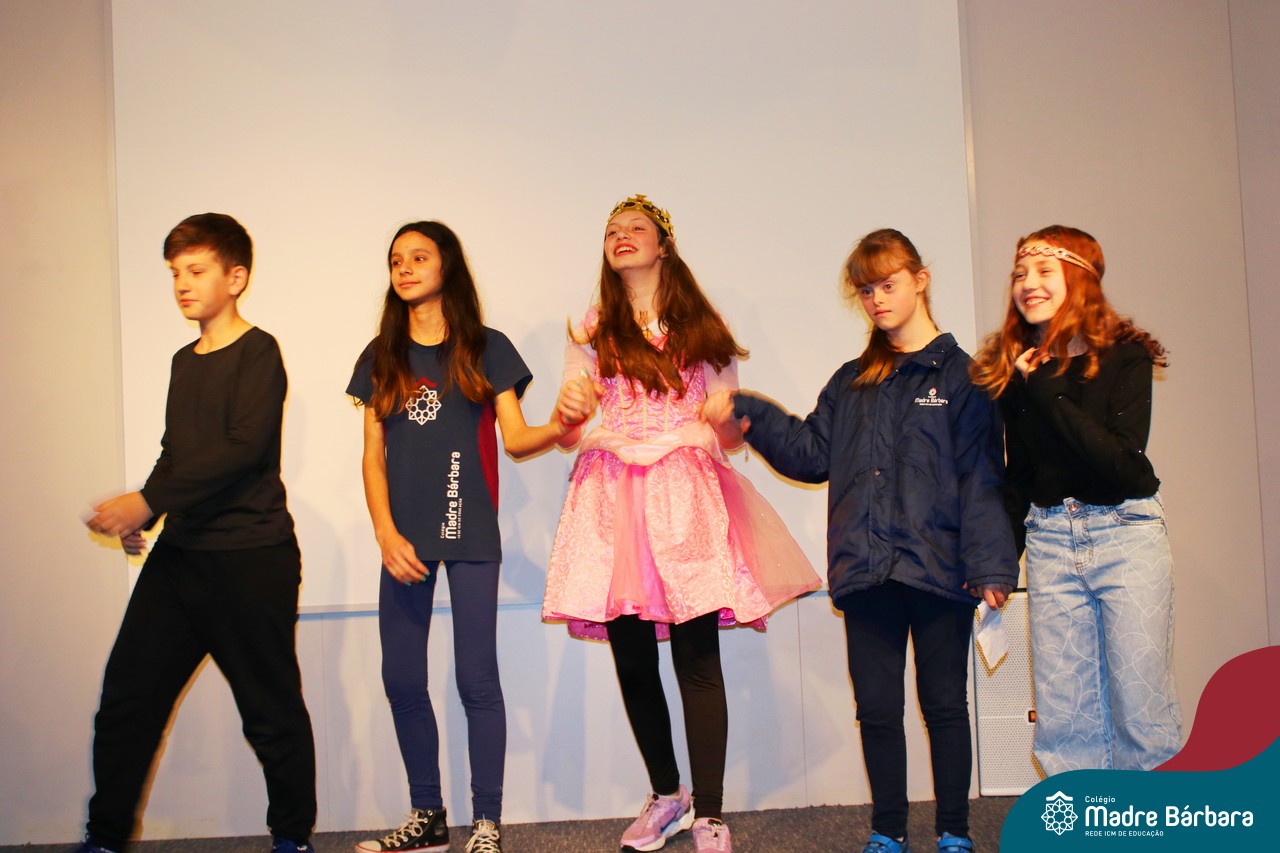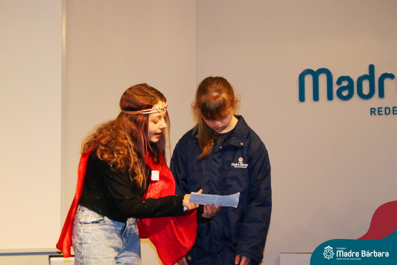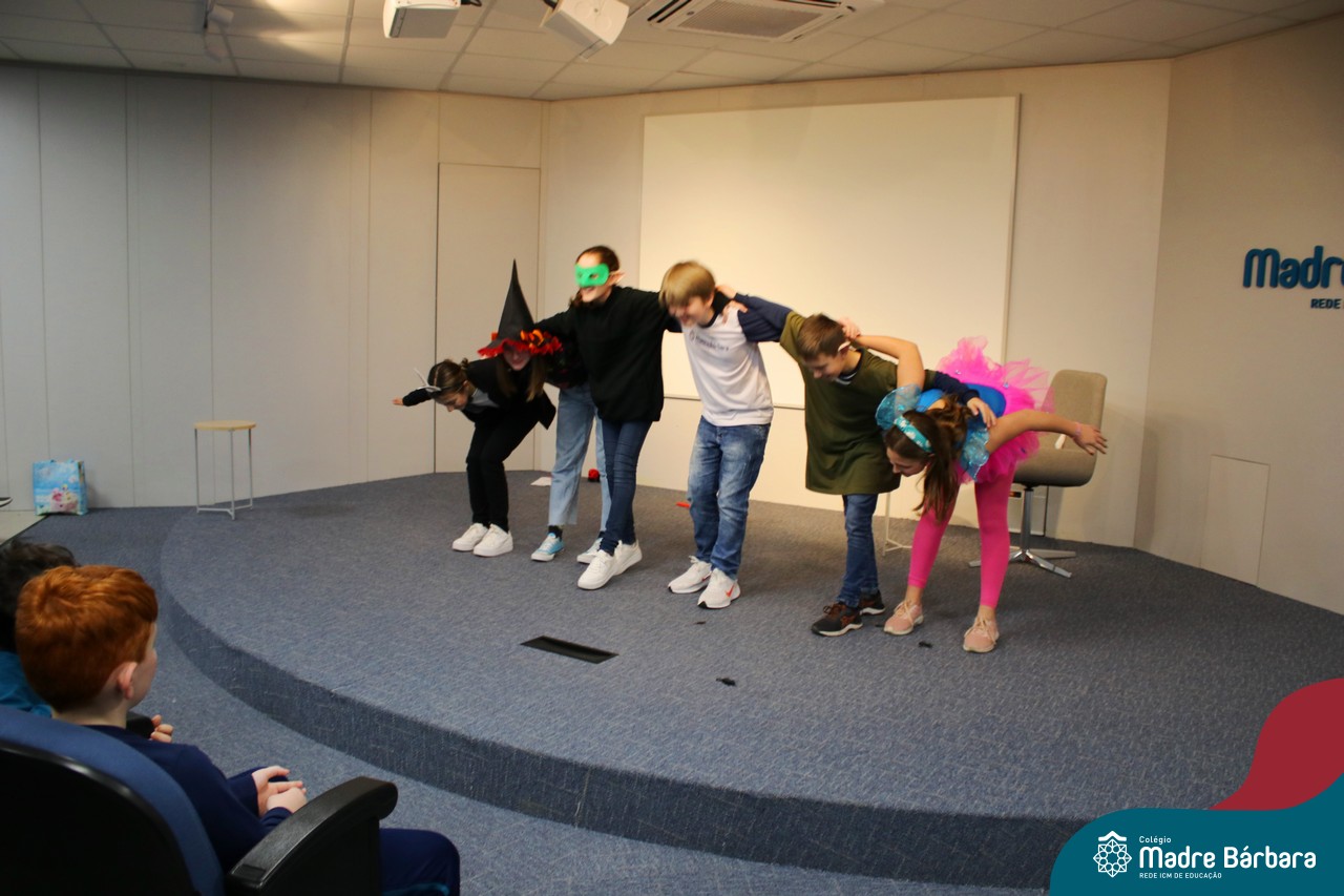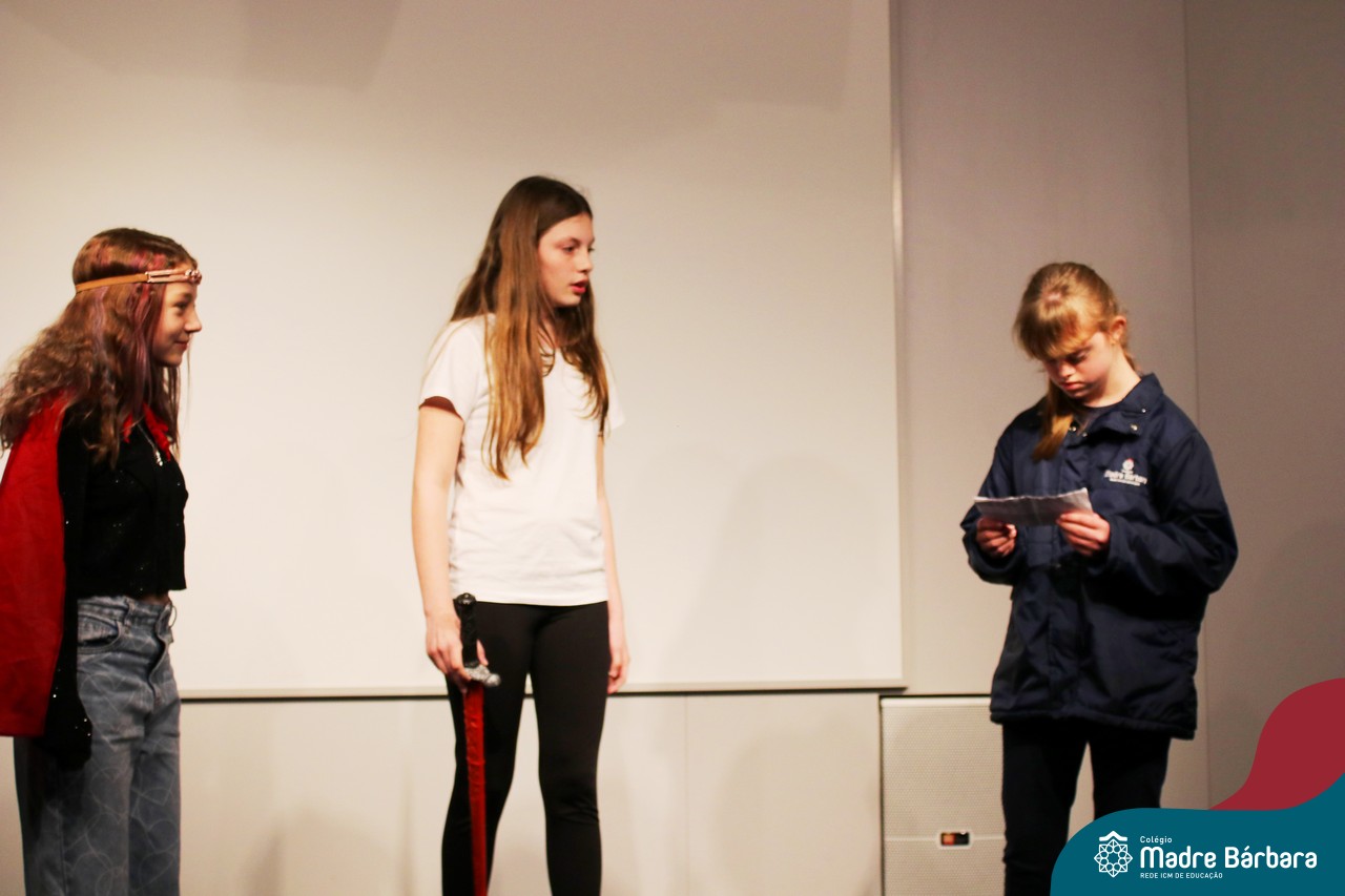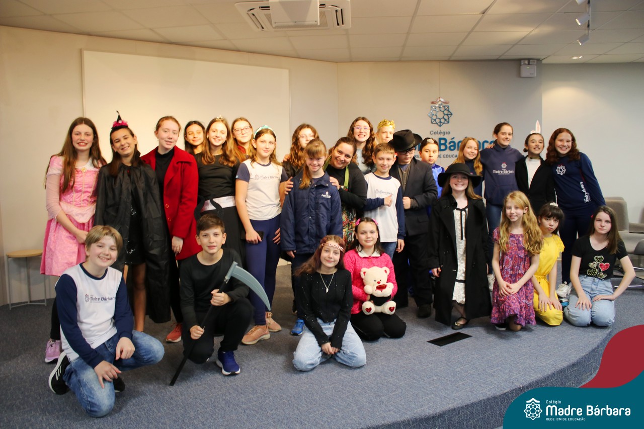 Os estudantes dos Anos Finais estão trabalhando o teatro e seus múltiplos olhares na disciplina de arte com a professora Cristiane Schneider. Trabalharam com a escrita de roteiro, atividade em grupo, além de figurinos e acessórios cênicos para apresentar frente aos colegas. Precisaram planejar o cenário, figurino, texto, maquiagem e todos os itens tinham que aparecer em cena. Na última semana, os estudantes dos 6ºs anos estiveram no miniauditório apresentando as peças teatrais de suas autorias.