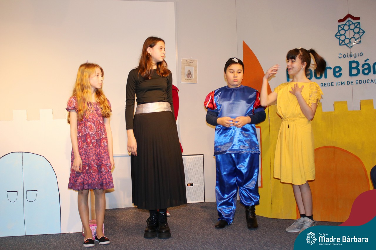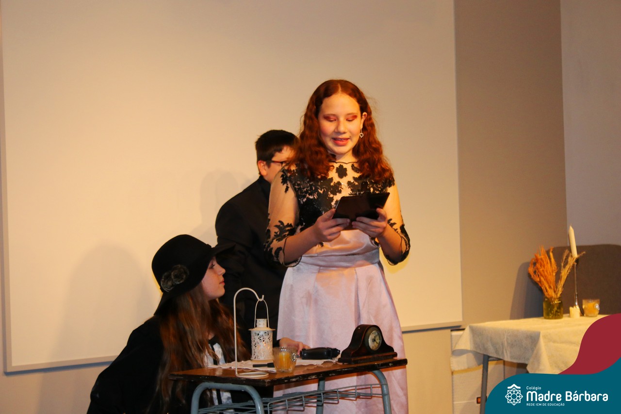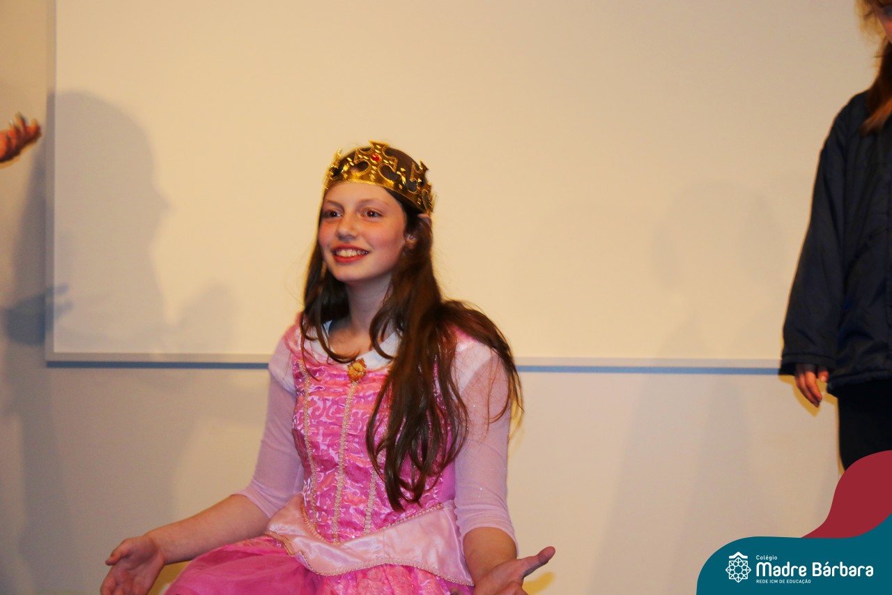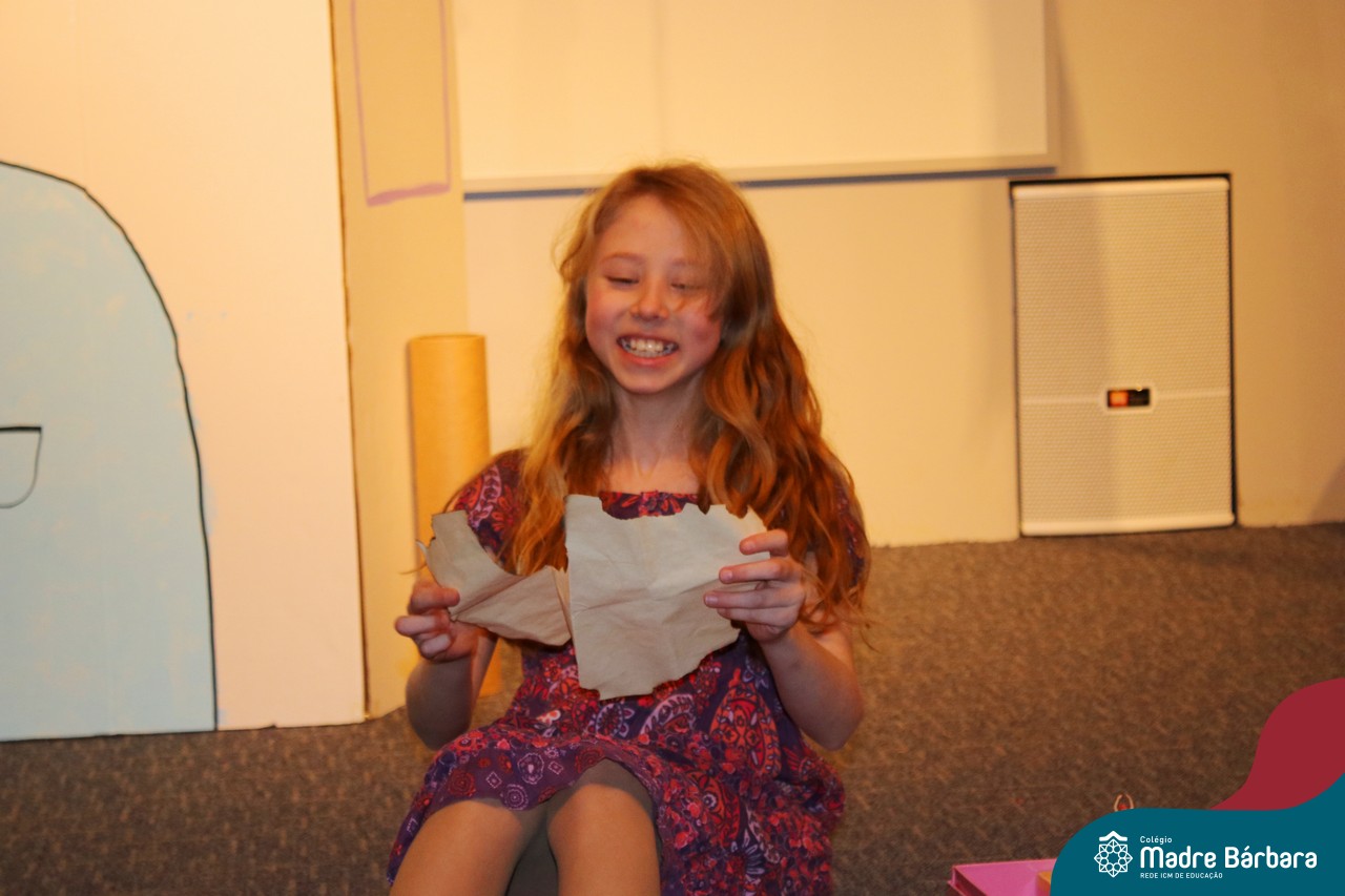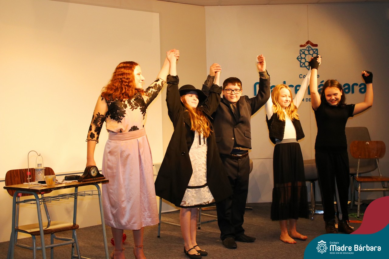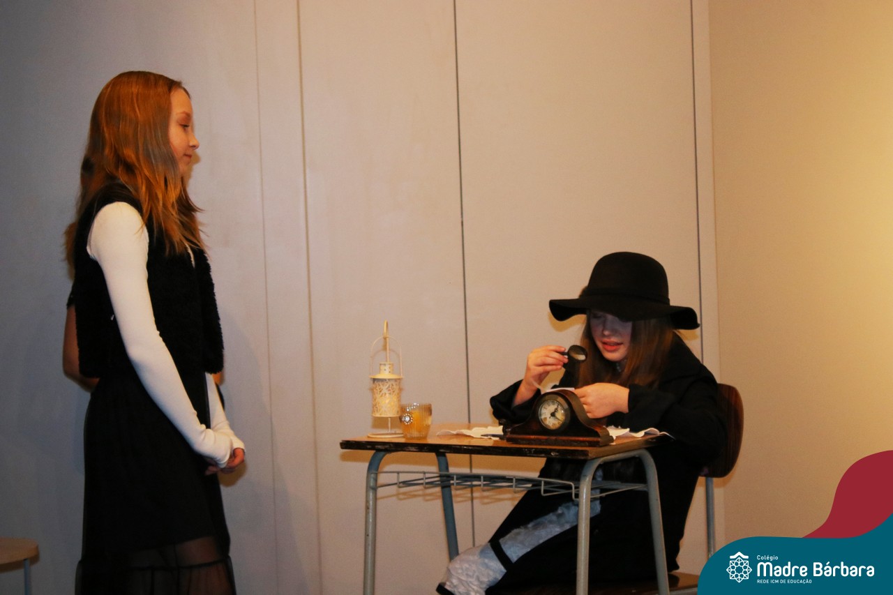 Os estudantes dos Anos Finais estão trabalhando o teatro e seus múltiplos olhares na disciplina de arte com a professora Cristiane Schneider. Trabalharam com a escrita de roteiro, atividade em grupo, além de figurinos e acessórios cênicos para apresentar frente aos colegas. Precisaram planejar o cenário, figurino, texto, maquiagem e todos os itens tinham que aparecer em cena. Na última semana, os estudantes dos 6ºs anos estiveram no miniauditório apresentando as peças teatrais de suas autorias.