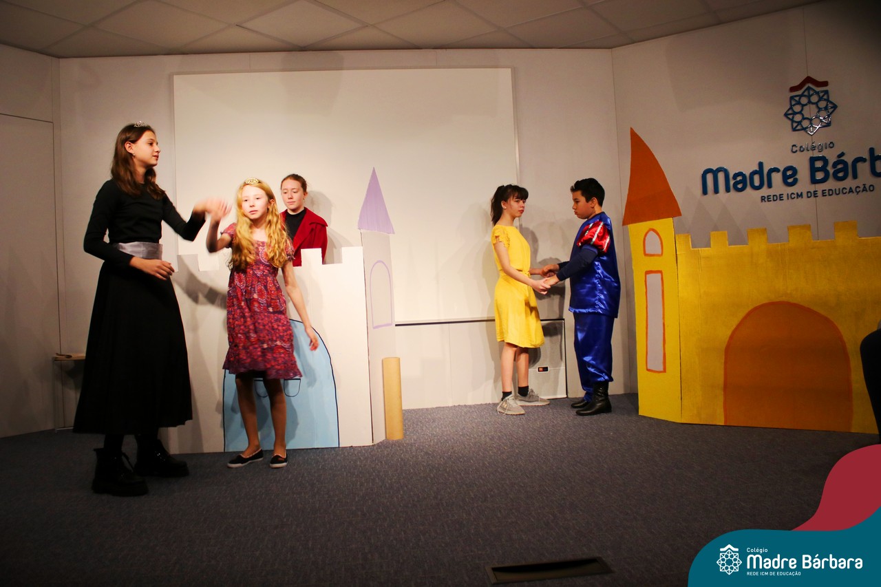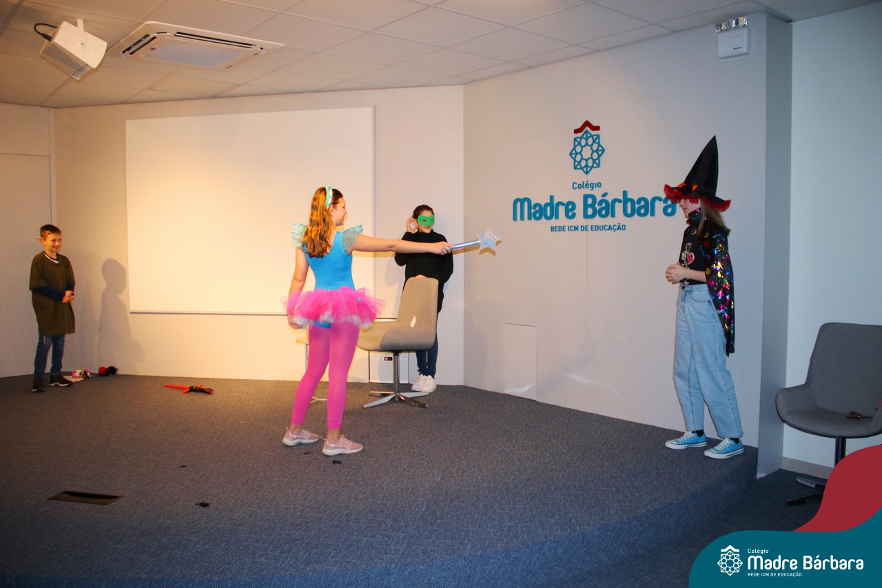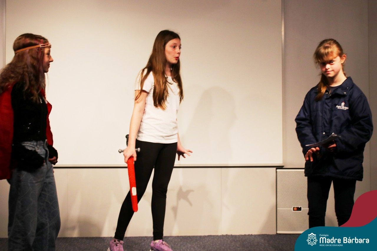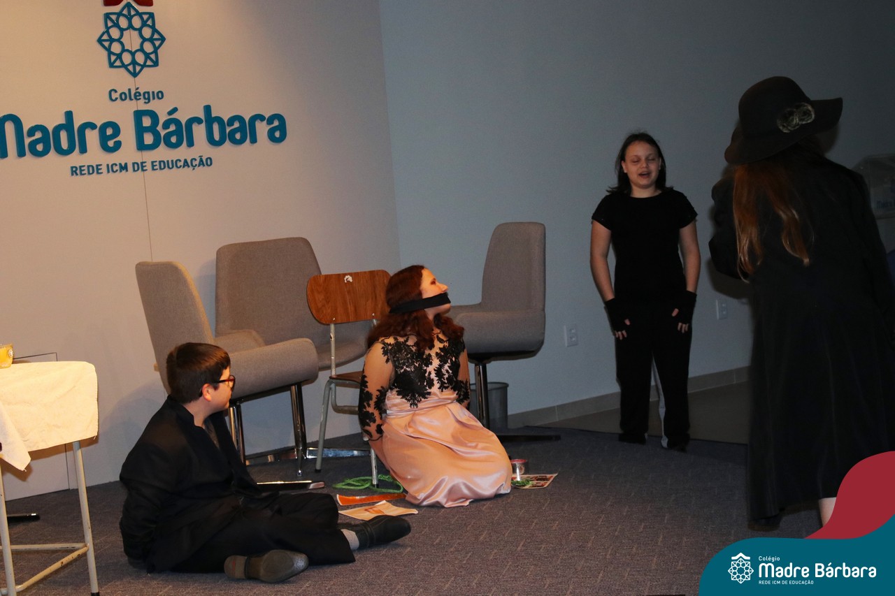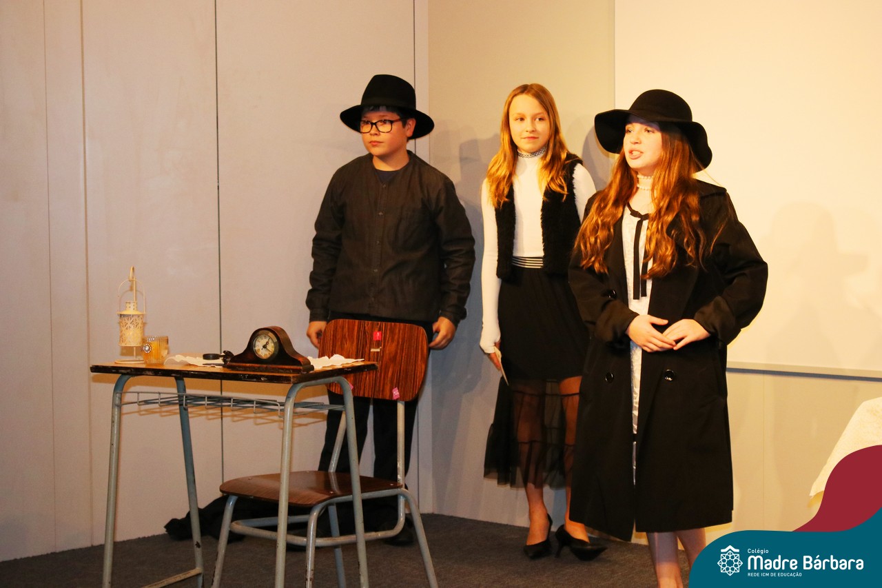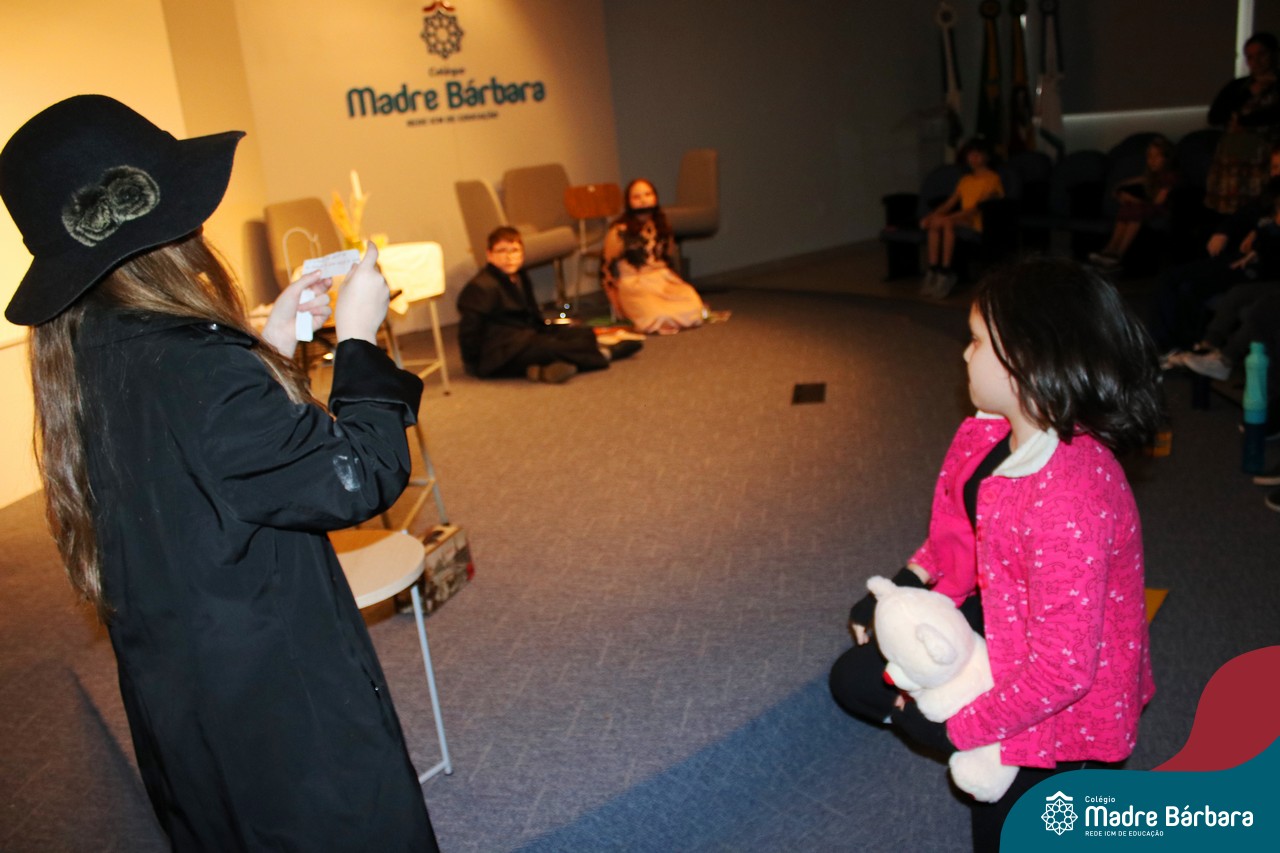 Os estudantes dos Anos Finais estão trabalhando o teatro e seus múltiplos olhares na disciplina de arte com a professora Cristiane Schneider. Trabalharam com a escrita de roteiro, atividade em grupo, além de figurinos e acessórios cênicos para apresentar frente aos colegas. Precisaram planejar o cenário, figurino, texto, maquiagem e todos os itens tinham que aparecer em cena. Na última semana, os estudantes dos 6ºs anos estiveram no miniauditório apresentando as peças teatrais de suas autorias.
