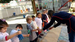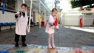 Na semana passada, o Nível 4B do turno da tarde, vivenciou uma técnica de pintura muito divertida, no projeto “Viajando pelo mundo da arte”. Este projeto, está possibilitando a exploração de diversas formas de expressão artística, então as professoras Fabiele e Bruna, propuseram uma técnica diferente utilizando luvas cirúrgicas. As luvas estavam cheias de tintas e foram amarradas em um varal, sendo que havia um furinho em cada luva. Então, as crianças apertavam as luvas e criavam formas e desenhos inusitados no papel disposto pelo chão. Foi uma situação muito divertida e que culminou em um lindo trabalho!