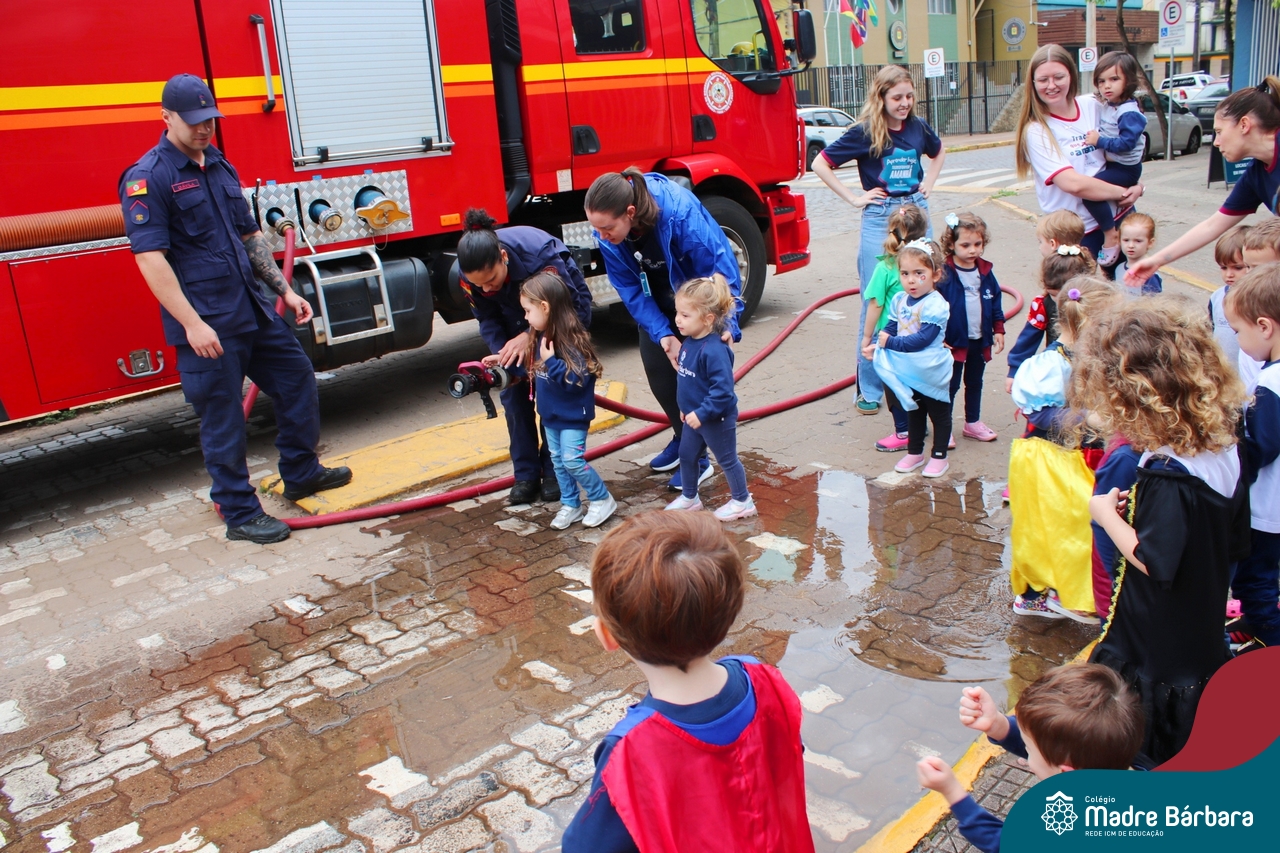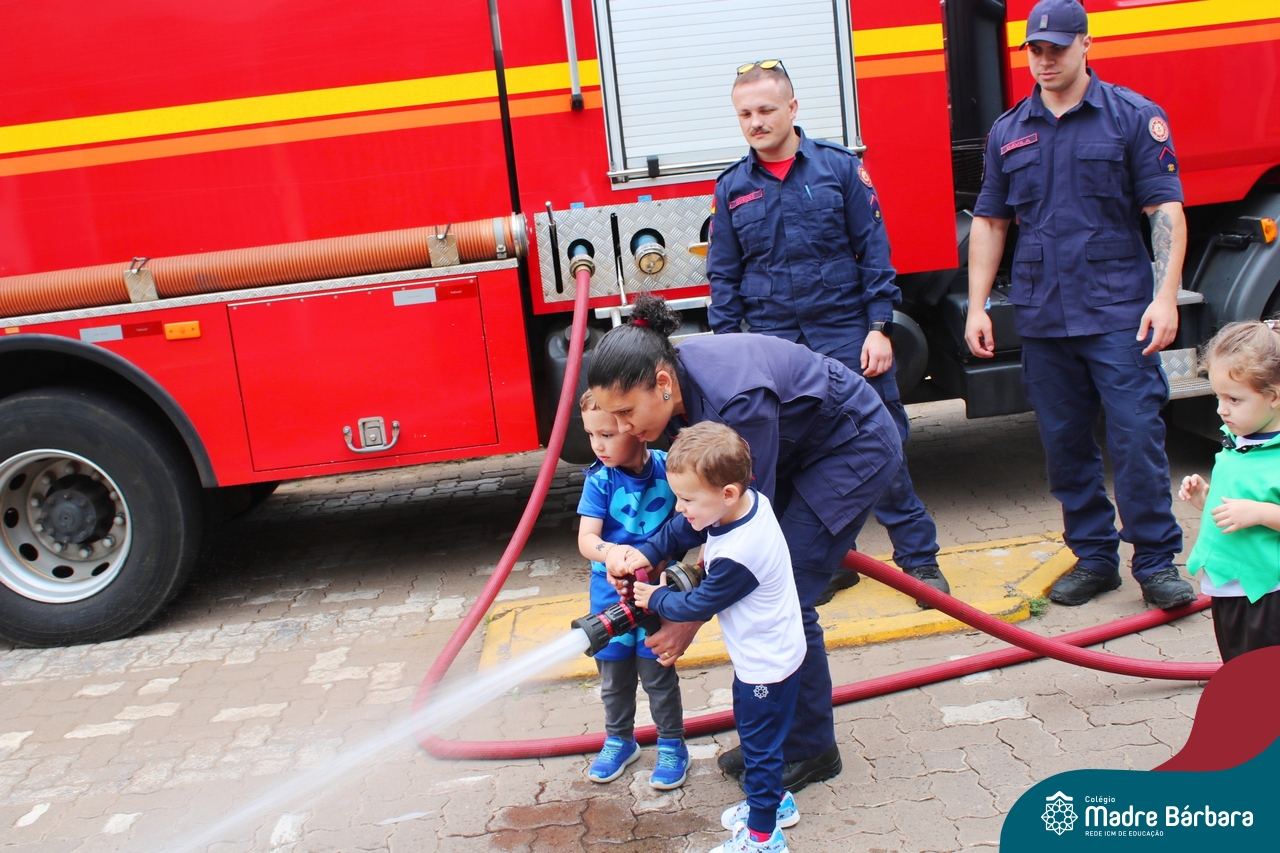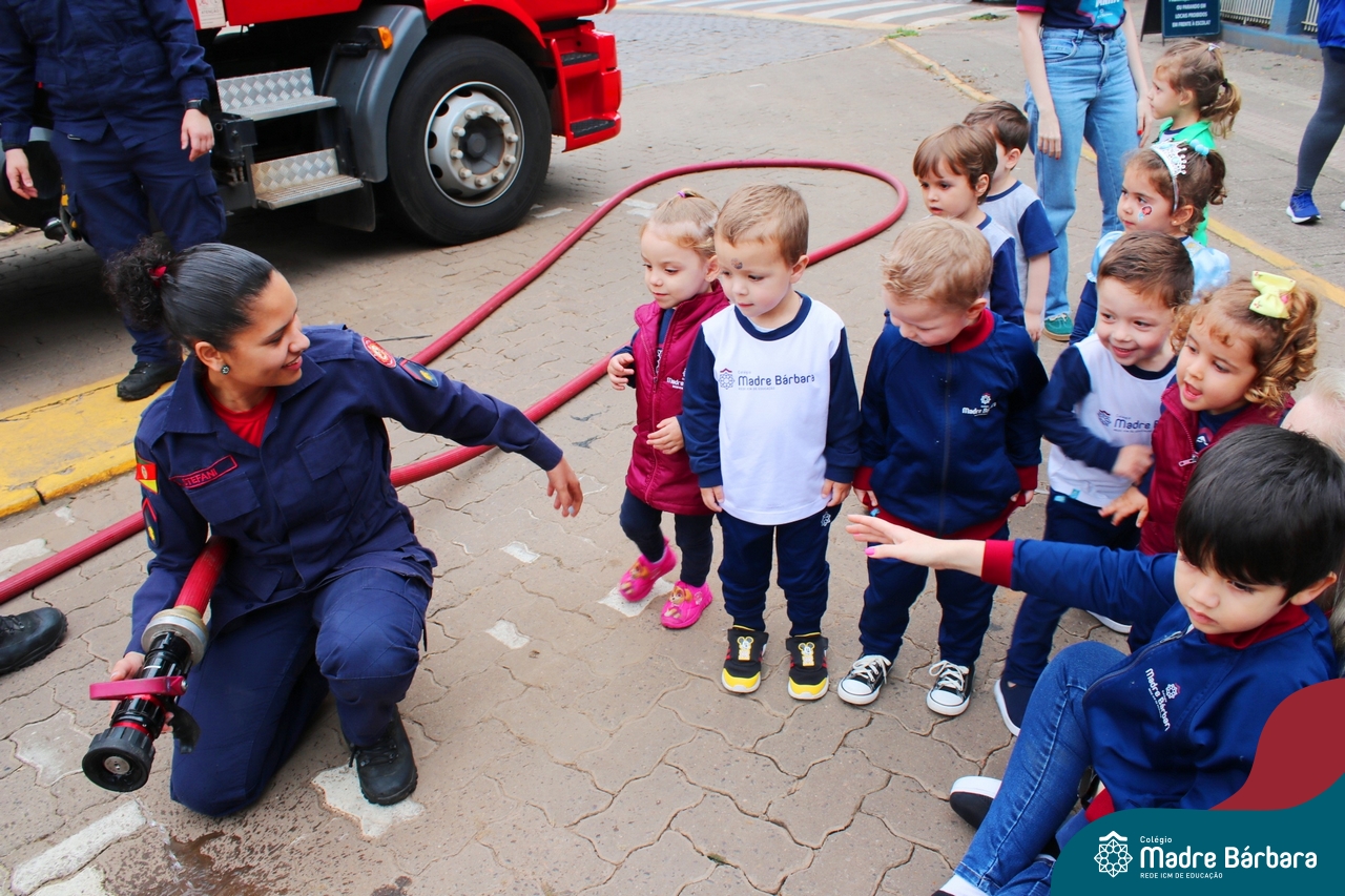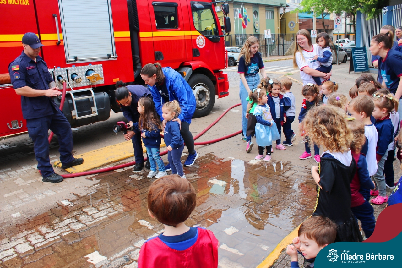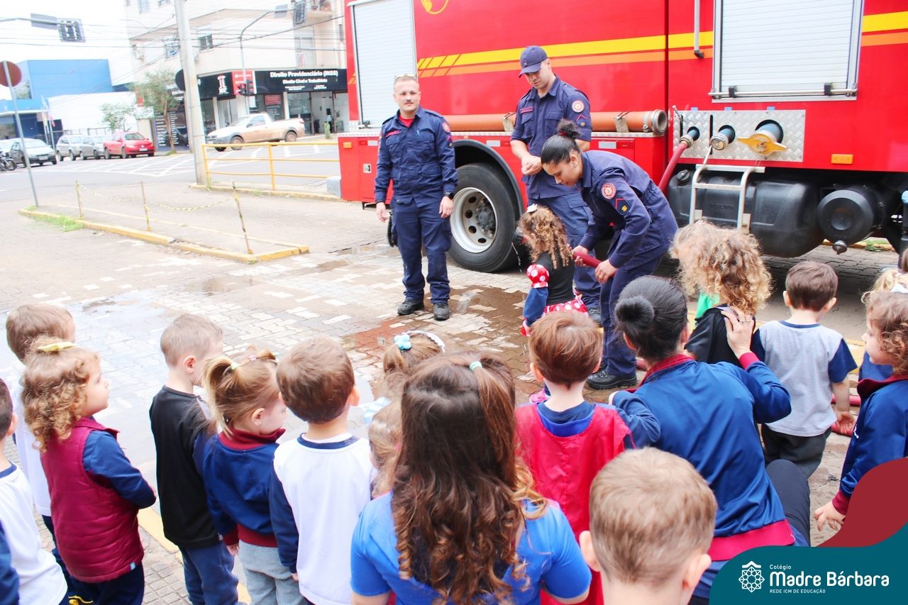 Nem todo super herói usa capa e tem super poderes! ✨ Hoje foi dia de heróis de verdade visitarem o nosso Colégio Madre Bárbara! Dentro do projeto que está em andamento no Nível 2A, intitulado “Temos uma missão! Quem vamos salvar?” surgiu o diálogo que os bombeiros também são super-heróis! A corporação de Lajeado prontamente atendeu o nosso convite e veio conversar com as crianças, mostrar os instrumentos utilizados, o caminhão e até como funciona a mangueira de água! Foi uma vivência muito especial, que enriqueceu ainda mais o nosso projeto! Agradecemos imensamente pela oportunidade deste encontro! Os Níveis 2 da manhã também participaram do momento especial.