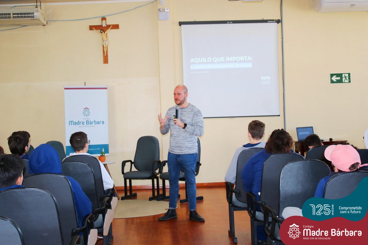 Na manhã desta sexta-feira (12/08), as turmas dos terceiros anos do Ensino Médio, receberam a visita do Diretor acadêmico da ESPM, Rene Gollnei, juntamente do professor Marcelo Cordeiro, Franciele Mello e Janice Penadez. Na oportunidade os alunos puderam dialogar sobre o processo de “Escolhas e Decisões”.