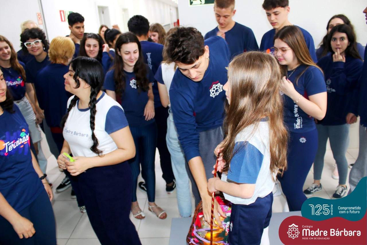 Nesta manhã, 11 de dezembro de 2022, os alunos dos 3°anos do Ensino Médio foram surpeendidos por representações dos seus afilhados do Projeto Laços Afetivos, no qual prepararam uma linda canção, e emocionaram seus dindos.
