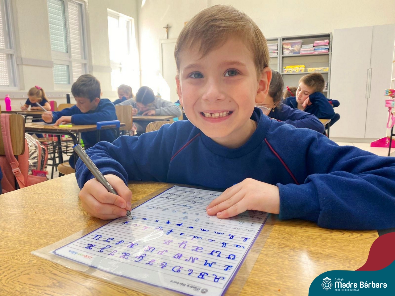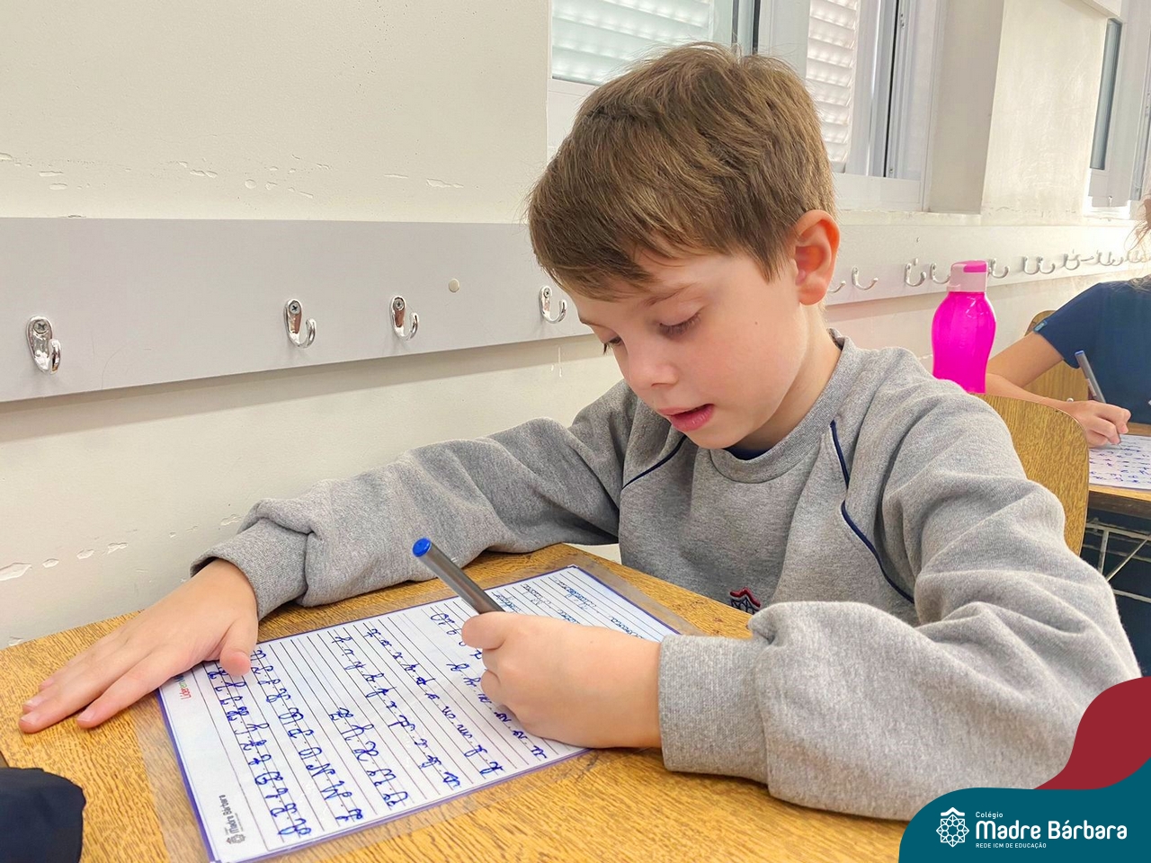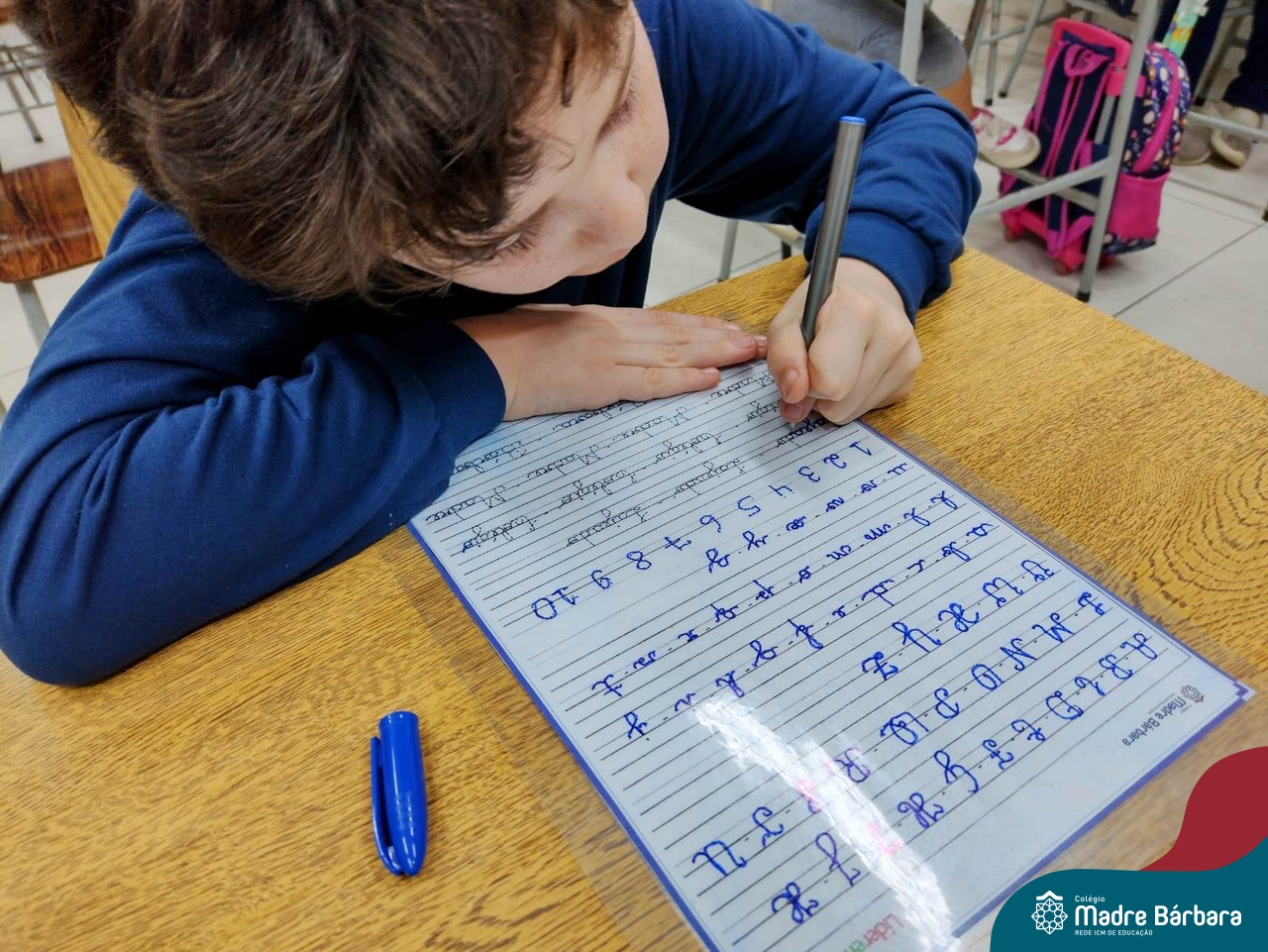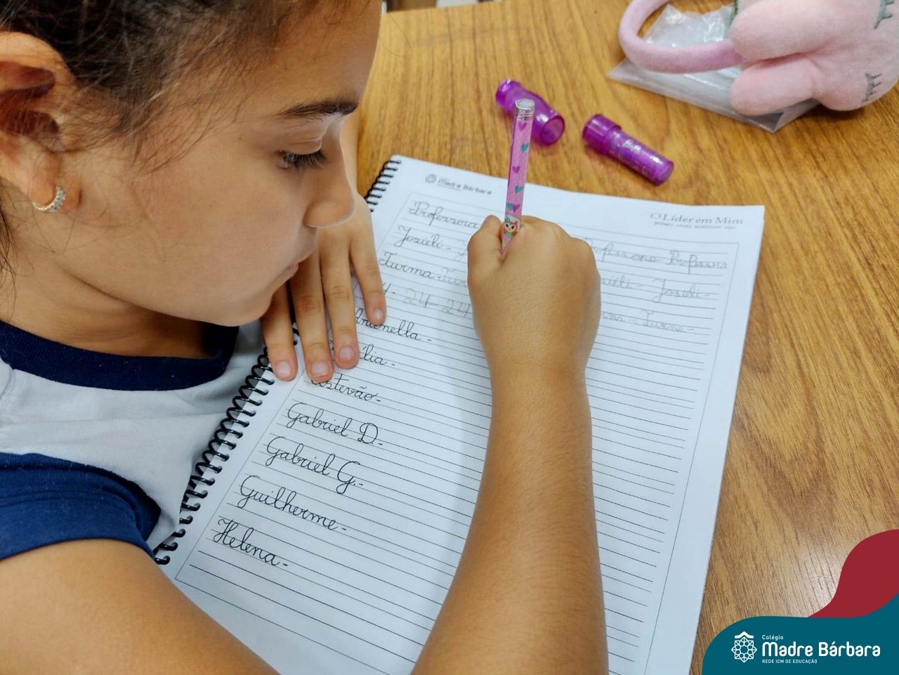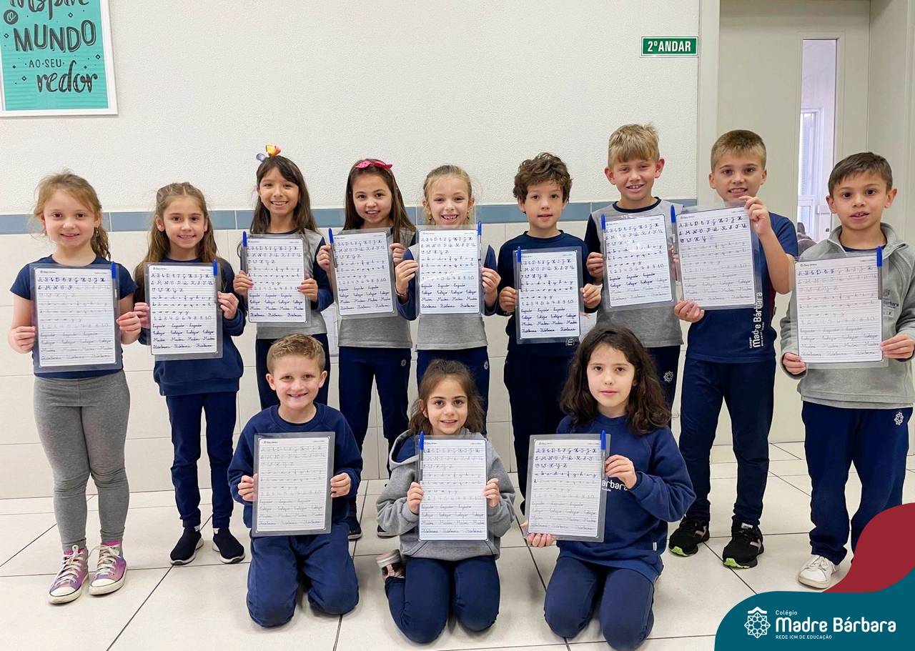 Os alunos dos 2ºs anos do Ensino Fundamental – Anos Iniciais do Colégio Madre Bárbara – Rede ICM, juntamente com suas professoras Bruna, Caroline, Mara, Josiéli e Marina estão desenvolvendo o treino do traçado da letra cursiva. Com o intuito de deixar este movimento ainda mais prático e divertido, os alunos realizaram algumas atividades como:
