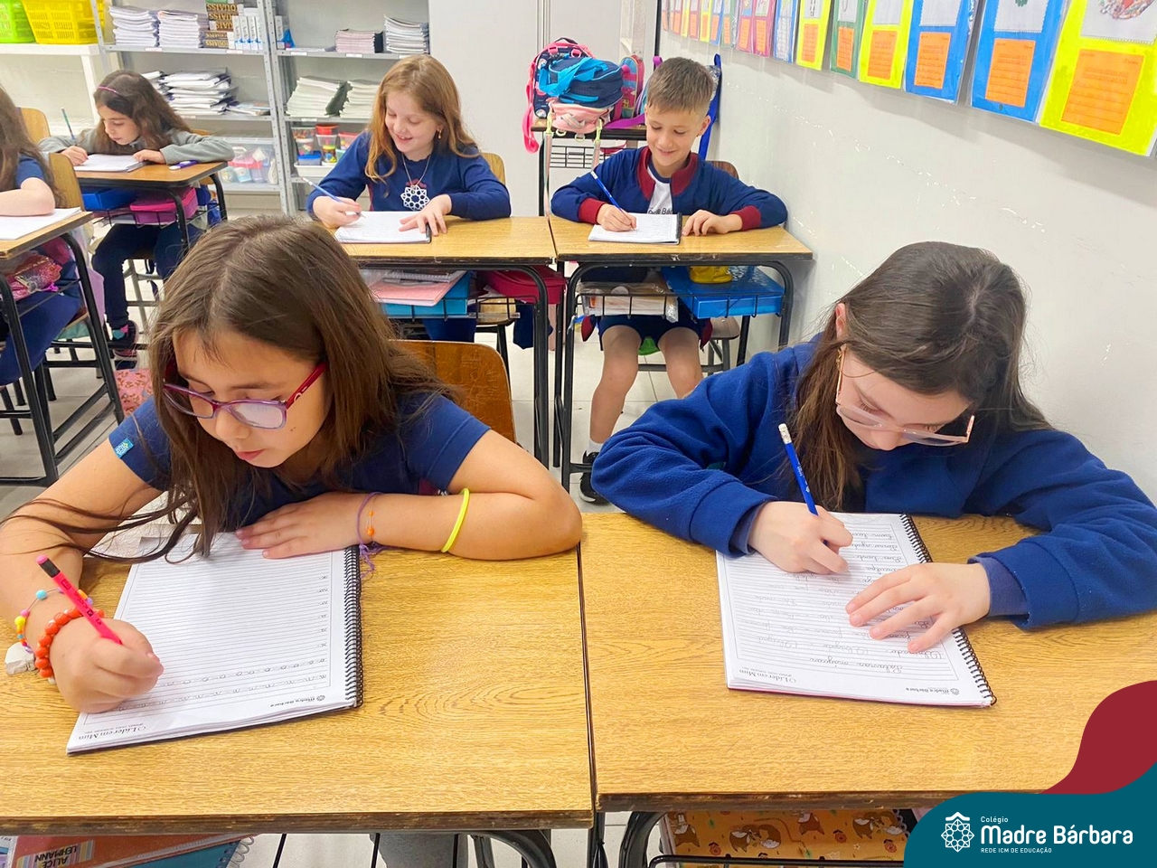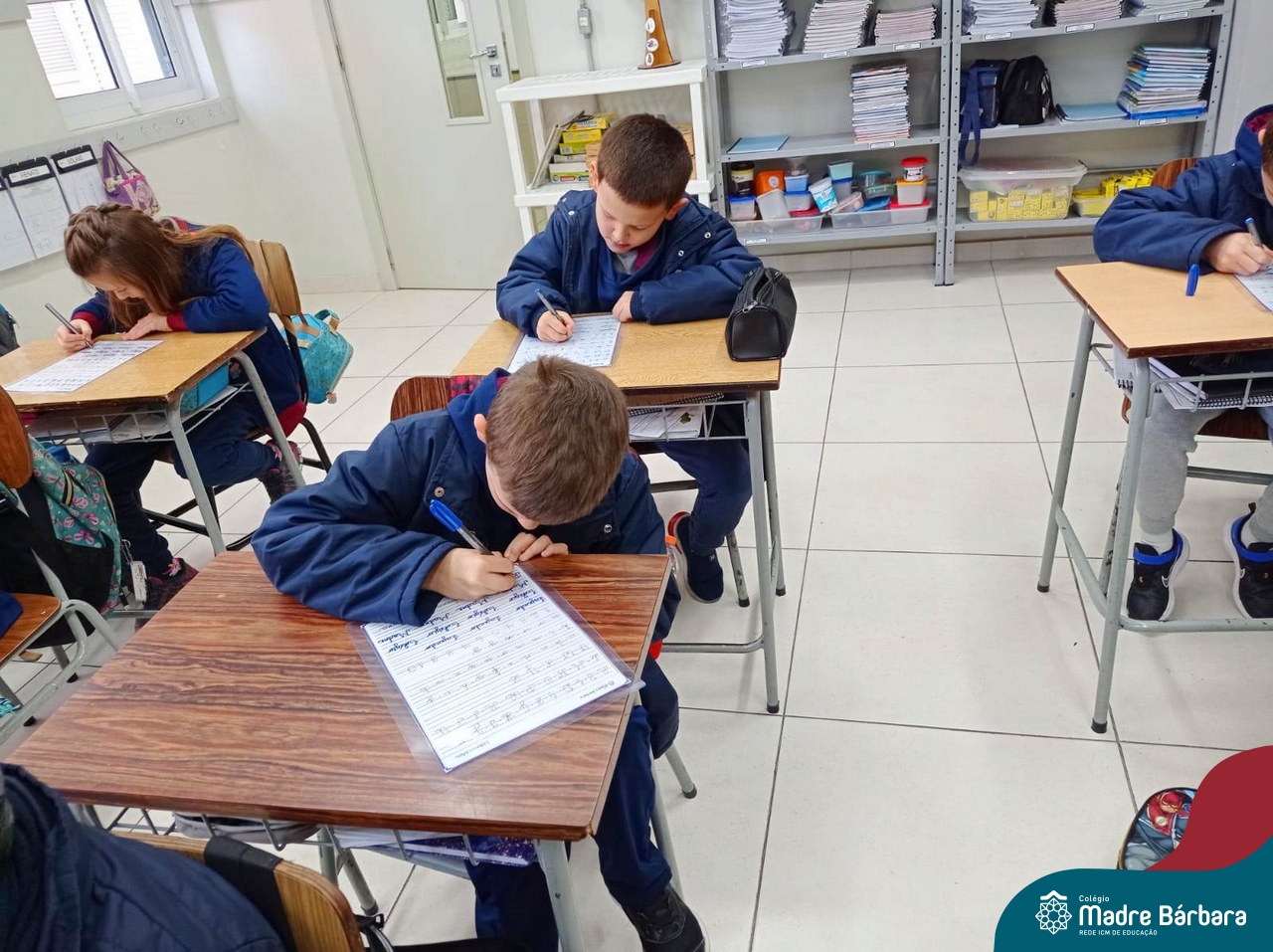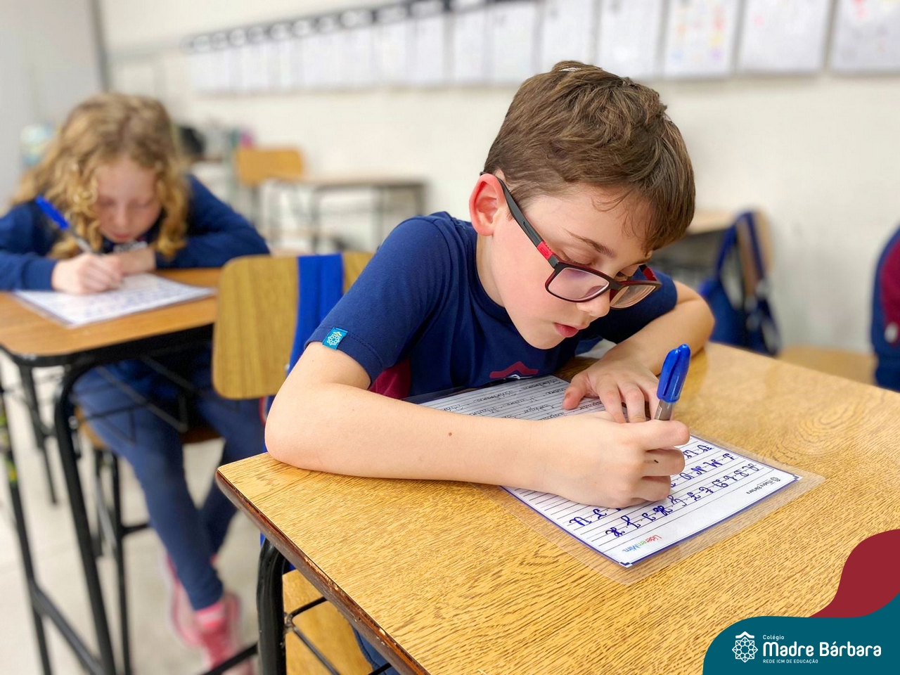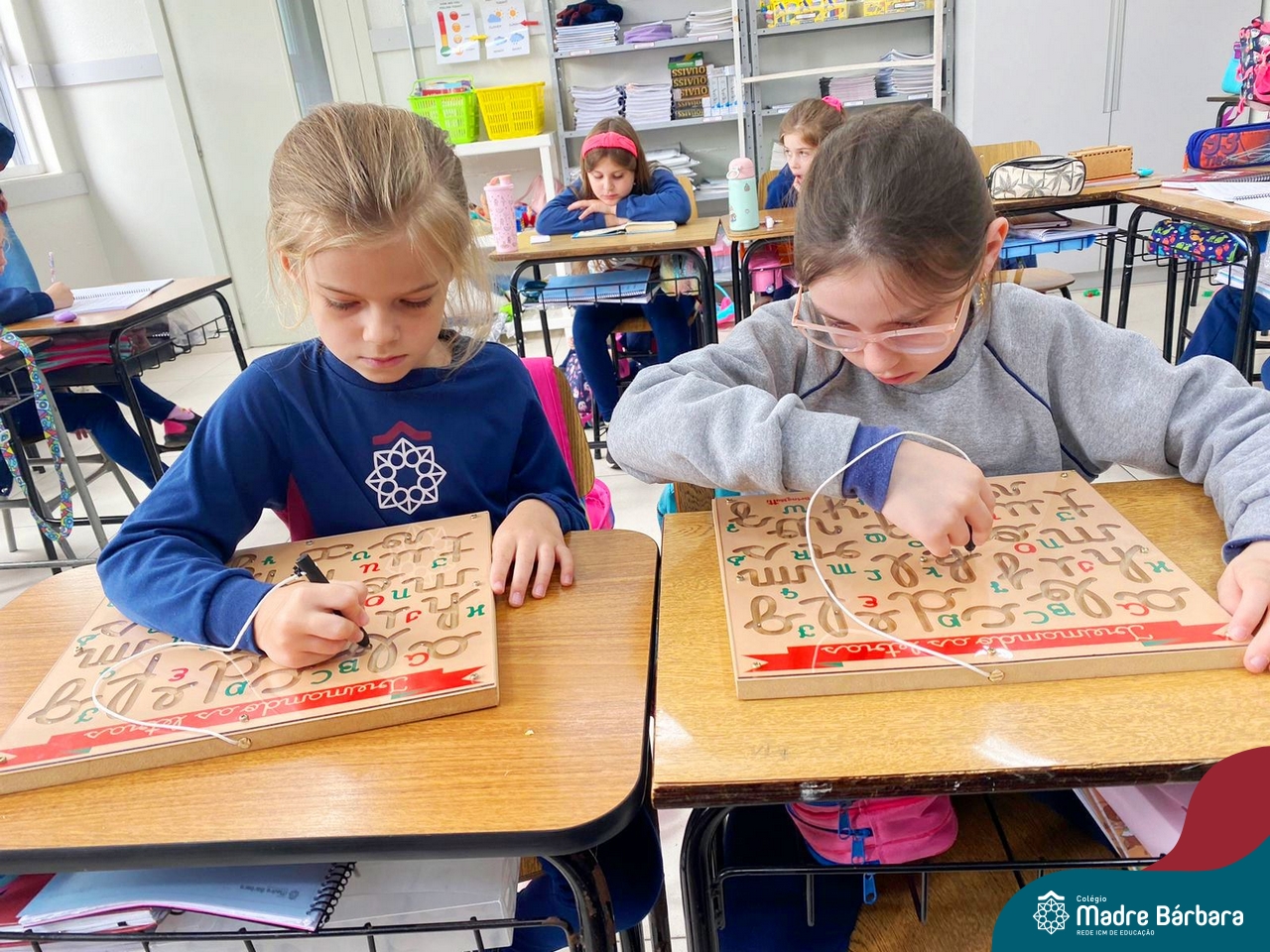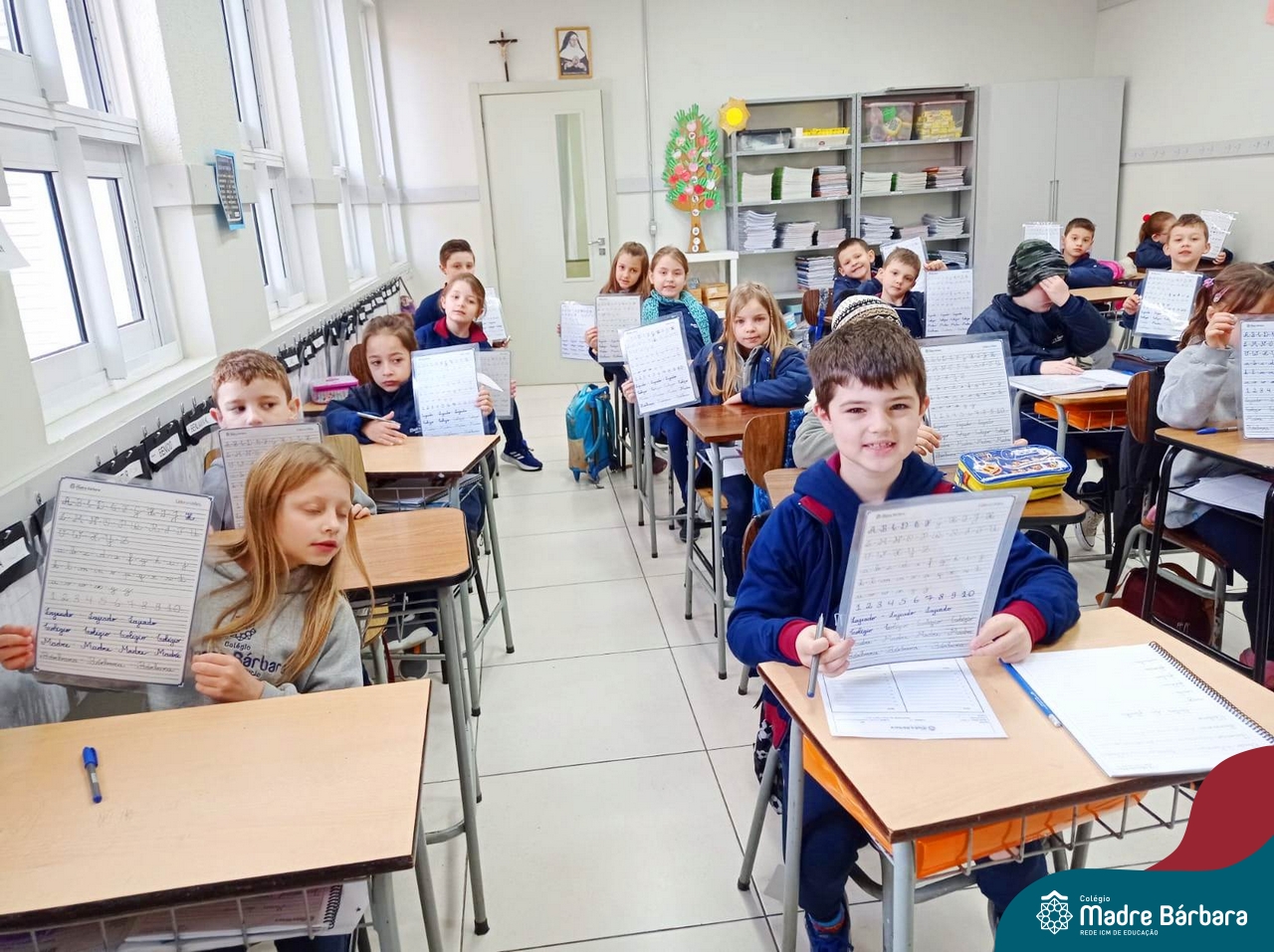 Os alunos dos 2ºs anos do Ensino Fundamental – Anos Iniciais do Colégio Madre Bárbara – Rede ICM, juntamente com suas professoras Bruna, Caroline, Mara, Josiéli e Marina estão desenvolvendo o treino do traçado da letra cursiva. Com o intuito de deixar este movimento ainda mais prático e divertido, os alunos realizaram algumas atividades como: