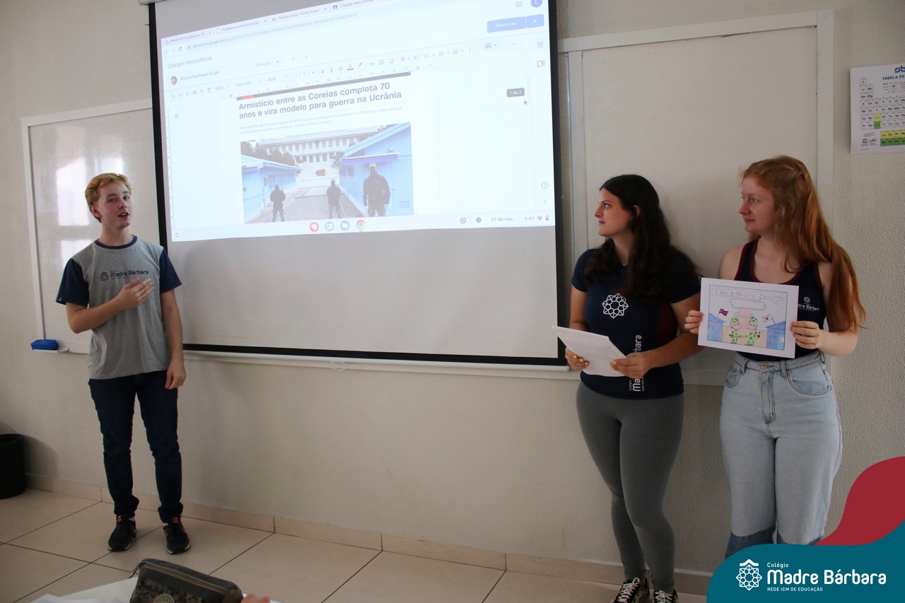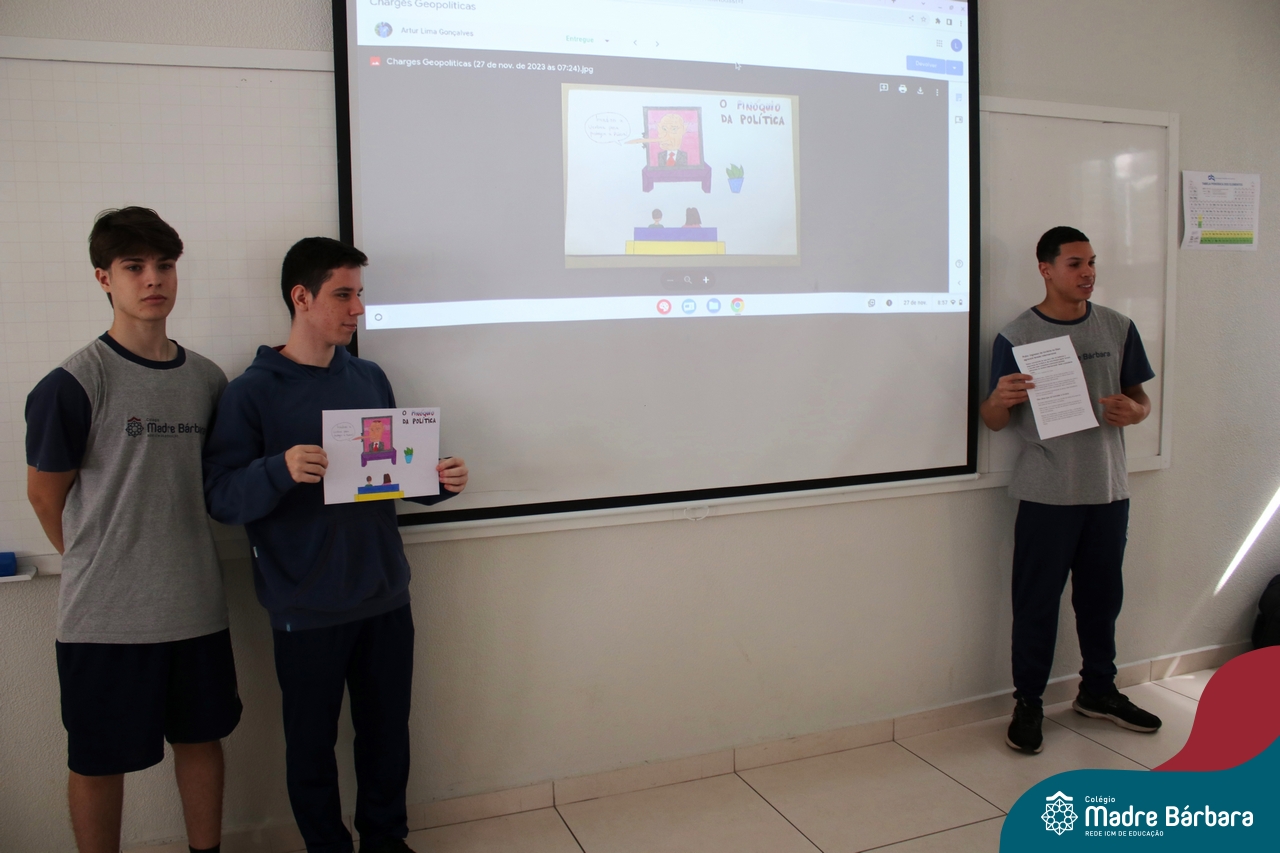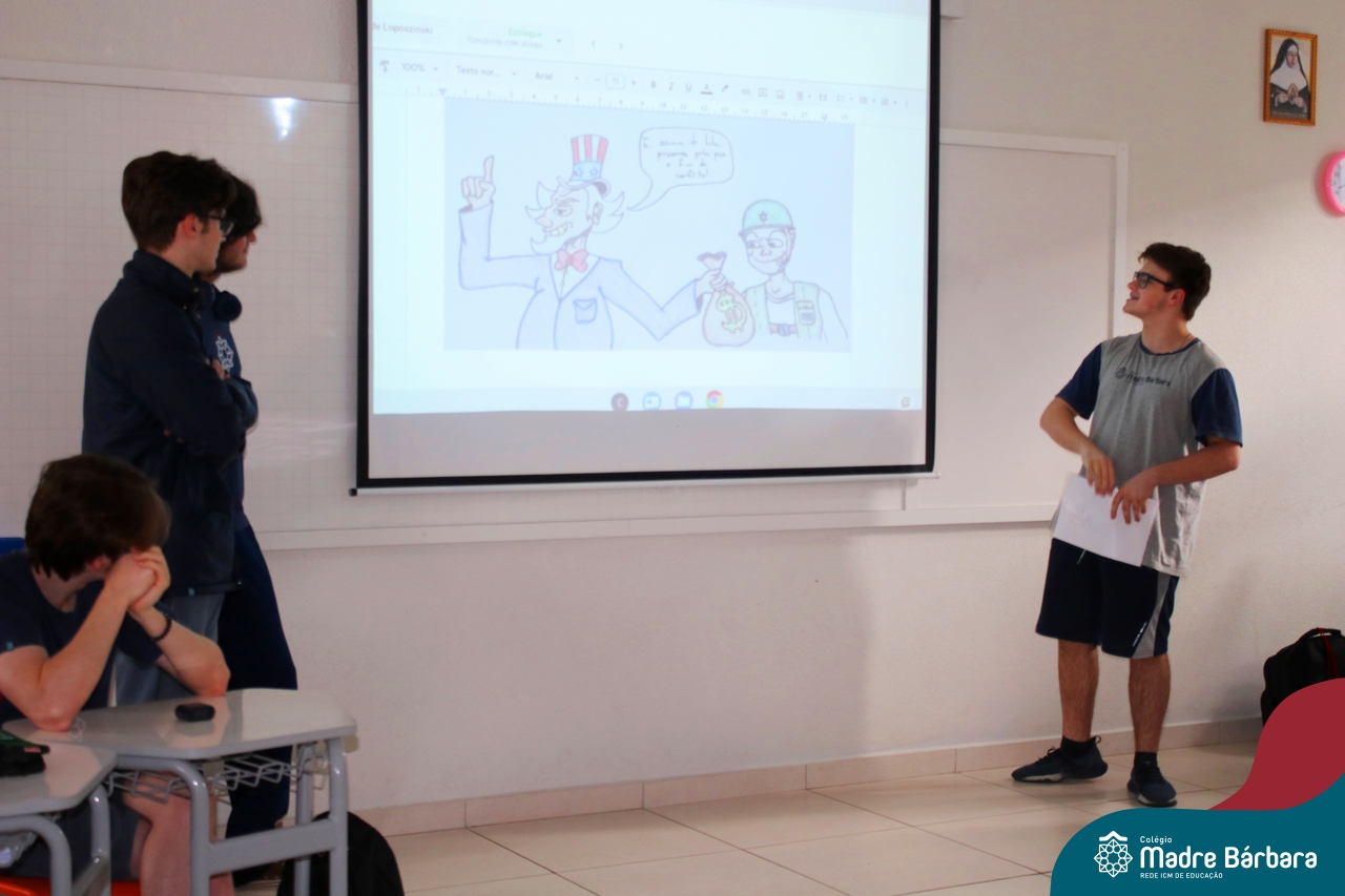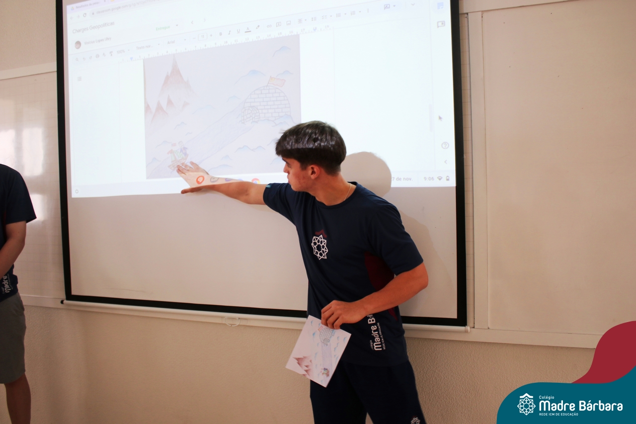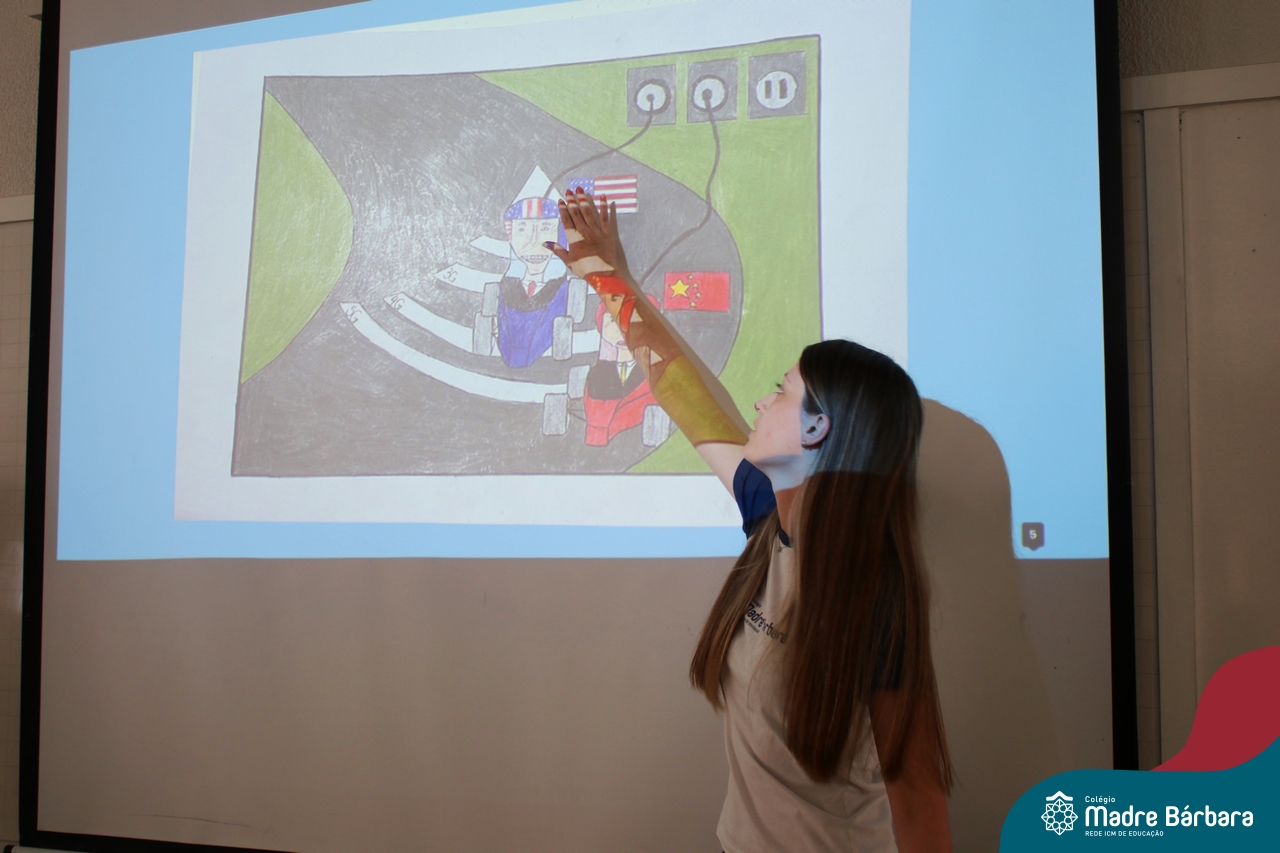 Durante as duas últimas semanas, os estudantes dos segundos anos do Novo Ensino Médio foram desafiados a criarem charges, a partir de uma notícia veiculada em veículos jornalísticos renomados. As mesmas deveriam conter elementos típicos desta forma de linguagem: tons críticos ou satíricos ligados a algum acontecimento narrado no campo jornalístico, desenvolvidos na aula de Língua Portuguesa, ministrada pela professora Francieli Winck. Os conteúdos desenvolvidos relacionaram-se à temática de conflitos, tensões e disputas internacionais, ministrados, ao longo do ano, pelo professor Lucas Schneider, da disciplina de Núcleo de Estudos em Geopolítica.