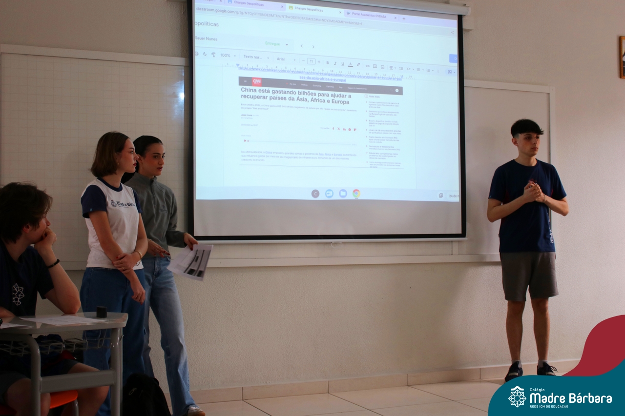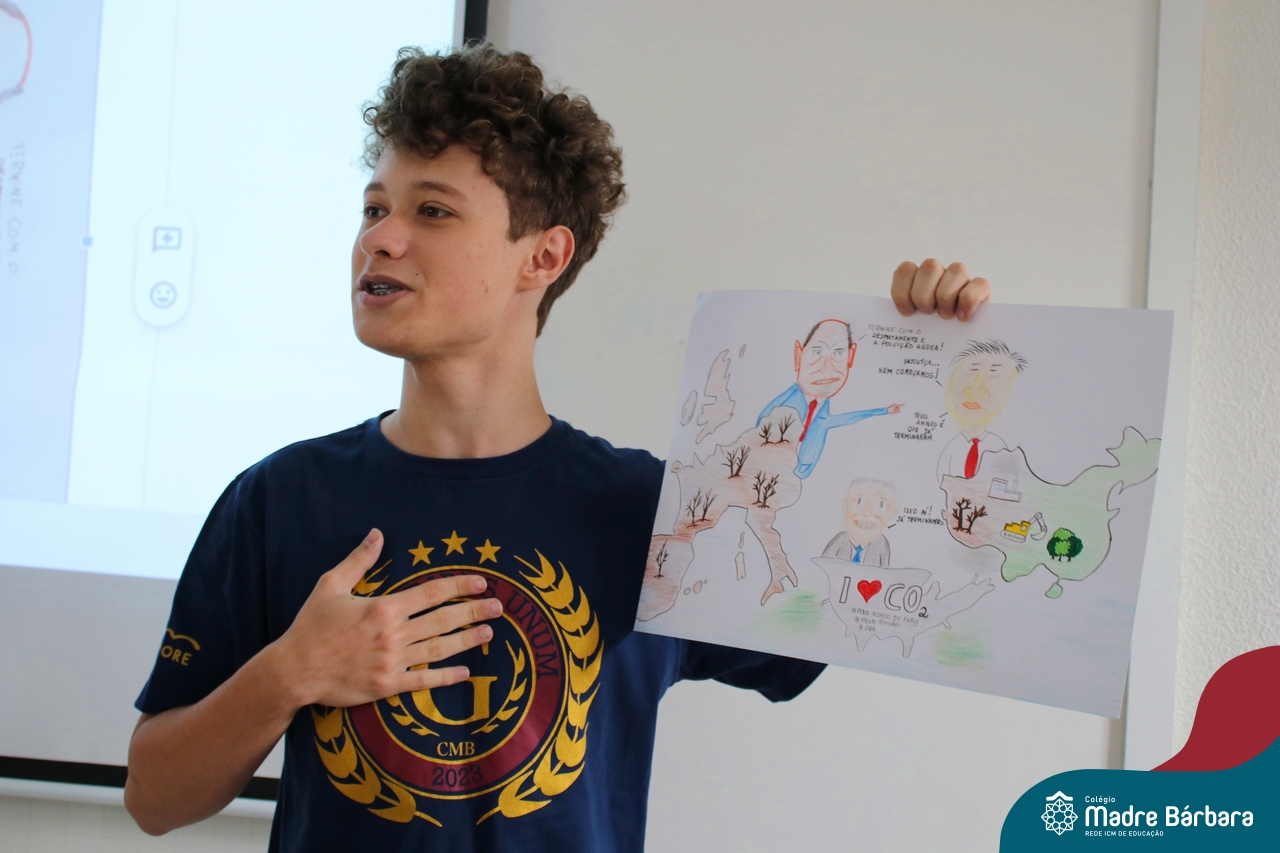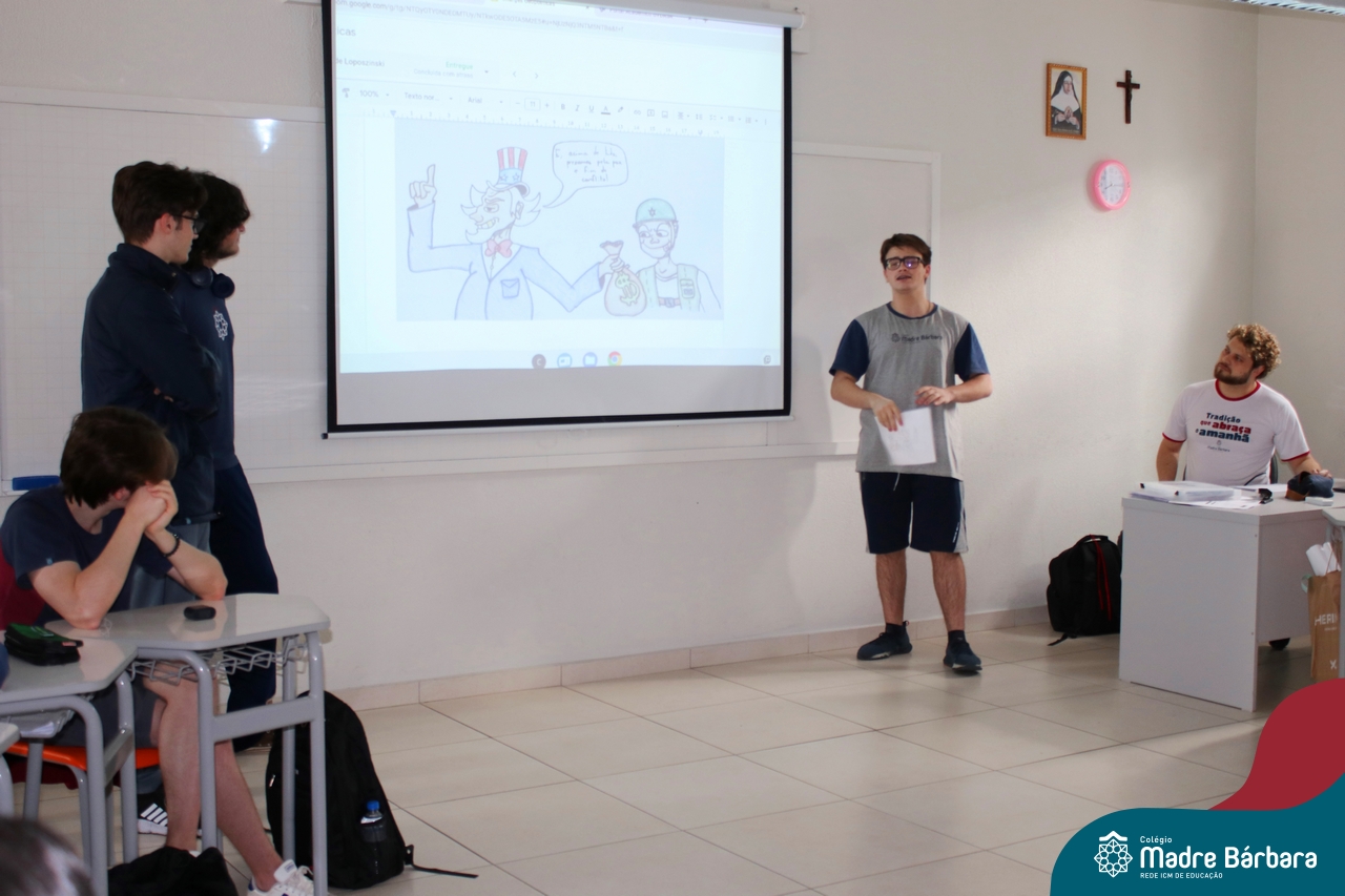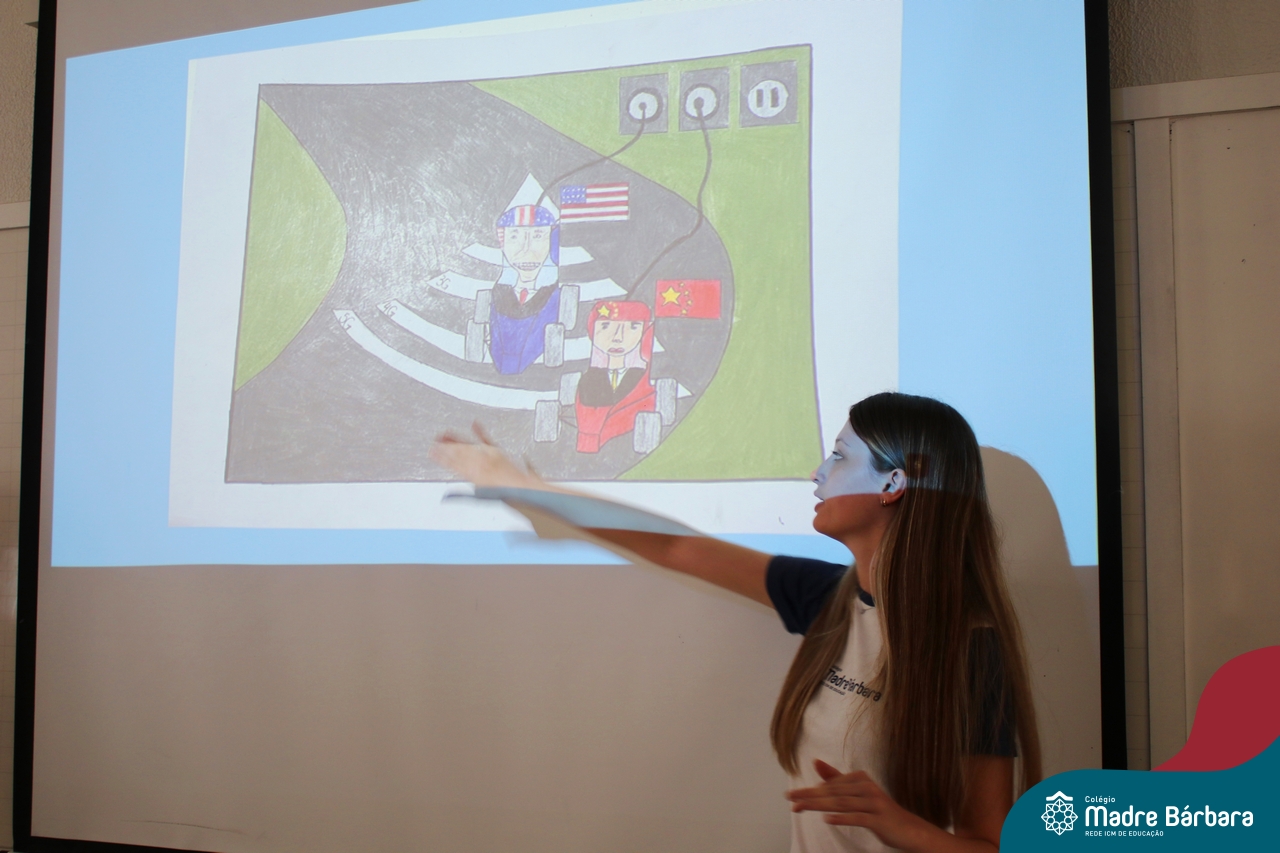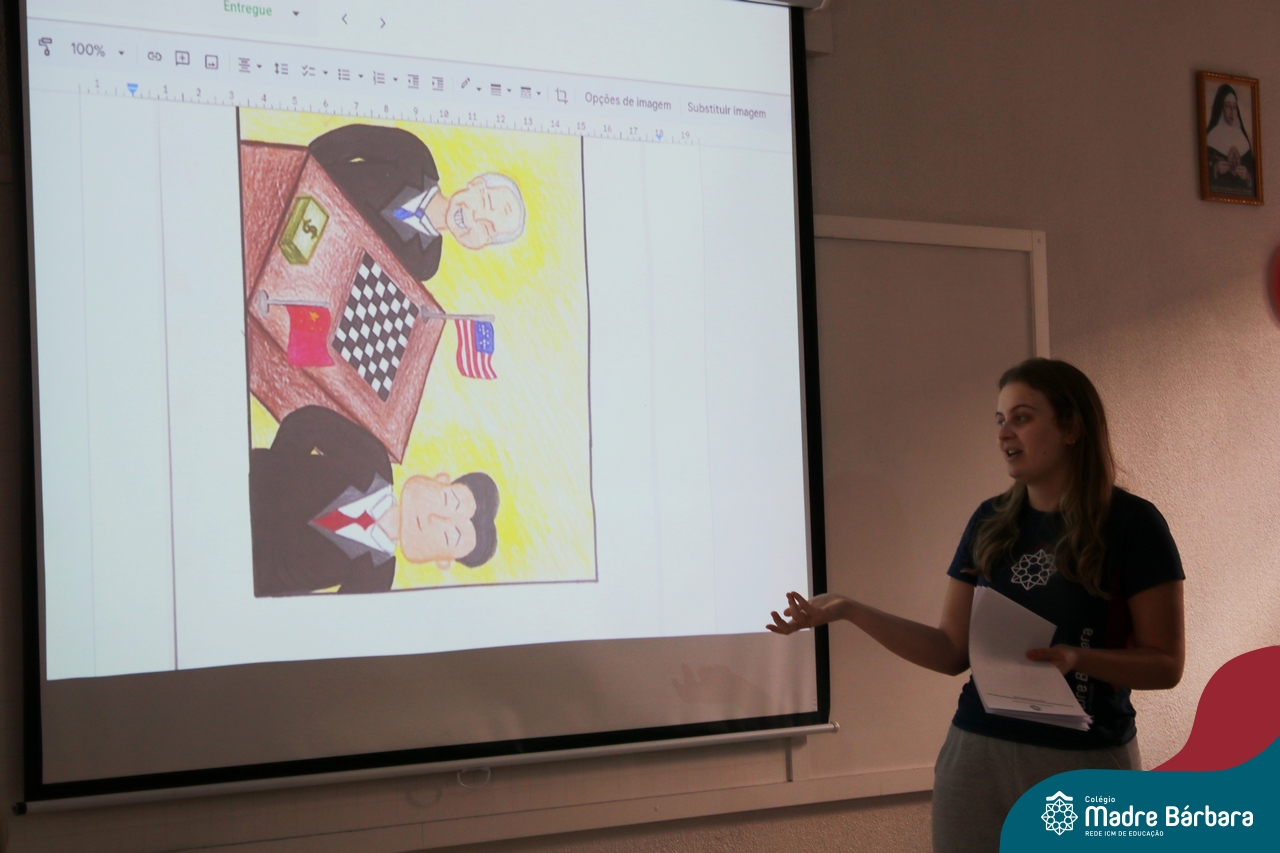 Durante as duas últimas semanas, os estudantes dos segundos anos do Novo Ensino Médio foram desafiados a criarem charges, a partir de uma notícia veiculada em veículos jornalísticos renomados. As mesmas deveriam conter elementos típicos desta forma de linguagem: tons críticos ou satíricos ligados a algum acontecimento narrado no campo jornalístico, desenvolvidos na aula de Língua Portuguesa, ministrada pela professora Francieli Winck. Os conteúdos desenvolvidos relacionaram-se à temática de conflitos, tensões e disputas internacionais, ministrados, ao longo do ano, pelo professor Lucas Schneider, da disciplina de Núcleo de Estudos em Geopolítica.