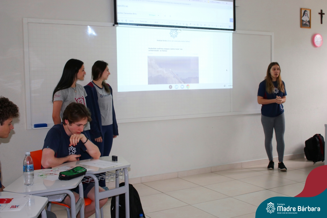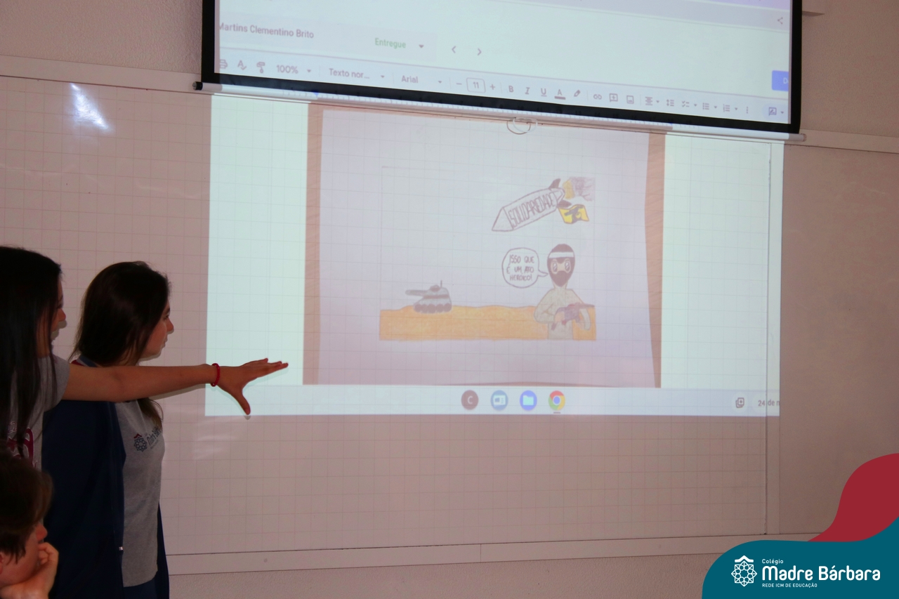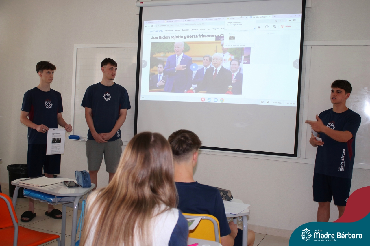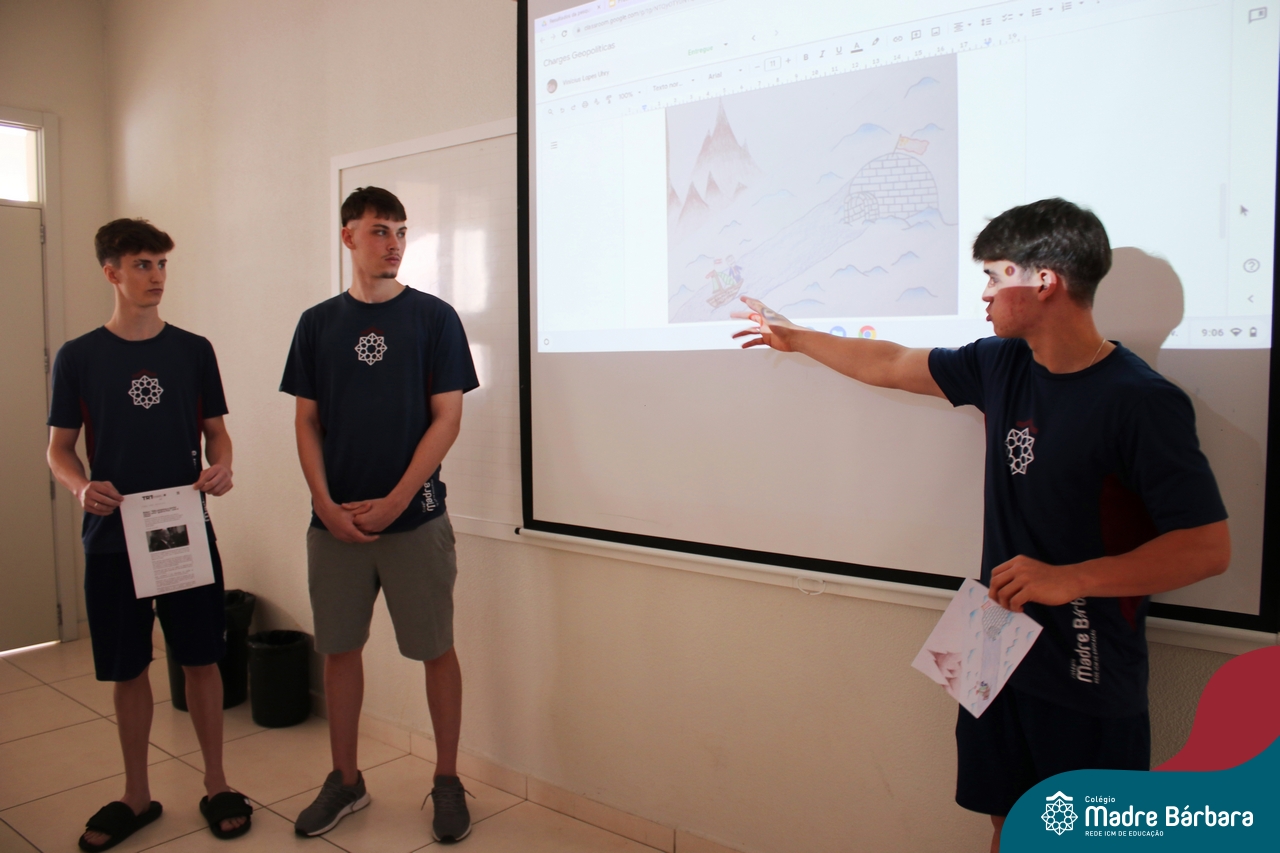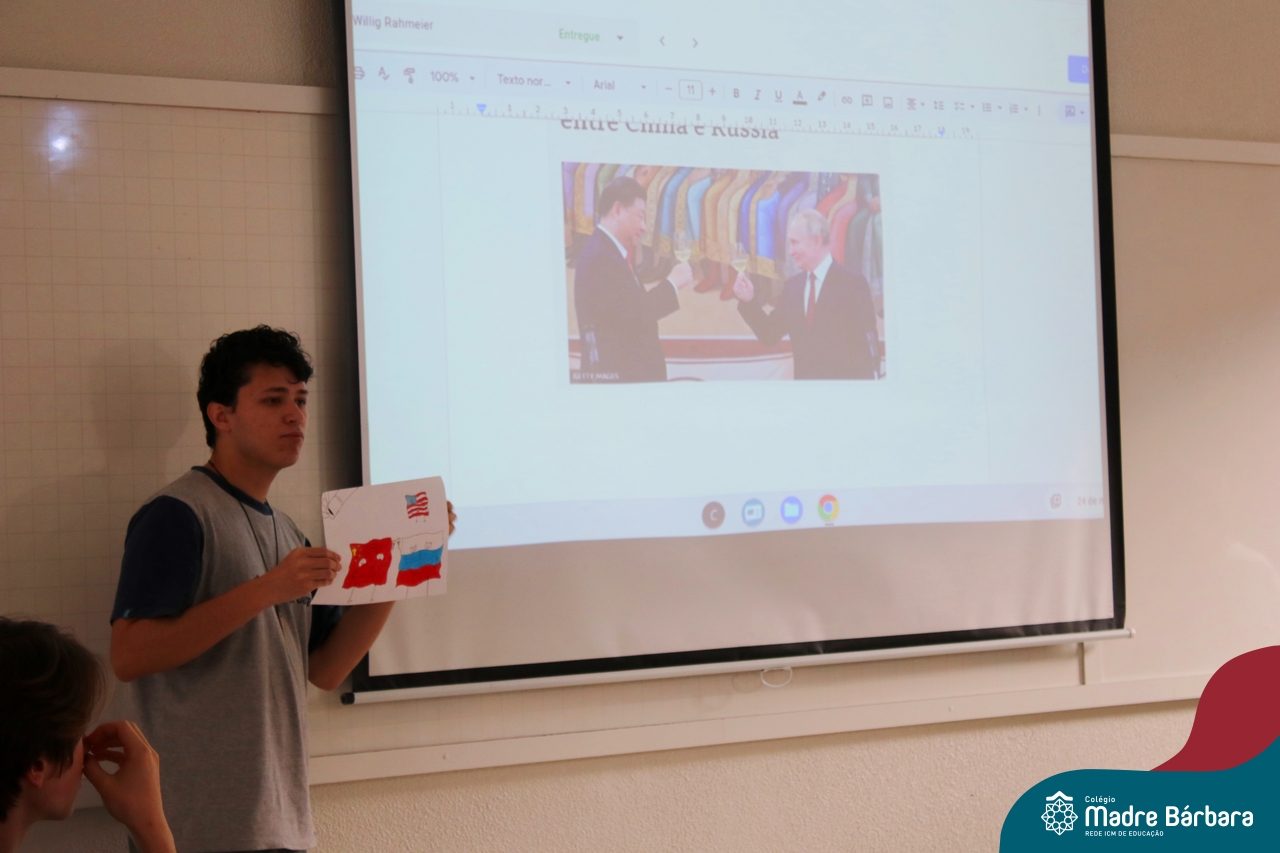 Durante as duas últimas semanas, os estudantes dos segundos anos do Novo Ensino Médio foram desafiados a criarem charges, a partir de uma notícia veiculada em veículos jornalísticos renomados. As mesmas deveriam conter elementos típicos desta forma de linguagem: tons críticos ou satíricos ligados a algum acontecimento narrado no campo jornalístico, desenvolvidos na aula de Língua Portuguesa, ministrada pela professora Francieli Winck. Os conteúdos desenvolvidos relacionaram-se à temática de conflitos, tensões e disputas internacionais, ministrados, ao longo do ano, pelo professor Lucas Schneider, da disciplina de Núcleo de Estudos em Geopolítica.