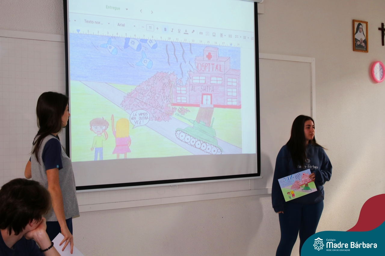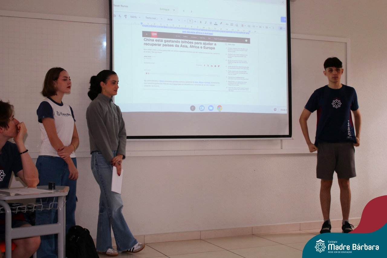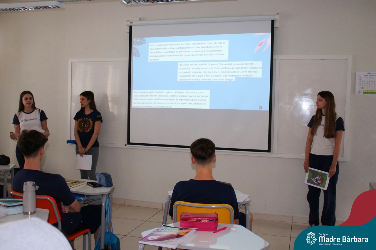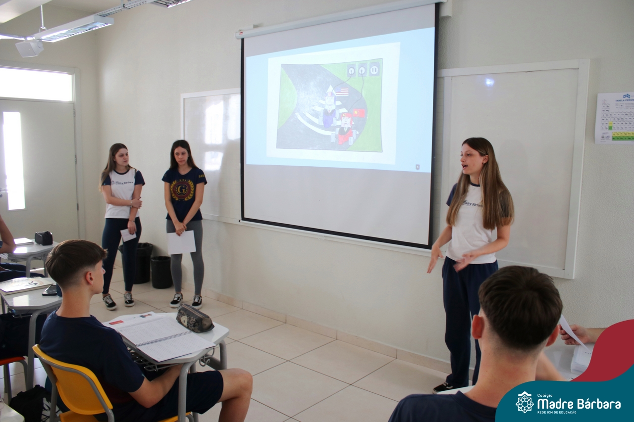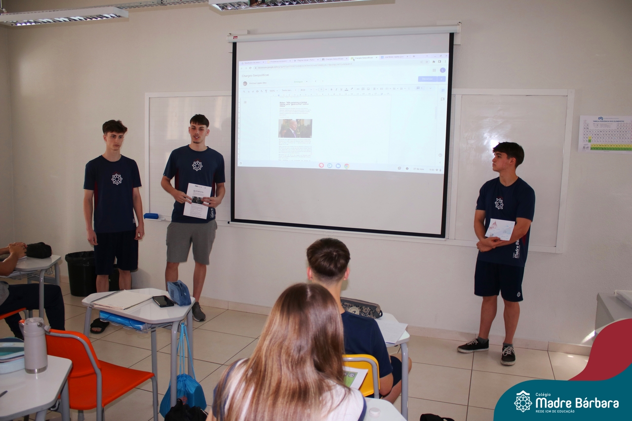 Durante as duas últimas semanas, os estudantes dos segundos anos do Novo Ensino Médio foram desafiados a criarem charges, a partir de uma notícia veiculada em veículos jornalísticos renomados. As mesmas deveriam conter elementos típicos desta forma de linguagem: tons críticos ou satíricos ligados a algum acontecimento narrado no campo jornalístico, desenvolvidos na aula de Língua Portuguesa, ministrada pela professora Francieli Winck. Os conteúdos desenvolvidos relacionaram-se à temática de conflitos, tensões e disputas internacionais, ministrados, ao longo do ano, pelo professor Lucas Schneider, da disciplina de Núcleo de Estudos em Geopolítica.