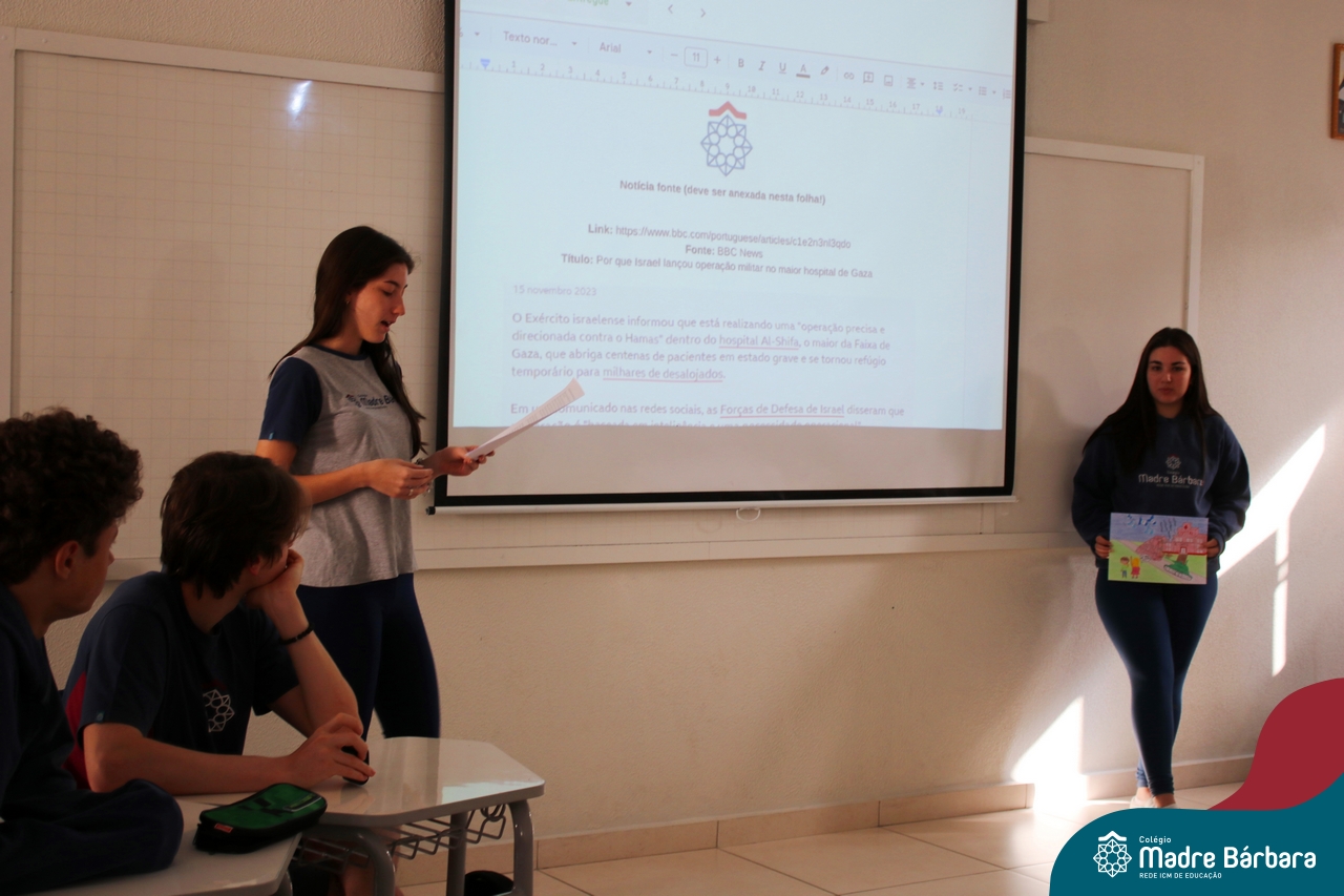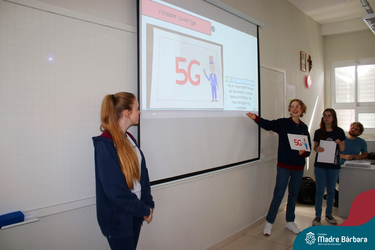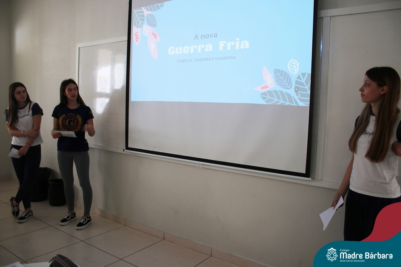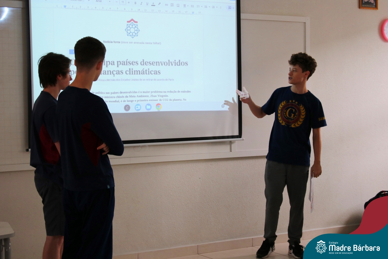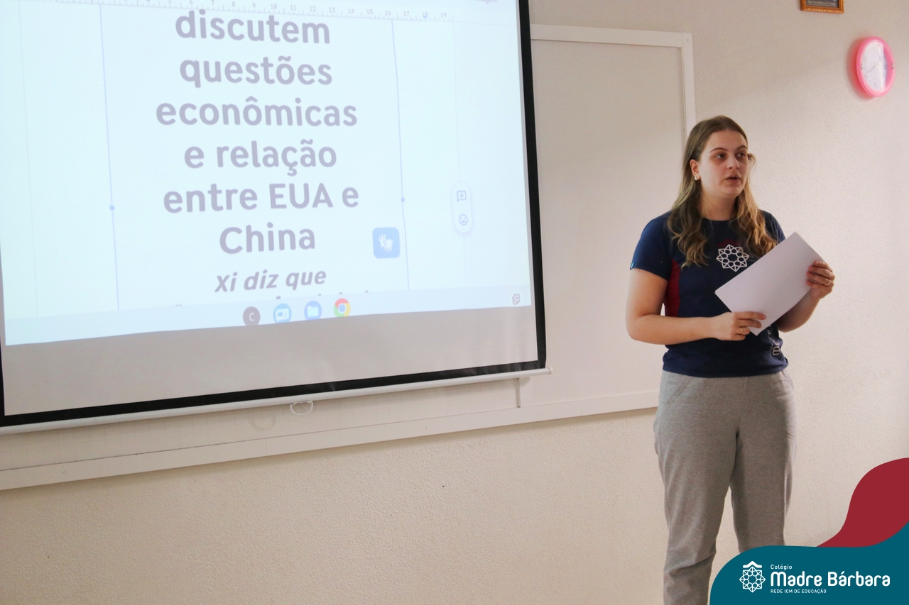 Durante as duas últimas semanas, os estudantes dos segundos anos do Novo Ensino Médio foram desafiados a criarem charges, a partir de uma notícia veiculada em veículos jornalísticos renomados. As mesmas deveriam conter elementos típicos desta forma de linguagem: tons críticos ou satíricos ligados a algum acontecimento narrado no campo jornalístico, desenvolvidos na aula de Língua Portuguesa, ministrada pela professora Francieli Winck. Os conteúdos desenvolvidos relacionaram-se à temática de conflitos, tensões e disputas internacionais, ministrados, ao longo do ano, pelo professor Lucas Schneider, da disciplina de Núcleo de Estudos em Geopolítica.