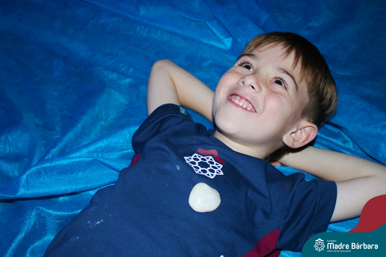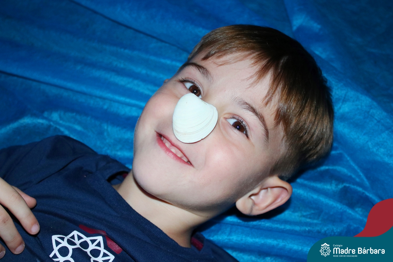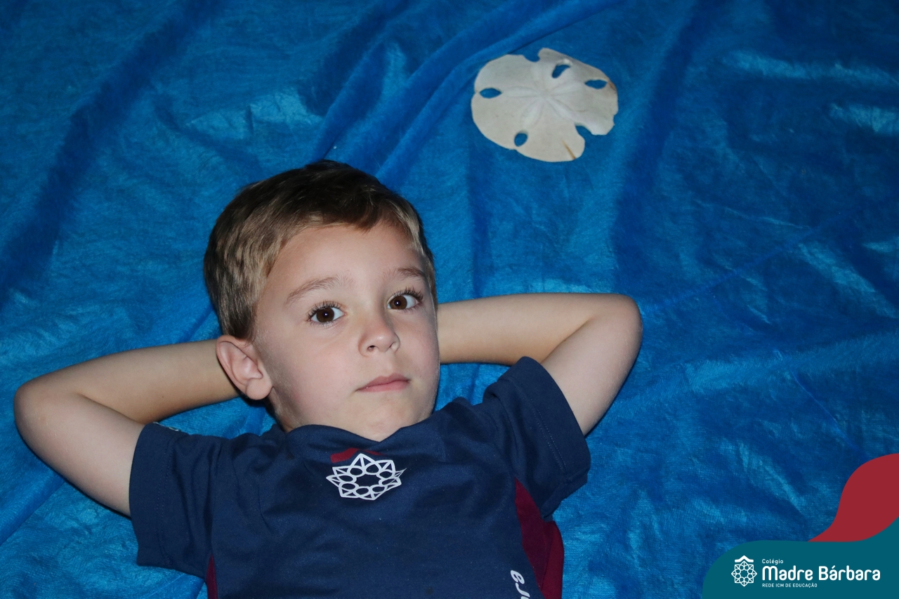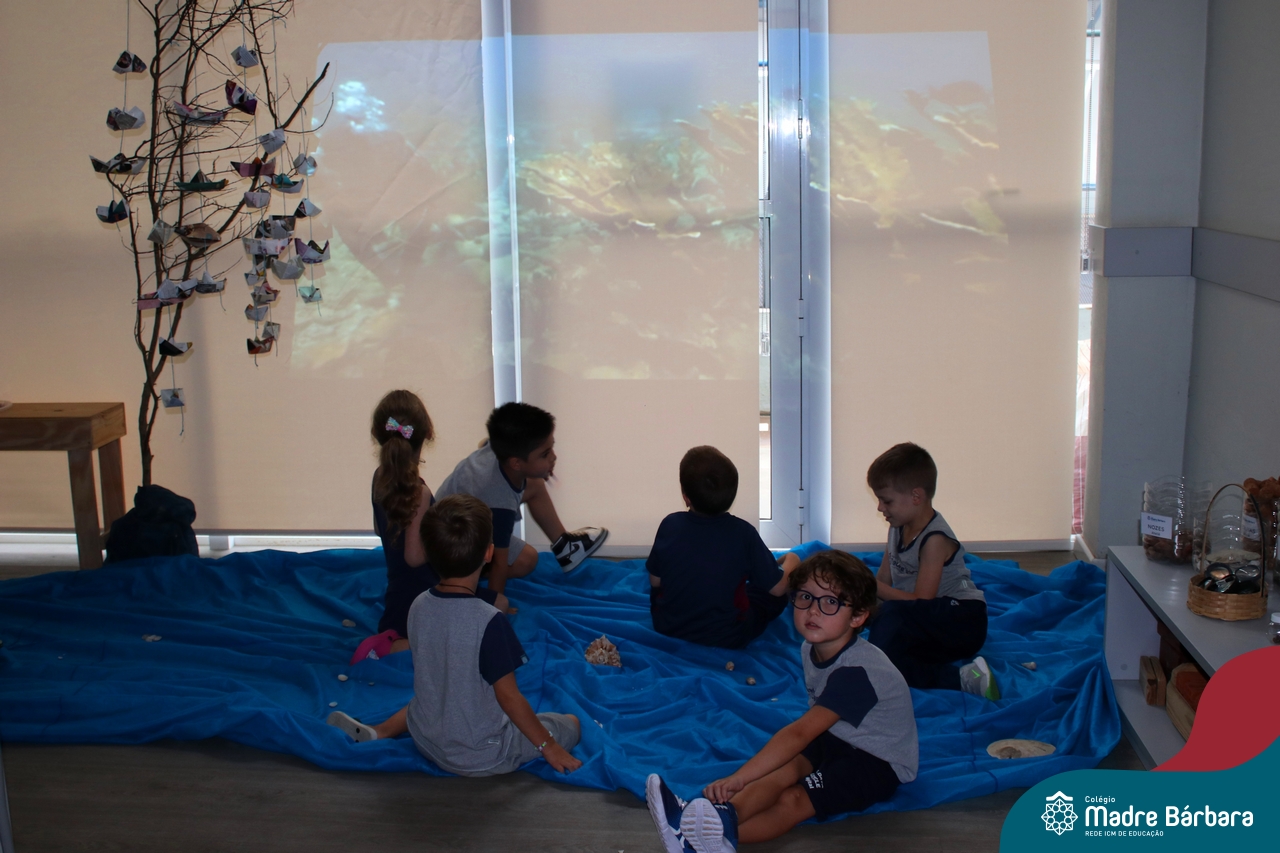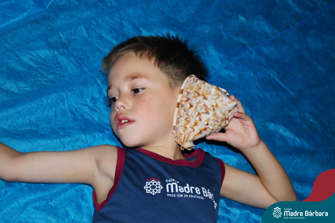 As crianças do Nível 5D foram convidadas a experienciar, sentir e ouvir os encantos do mar a partir do interesse que surgiu após algumas vivências do projeto de acolhida.
